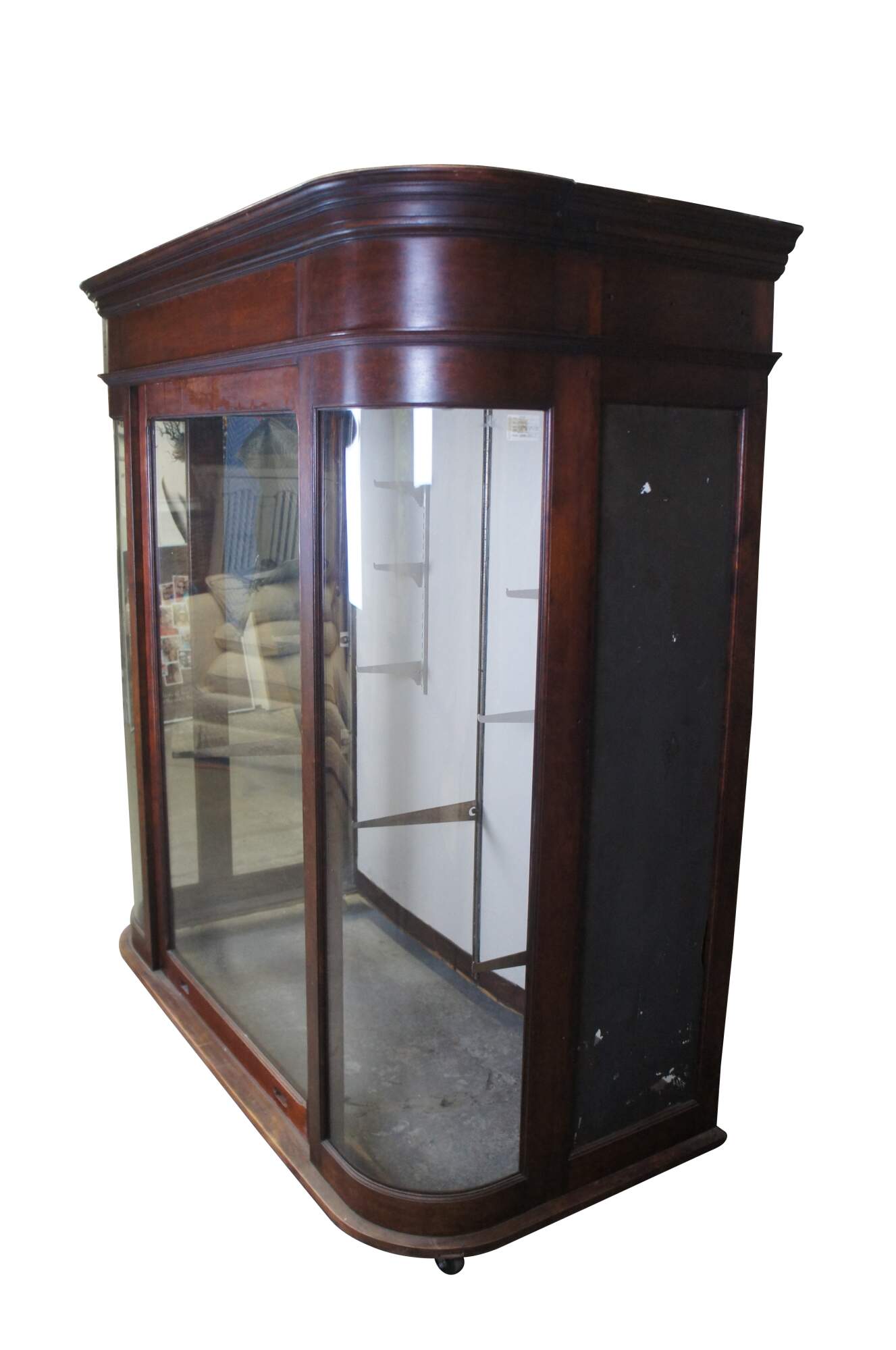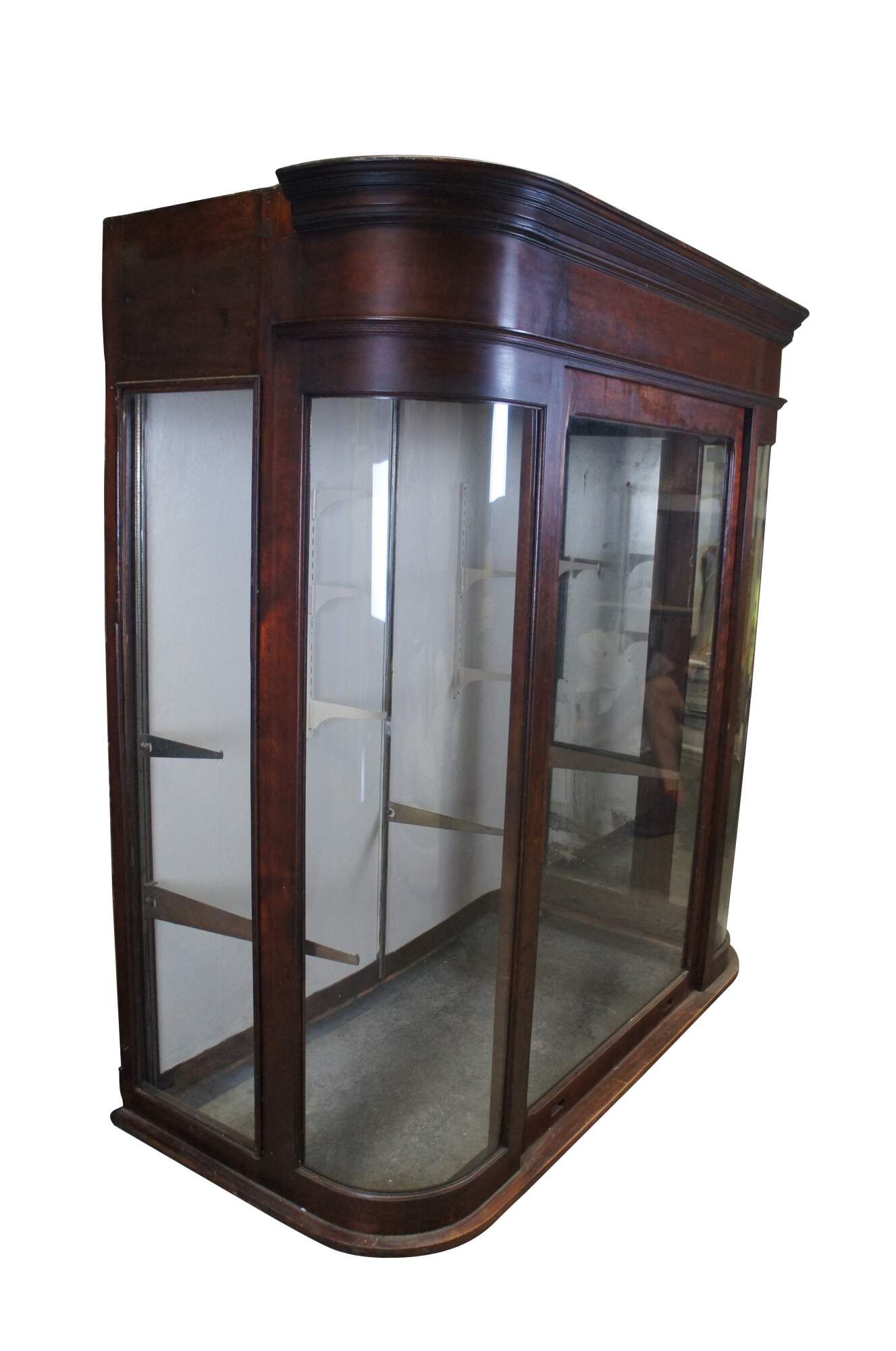 Monumental Victorian general store / apothecary display cabinet. Made from mahogany with curved glass and a large weight driven door that extend through the top. Most recently used at a tire shop in Xenia Ohio. This cabinet would be most impressive installed on a counter top for eye level viewing. Could be a neat bar back as well.