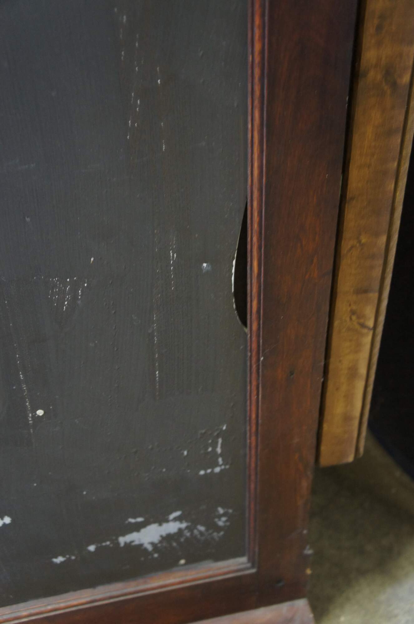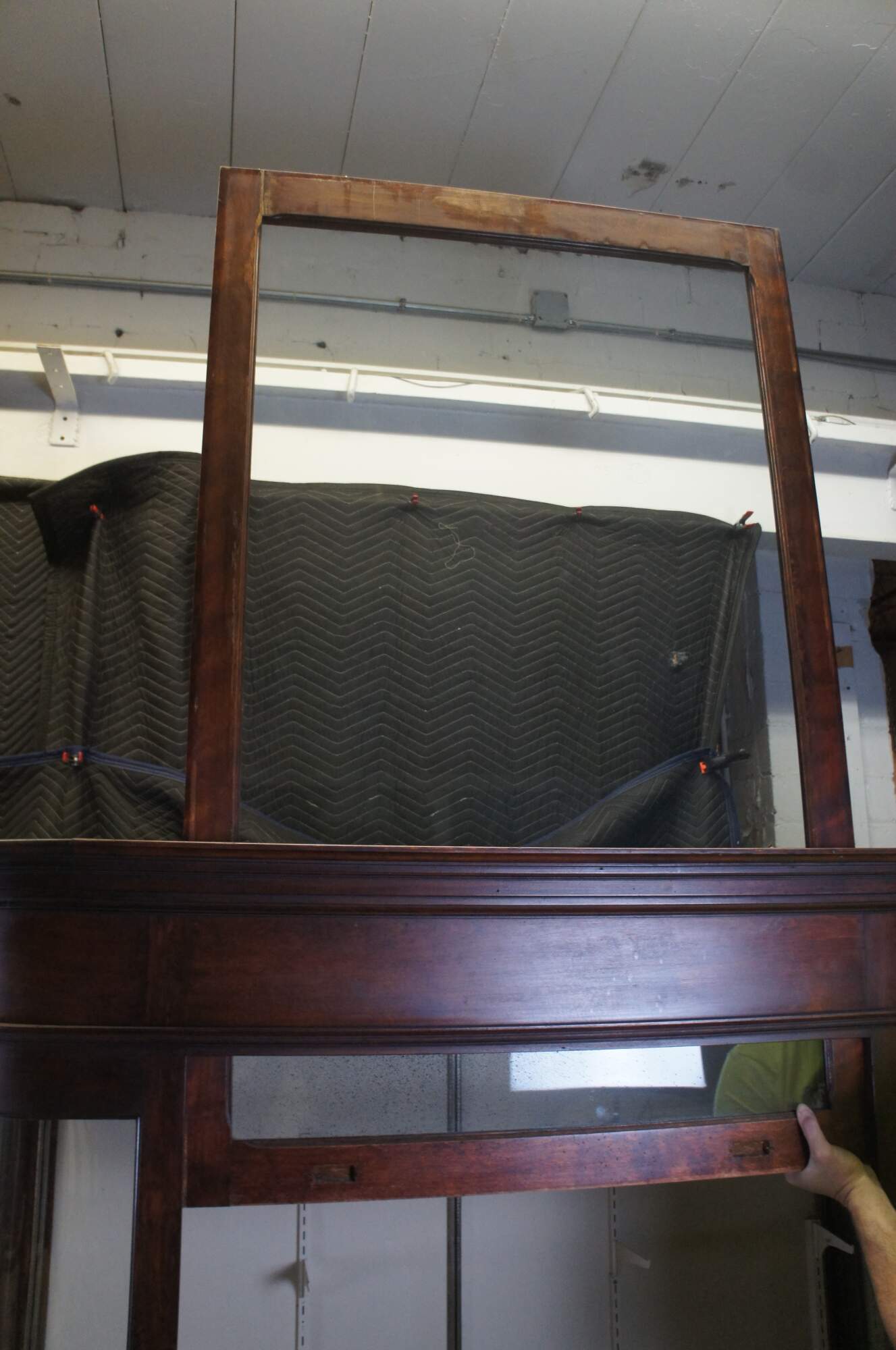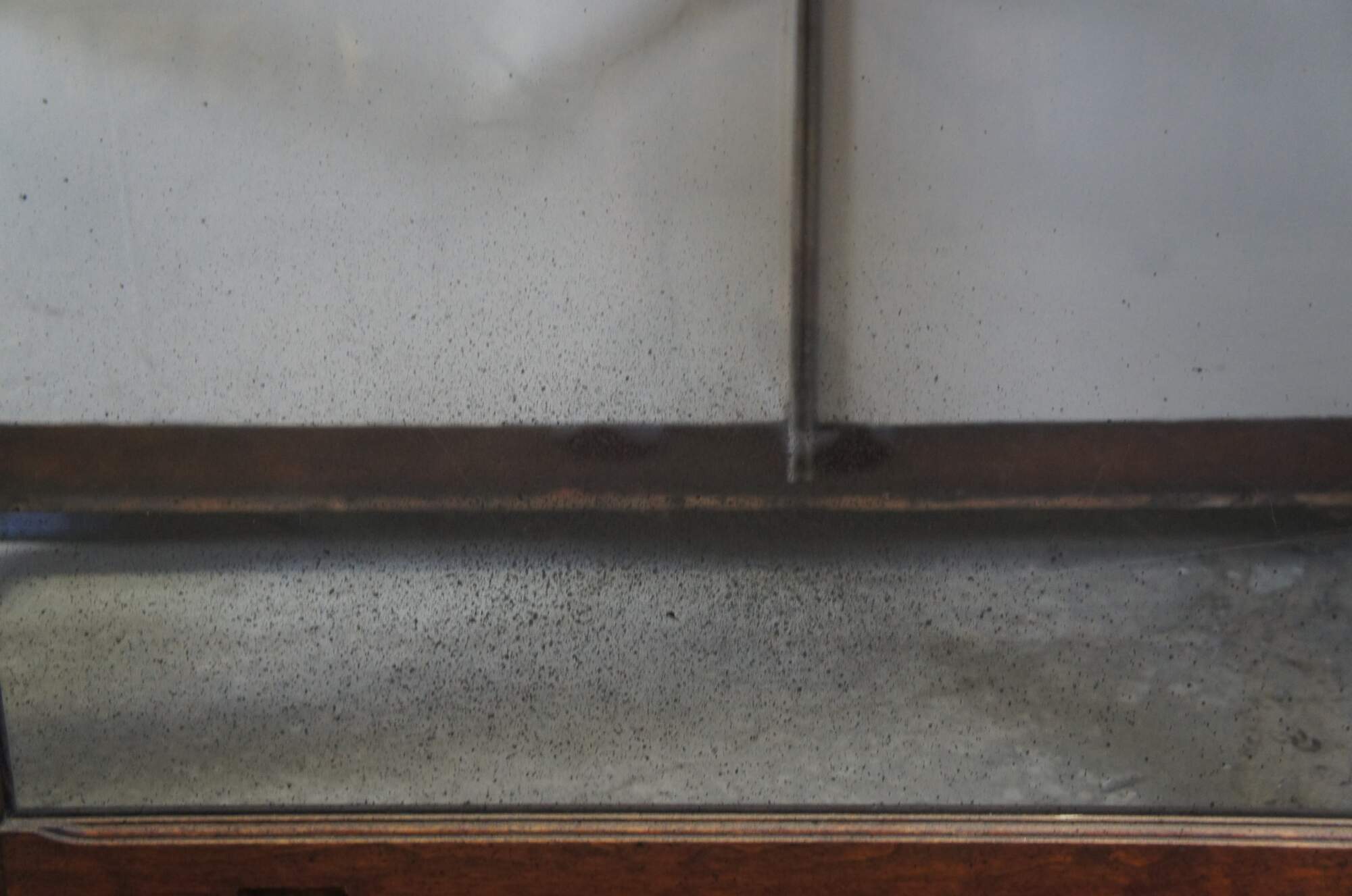 Fair condition, wear and distressing commensurate with age and use, finish loss, fading, silver loss, missing trim from when installed, crack to back right panel,