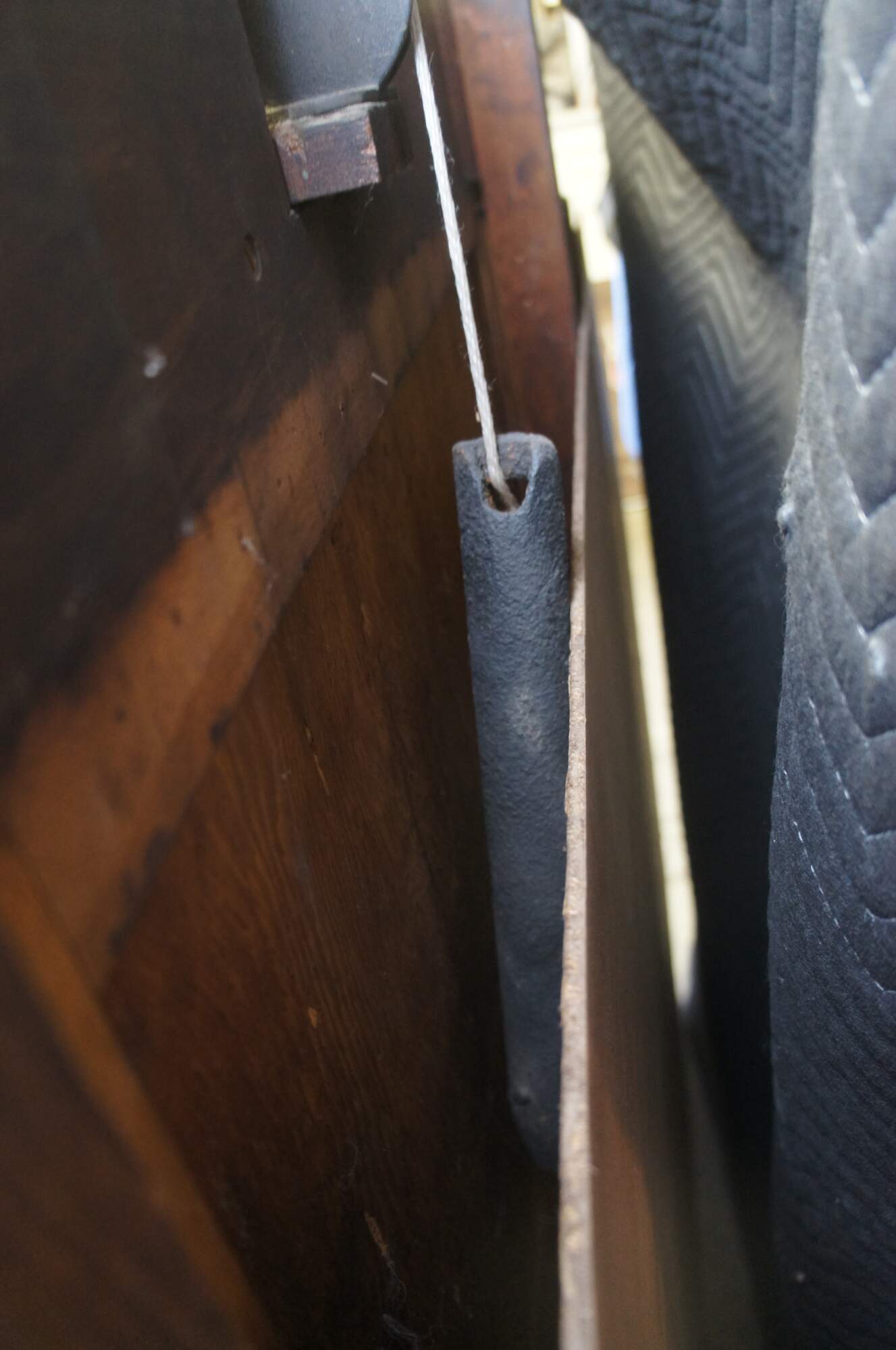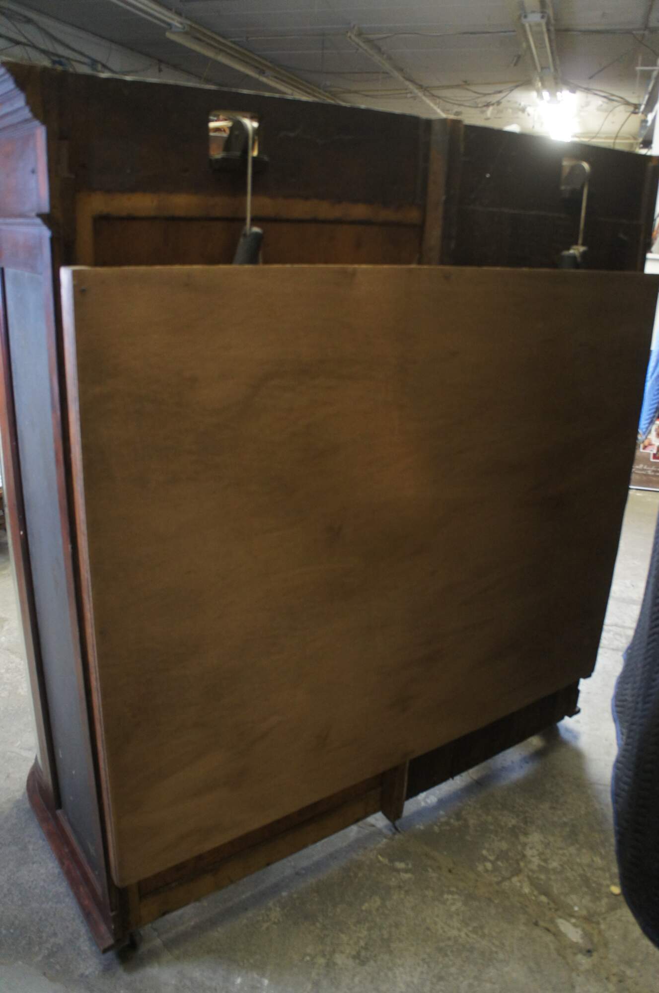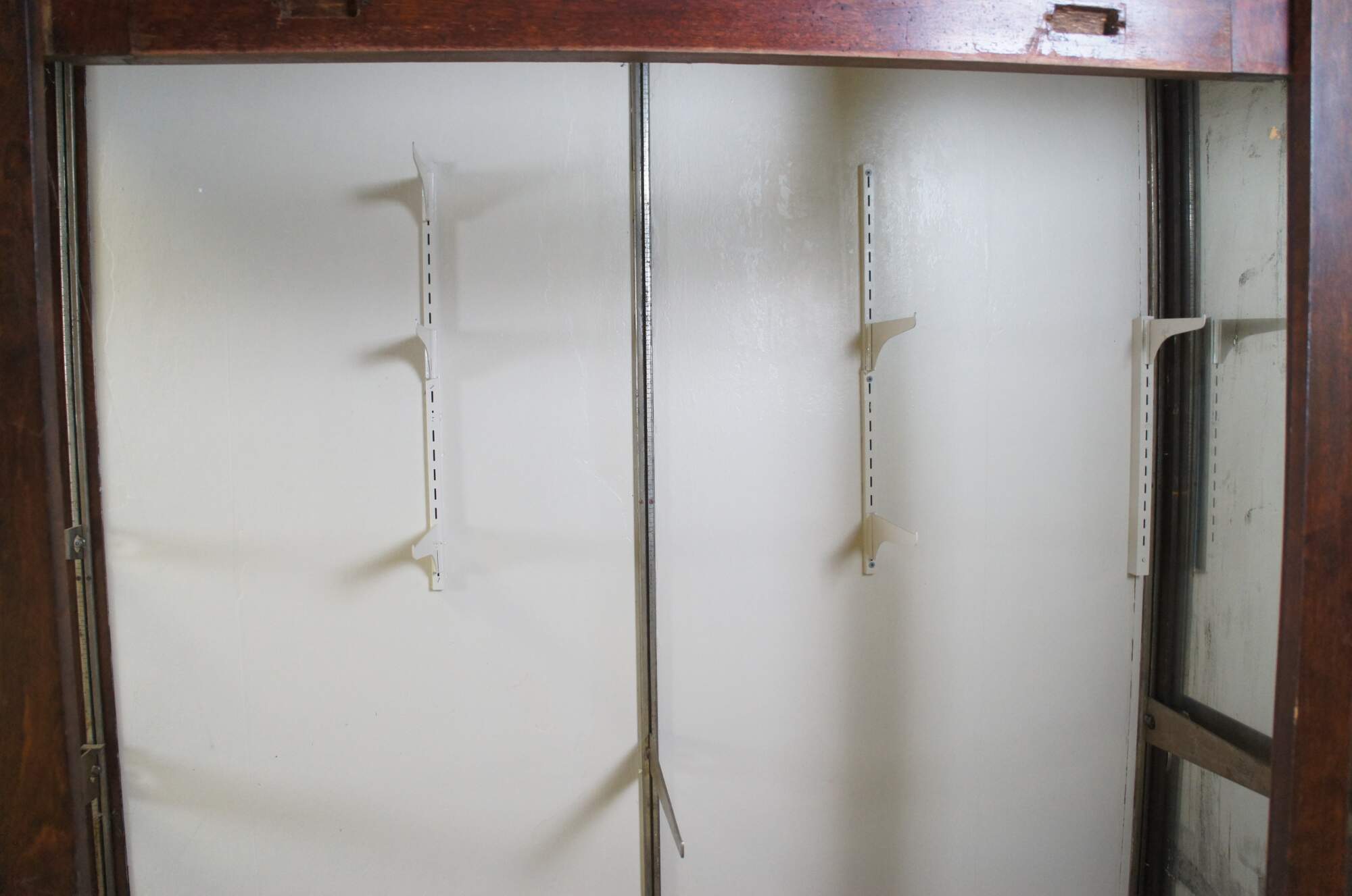 Fair condition, wear and distressing commensurate with age and use, finish loss, fading, silver loss, missing trim from when installed, crack to back right panel,
