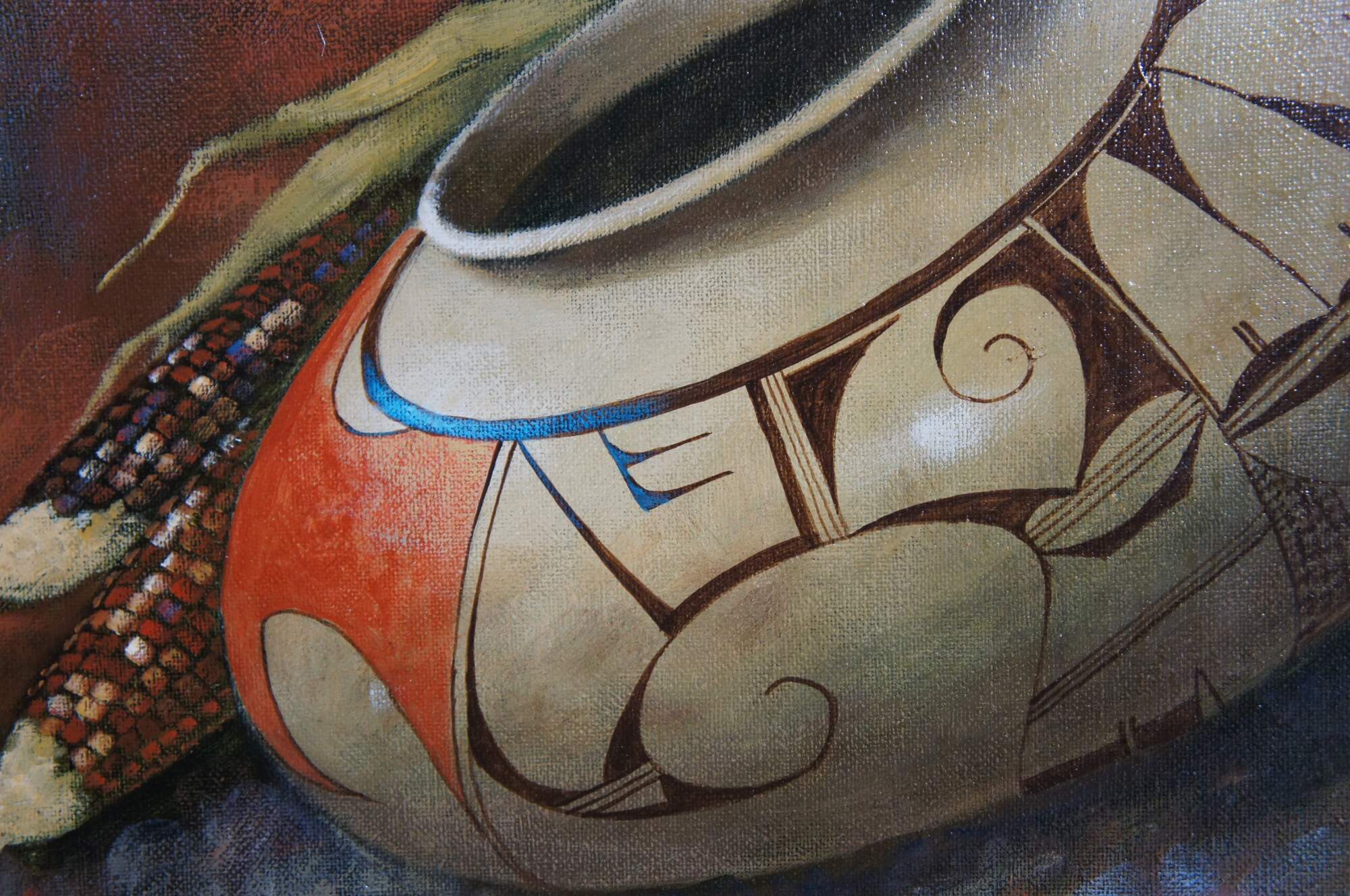 Pair of vibrant oil on canvas still life paintings by Daniel Yazzie, showing tableaus of southwestern / Native American baskets, pottery and corn. Signed in lower right. Framed in light wood frames with raised bevel.