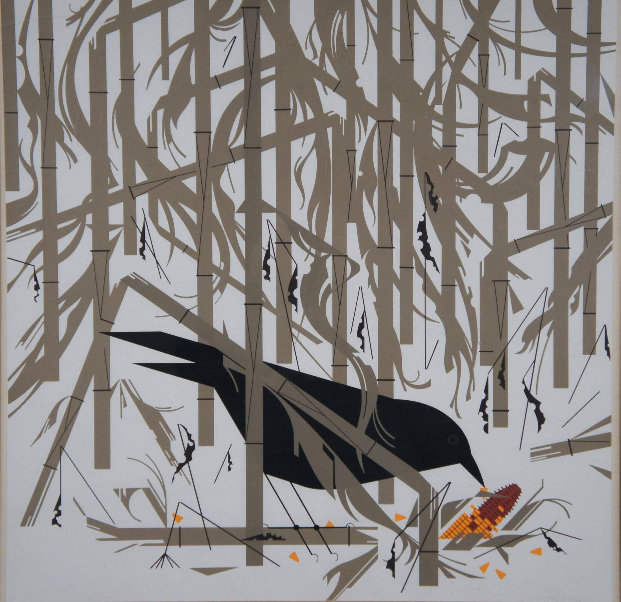 Vintage serigraph print titled "Crow in the Snow" by Charley Harper, showing a black crow nibbling on an ear of corn among snowy corn stalks. Framed under glass. Signed and numbered.