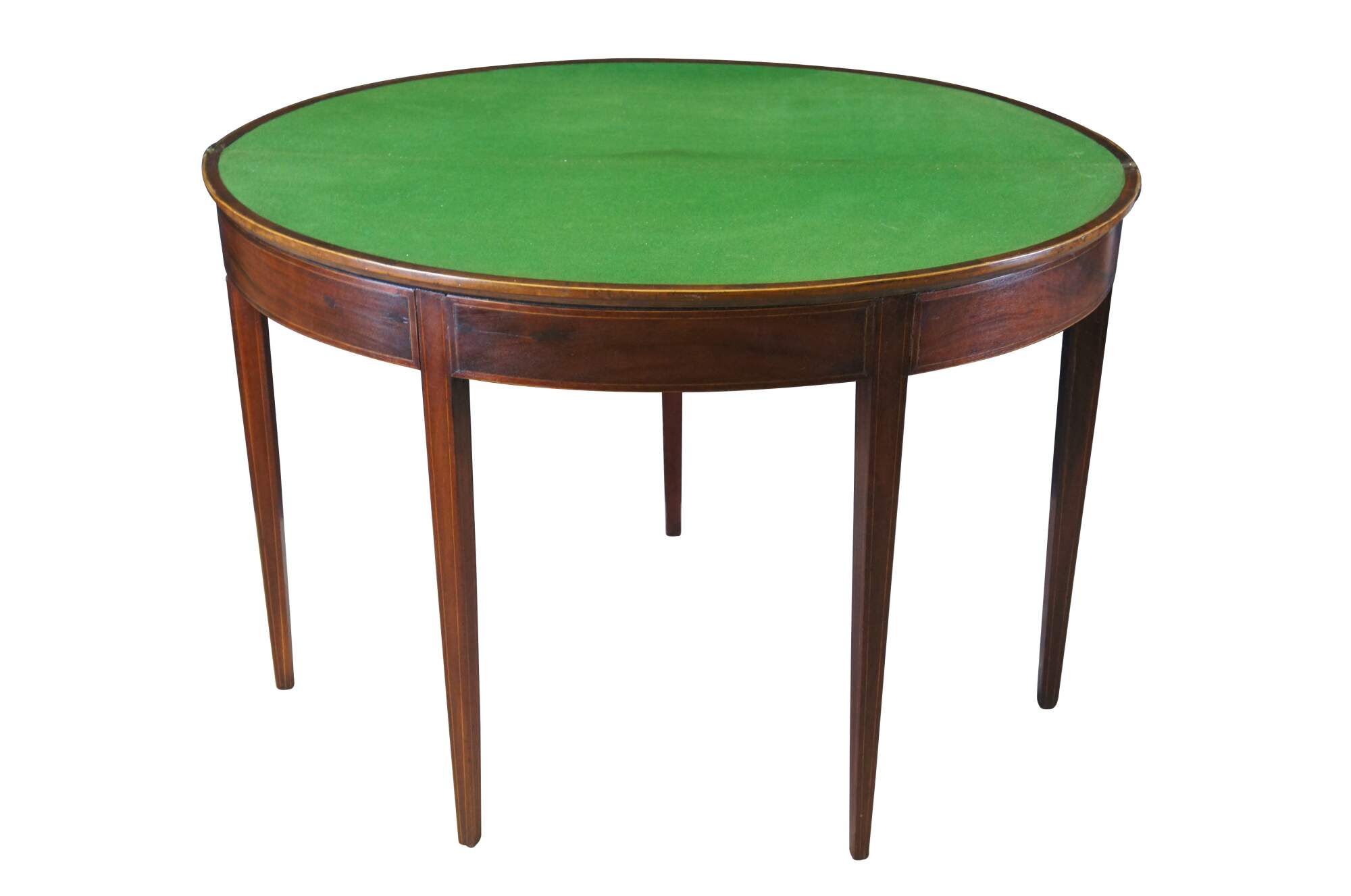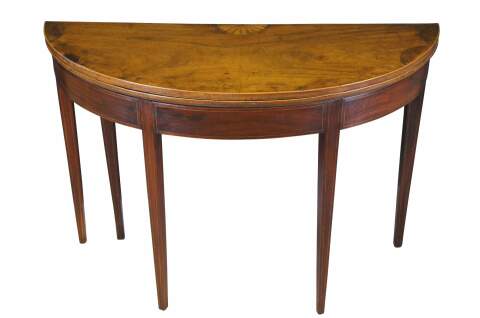 Antique late 18th early 19th century Sheraton period mahogany card / console / tea table. Made of mahogany featuring inlaid fruitwood shell and web design top which opens to an oval green felt playing surface, supported by tapered legs. Circa 1790s - 1820s.