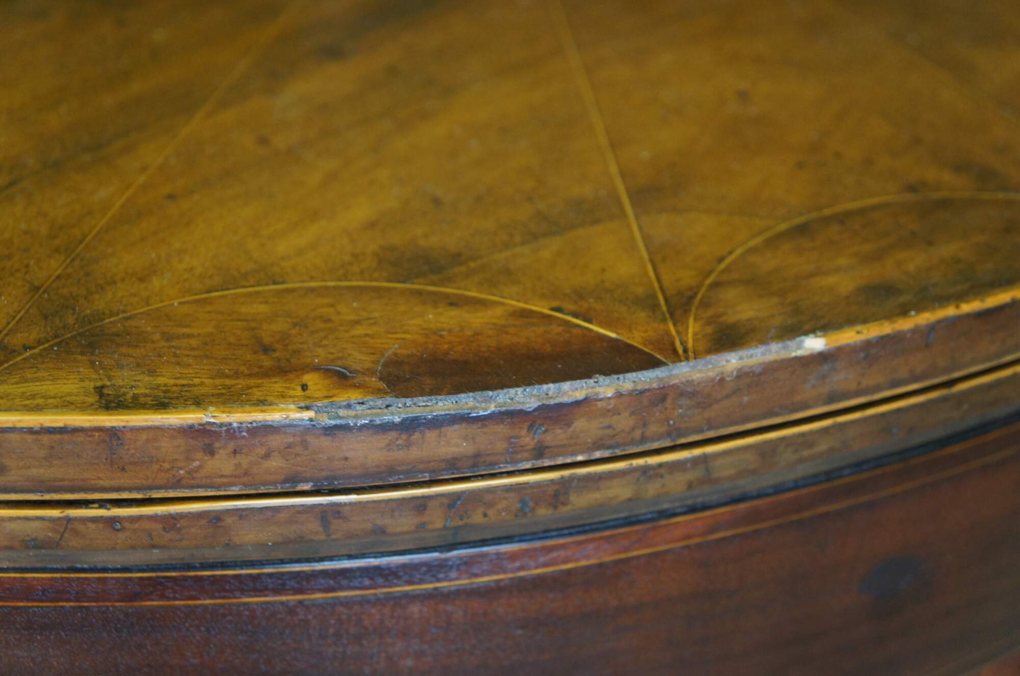 Good antique condition, wear and distressing commensurate with age and use, fading, warping, veneer wear, marking, edge wear.