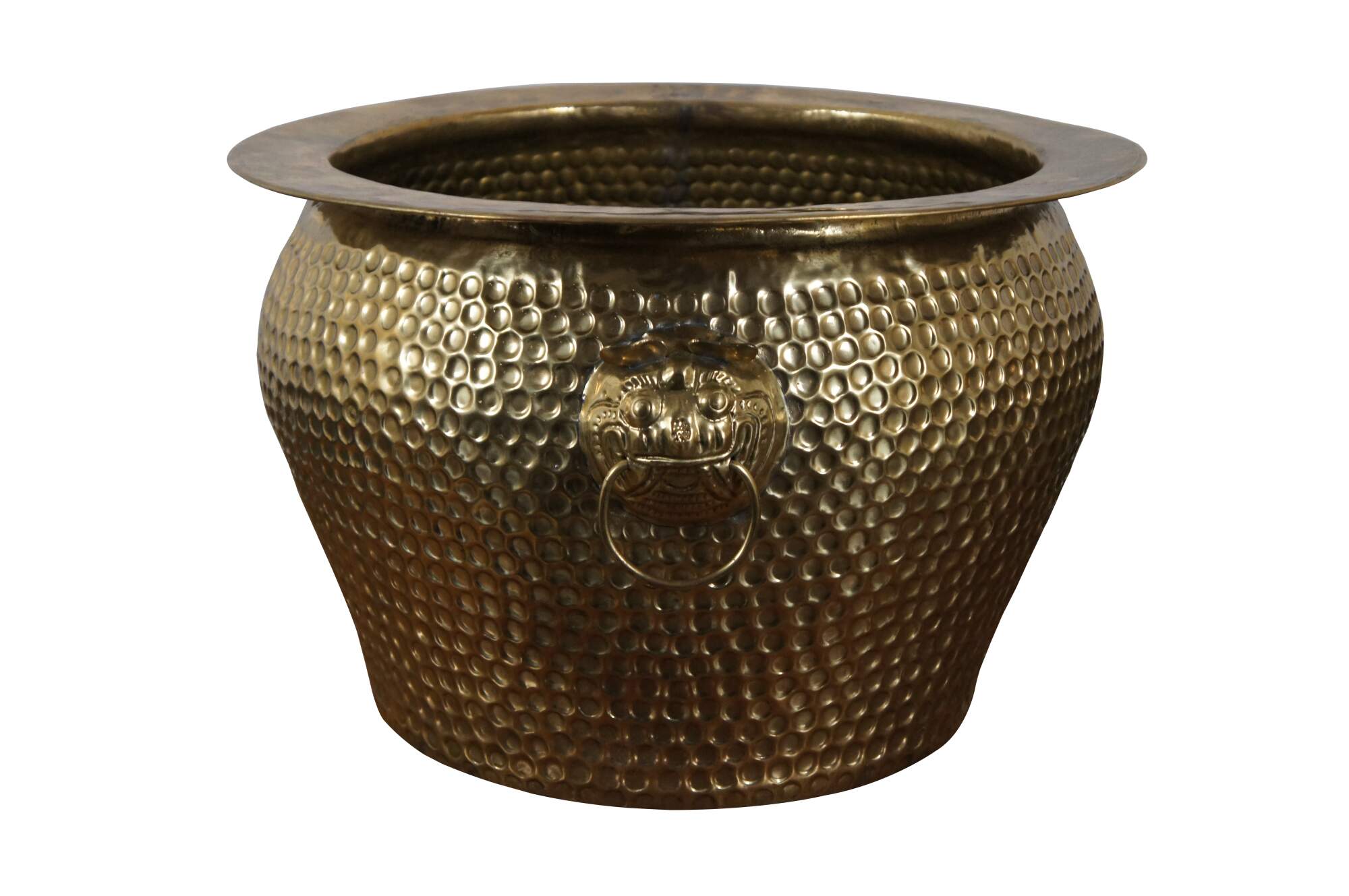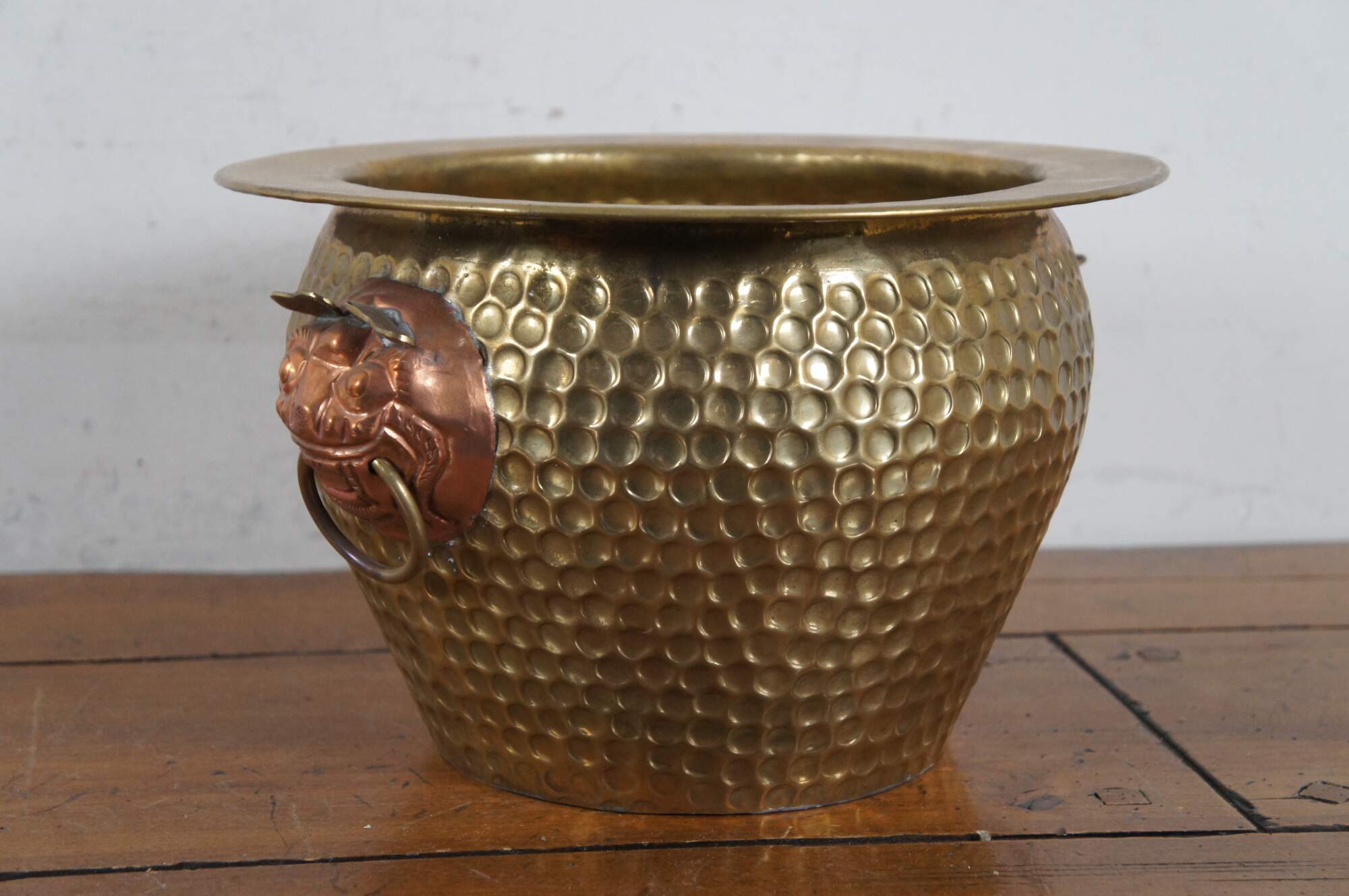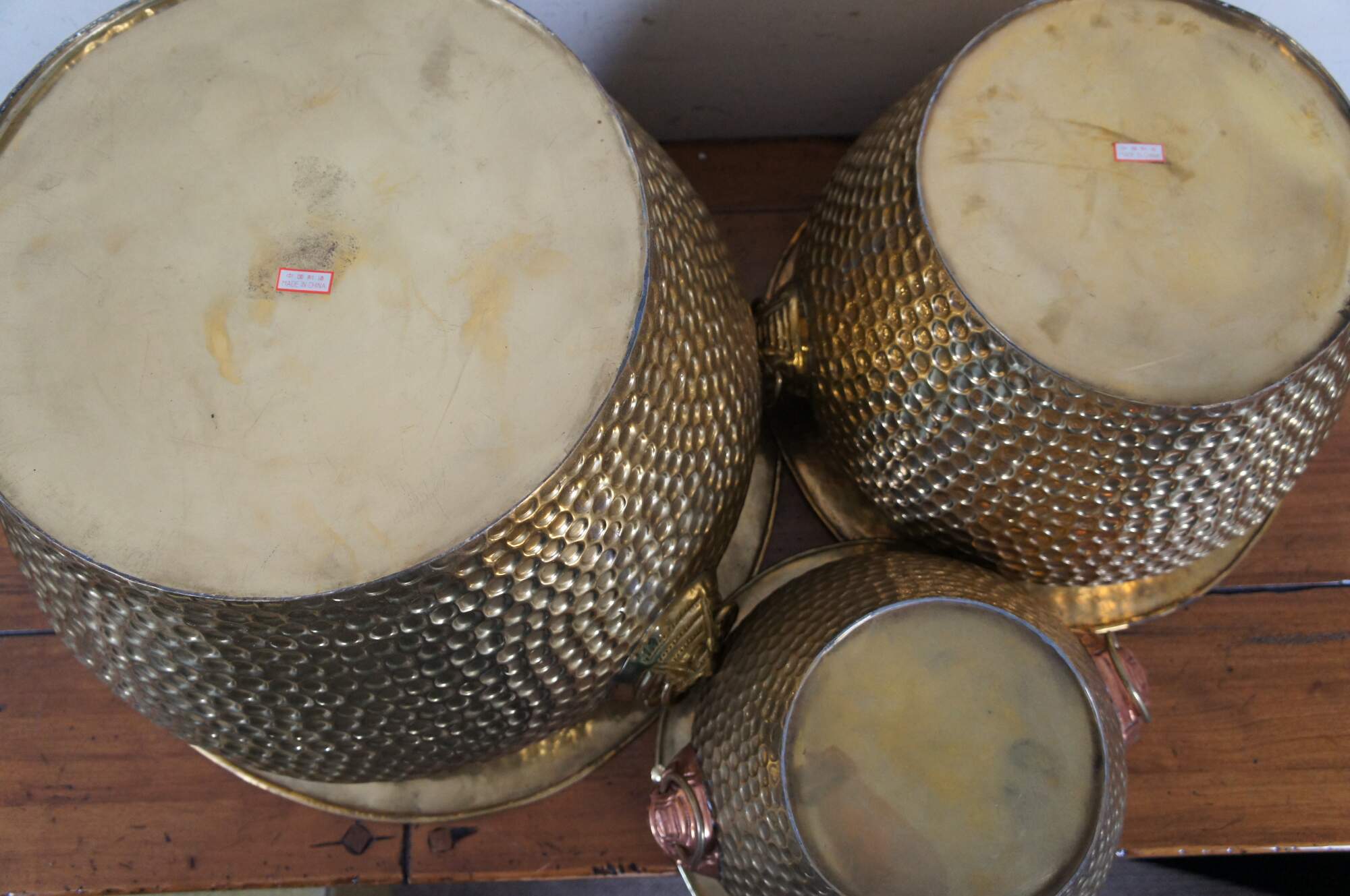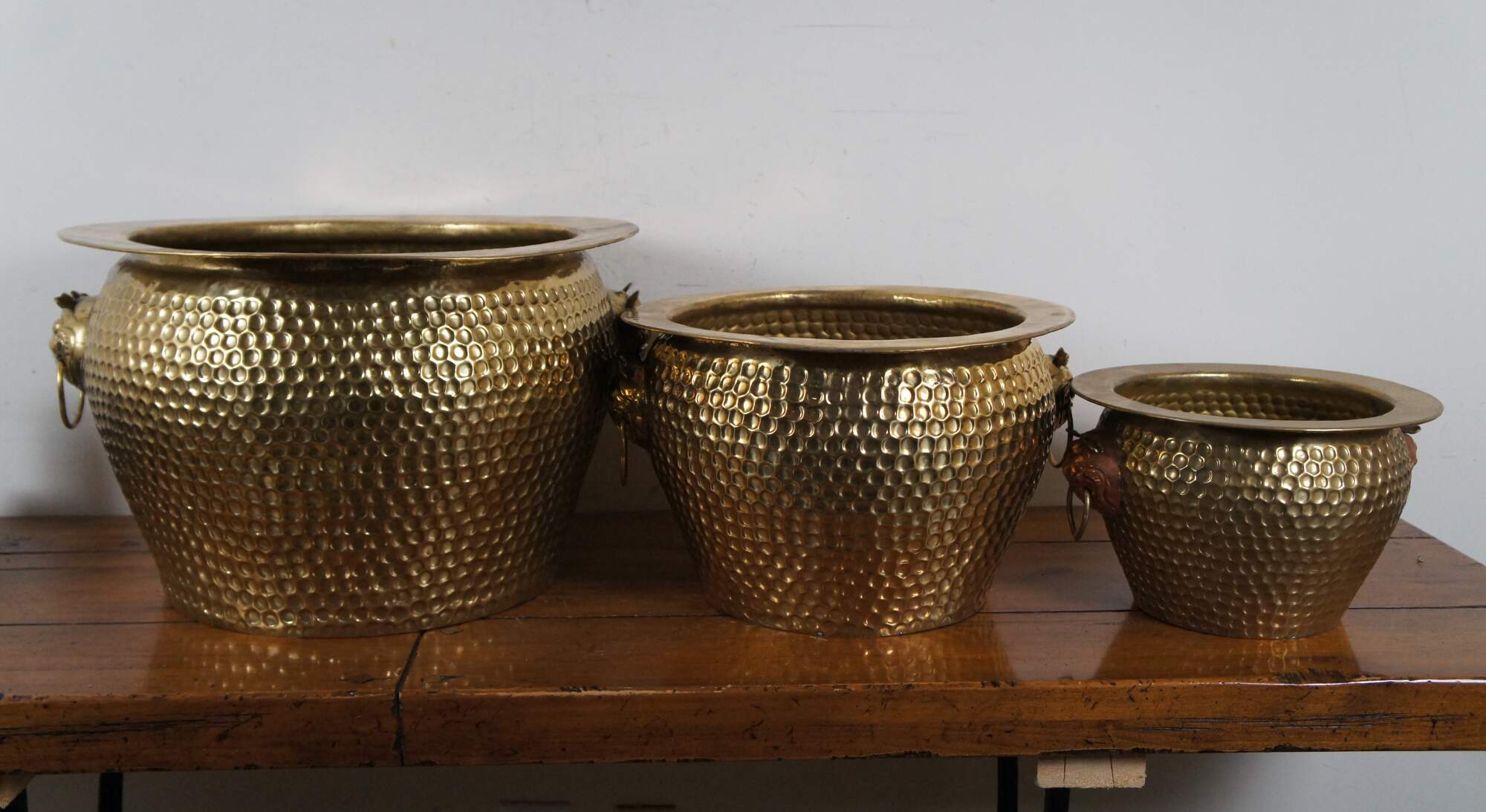 Three vintage Chinese nesting planters / jardinières / cachepots. Made of brass featuring round form with hammered dovetailed body that features foo dog / dragon / lion ring handles. The smallest one has copper handles.