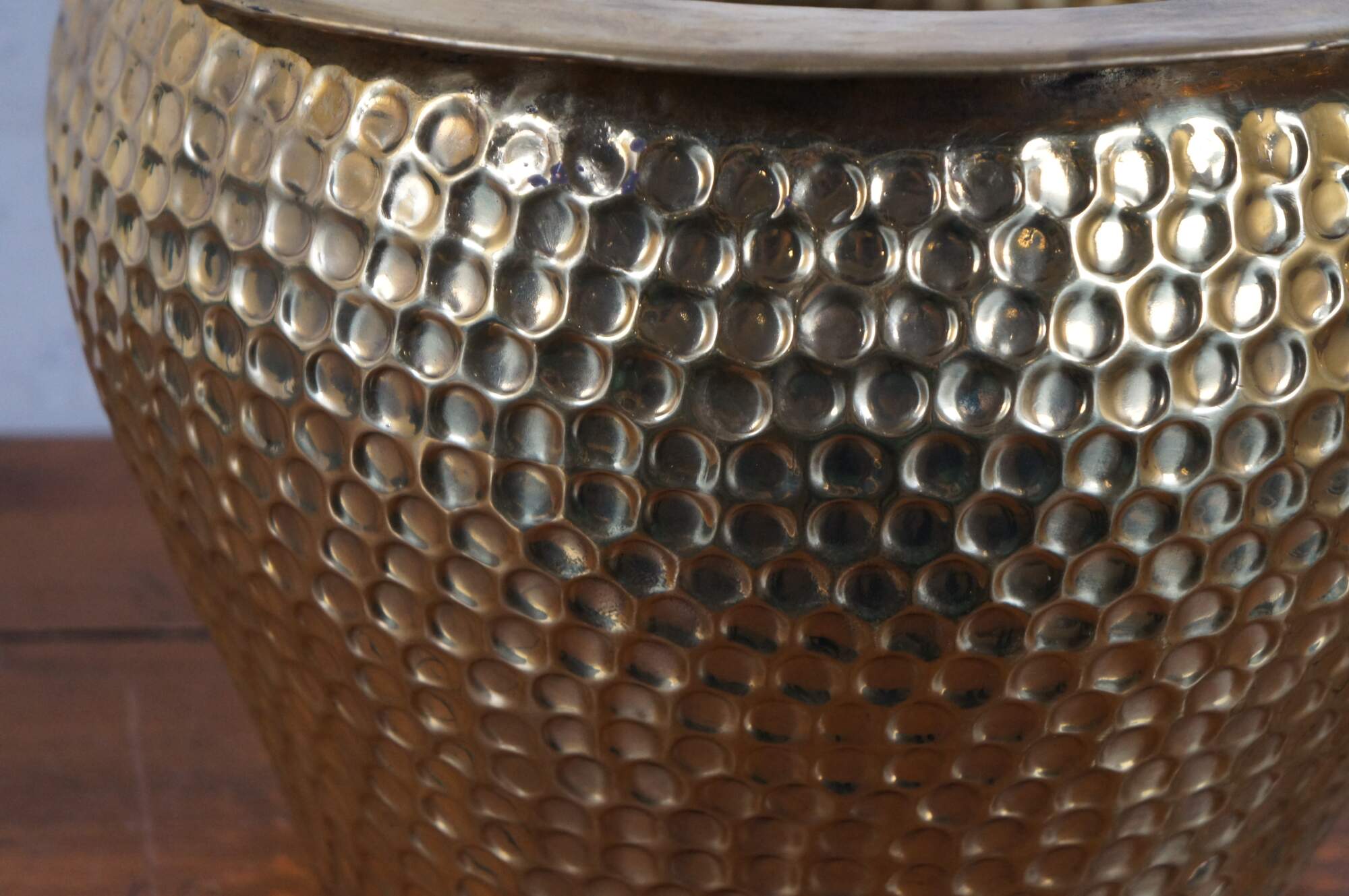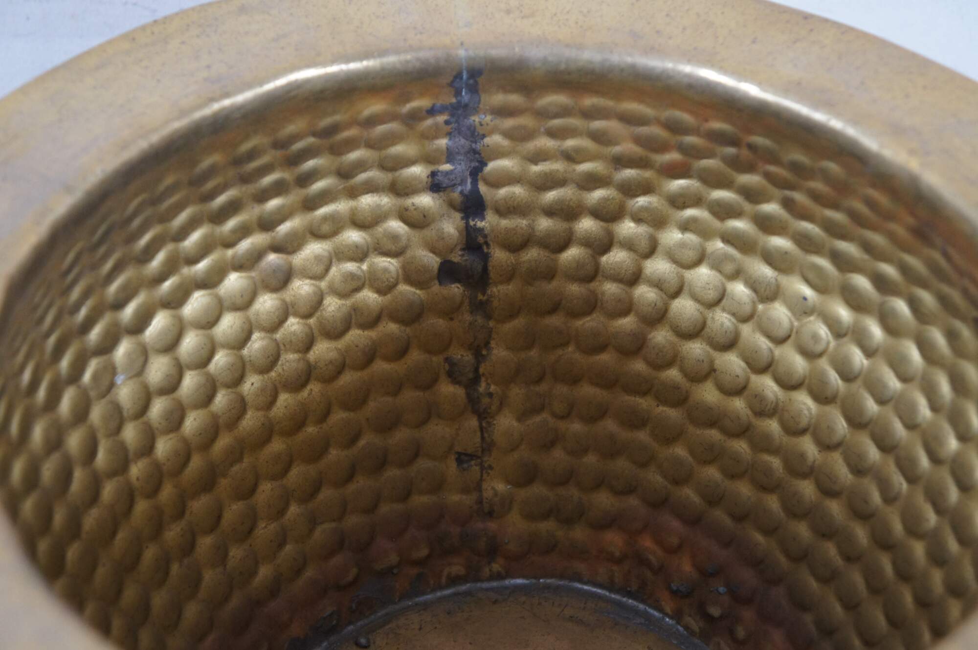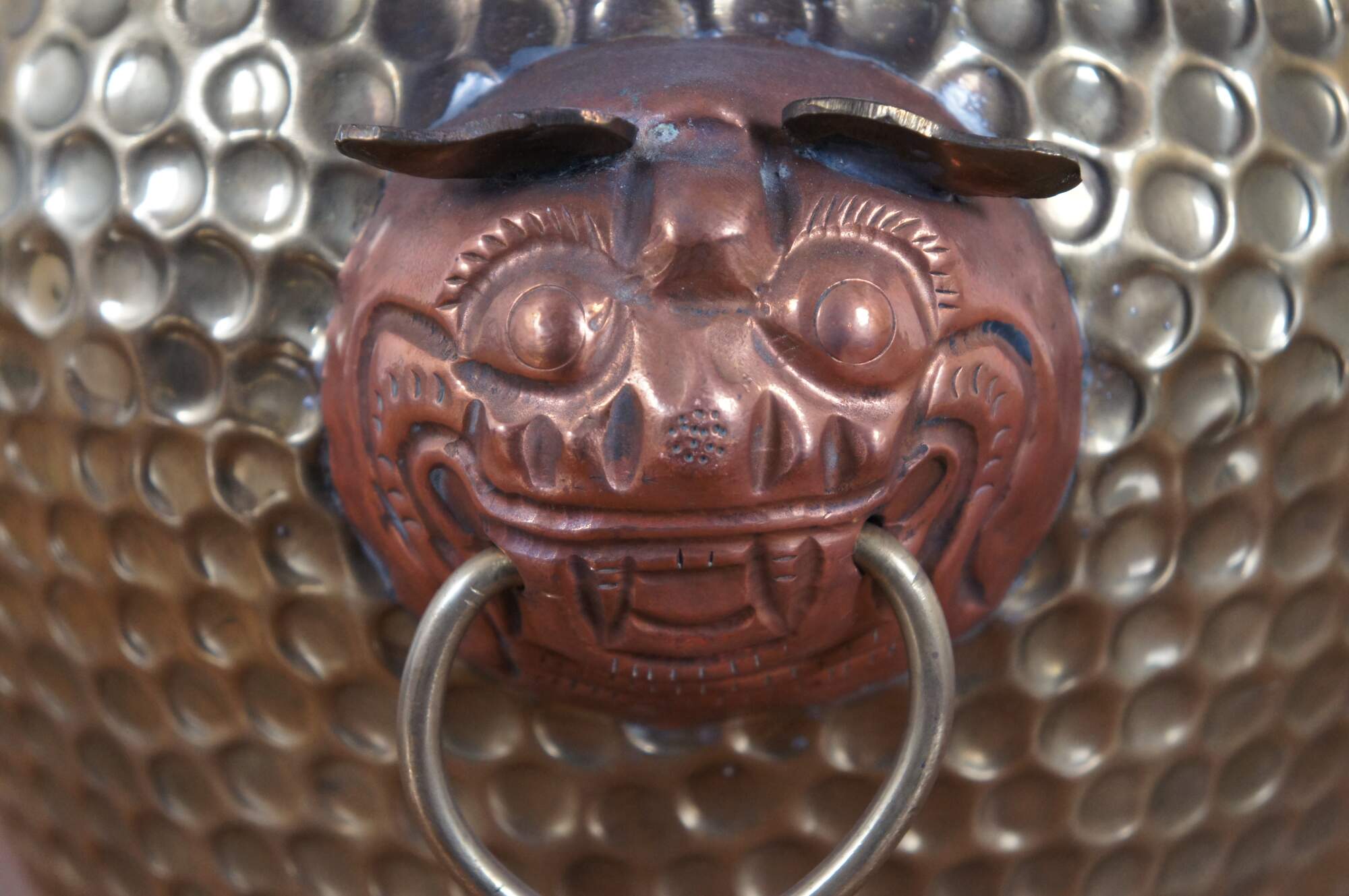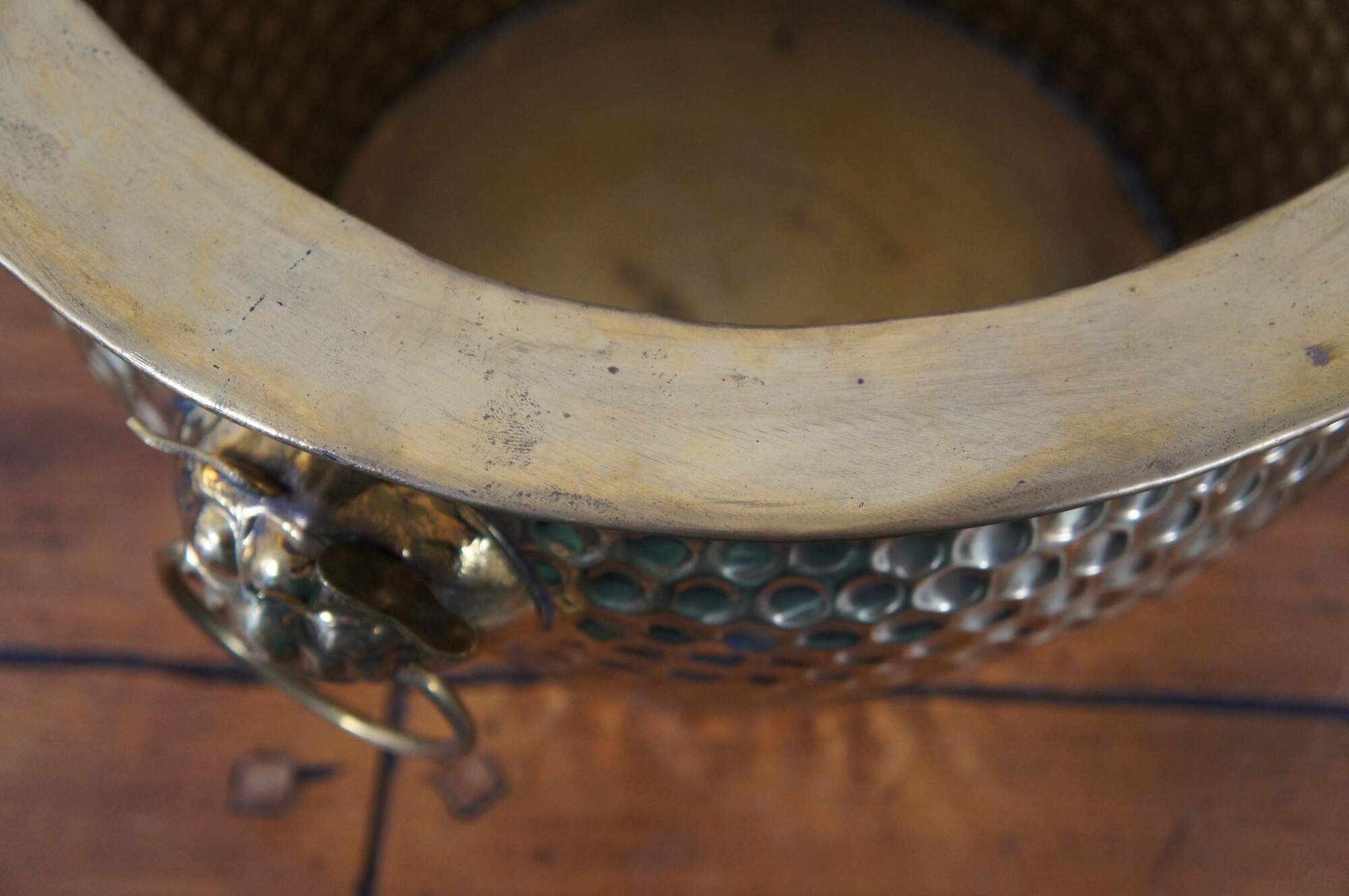 Three vintage Chinese nesting planters / jardinières / cachepots. Made of brass featuring round form with hammered dovetailed body that features foo dog / dragon / lion ring handles. The smallest one has copper handles.