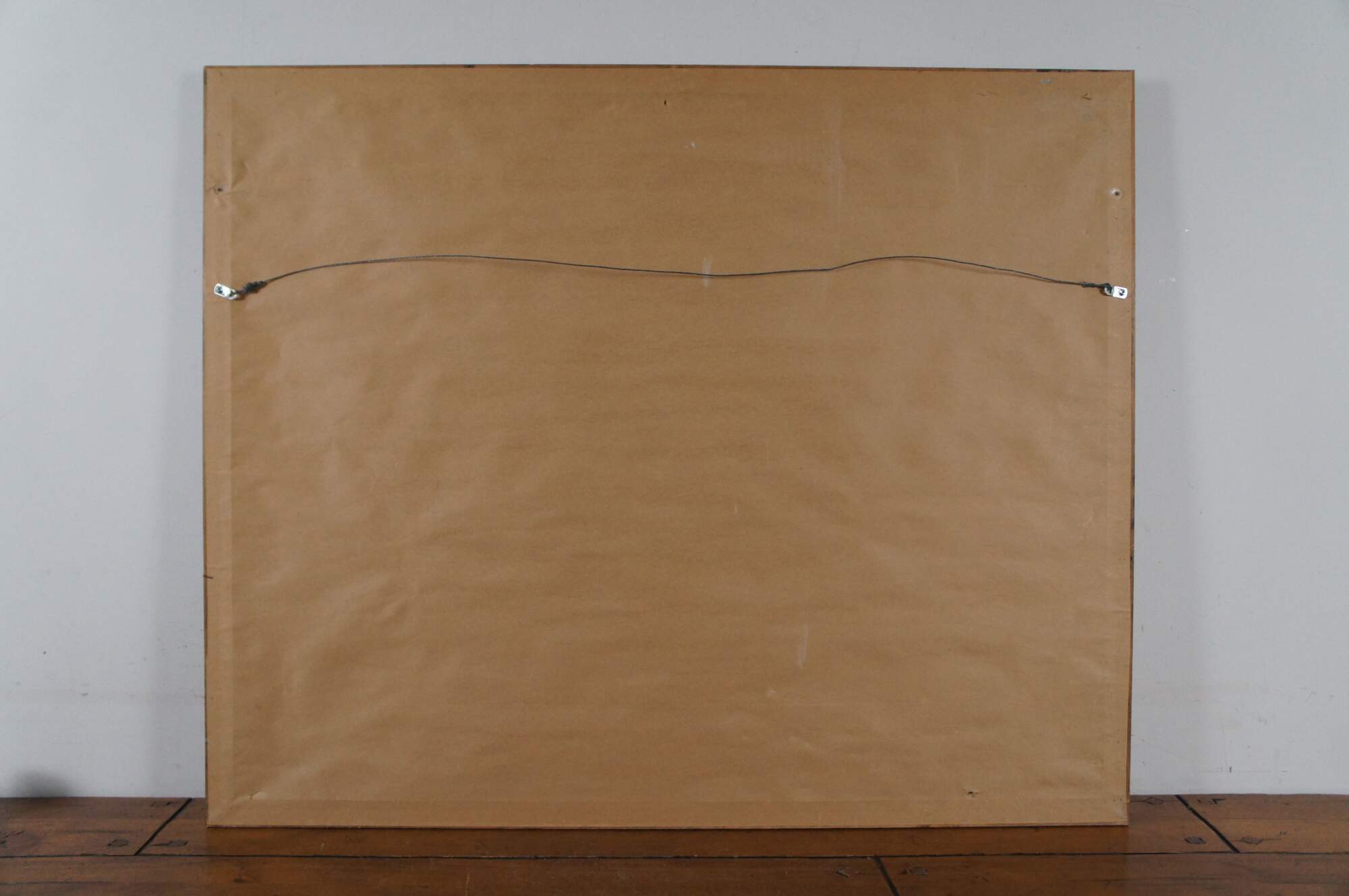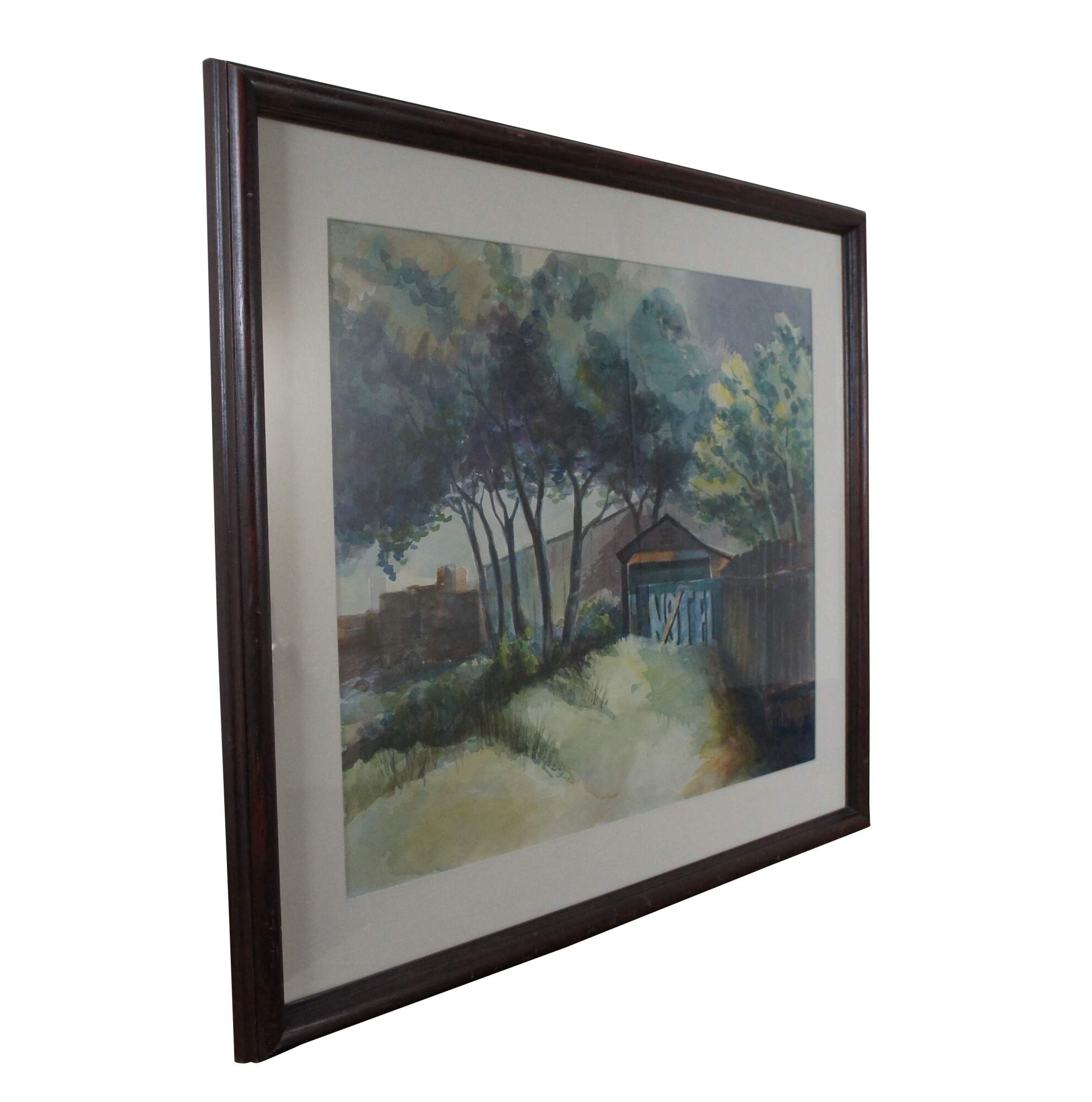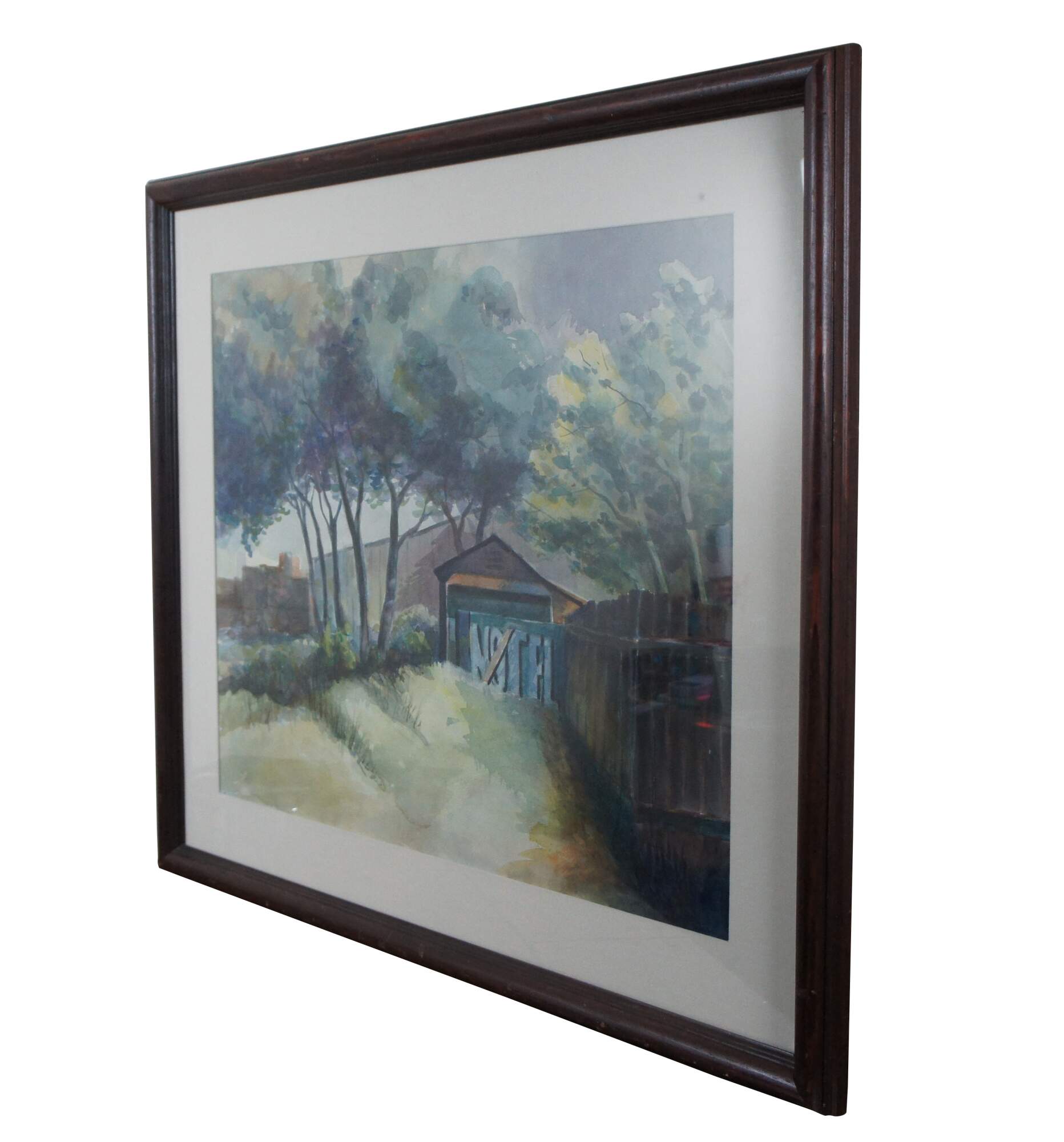 Vintage framed watercolor painting featuring a backyard landscape / cityscape with barn / trees / fence and "Notel" Motel sign.