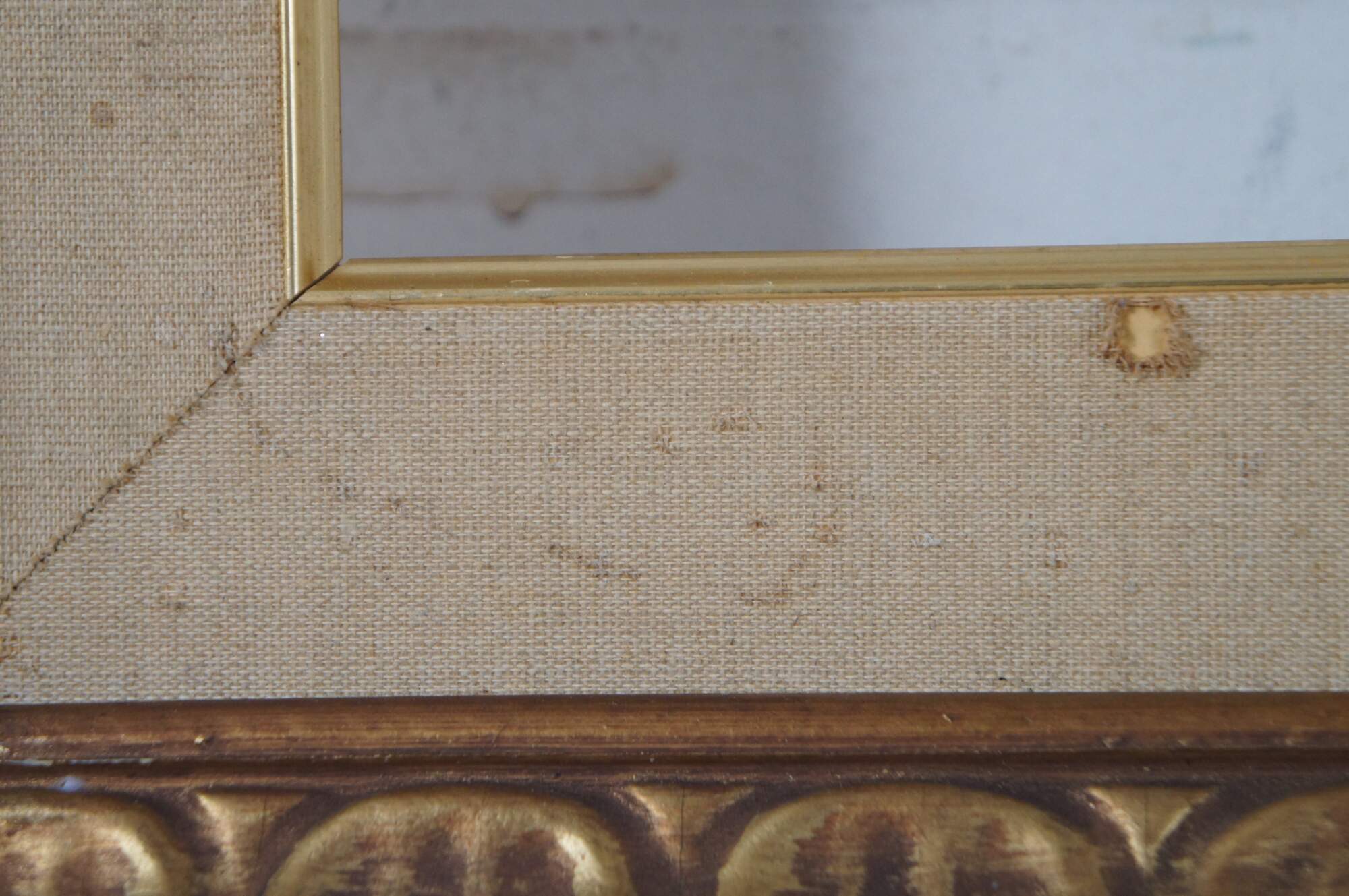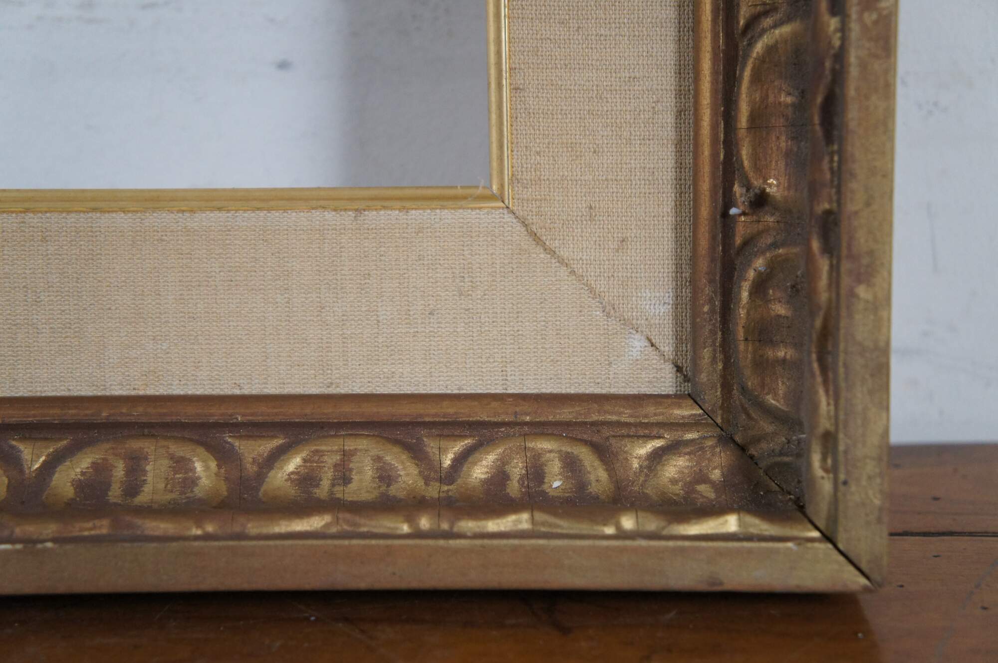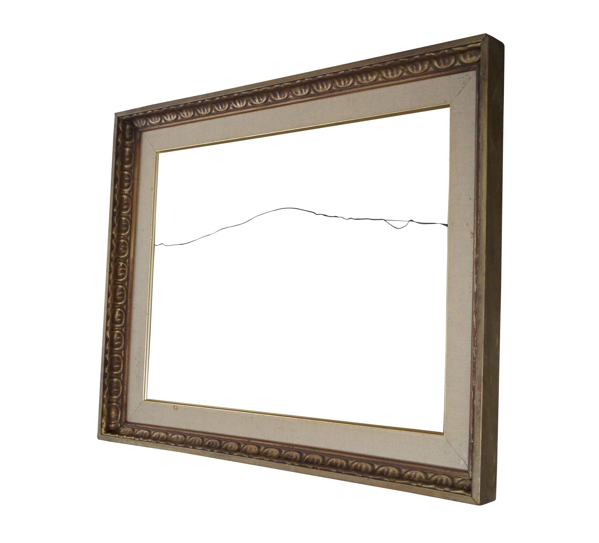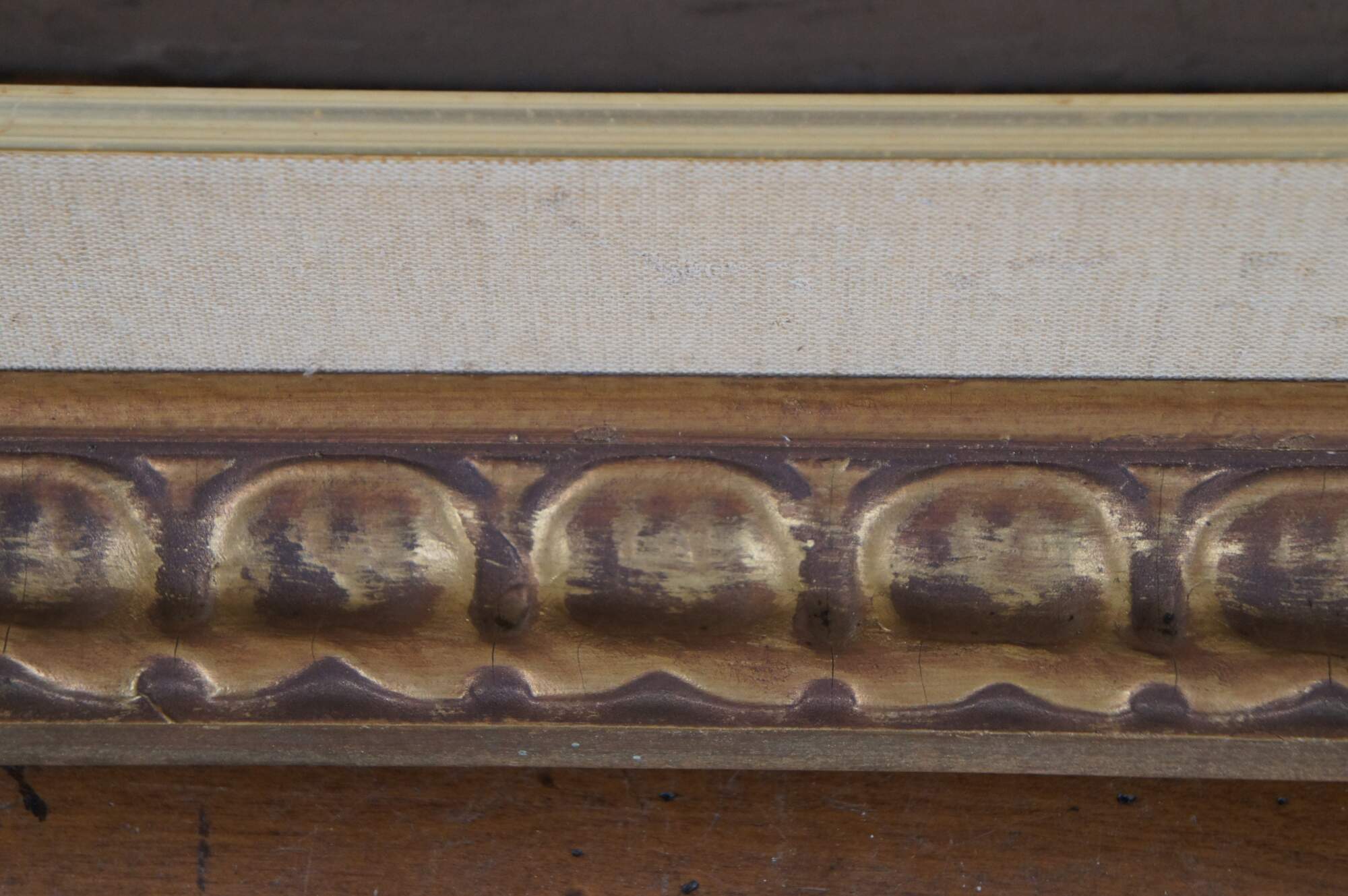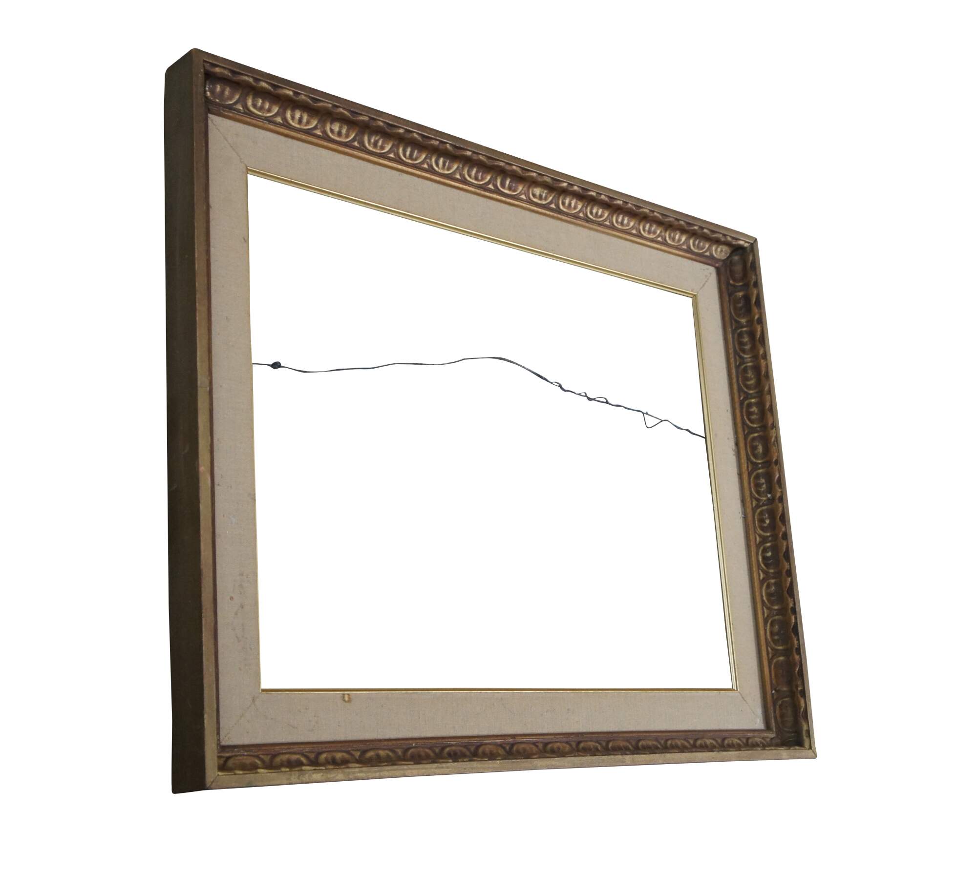 Vintage carved wood art frame featuring a gold painted repeating egg and dart style pattern with a fabric mat.