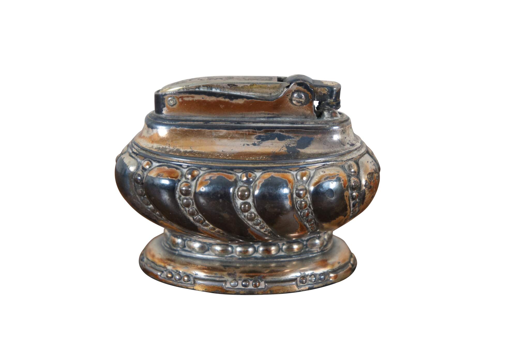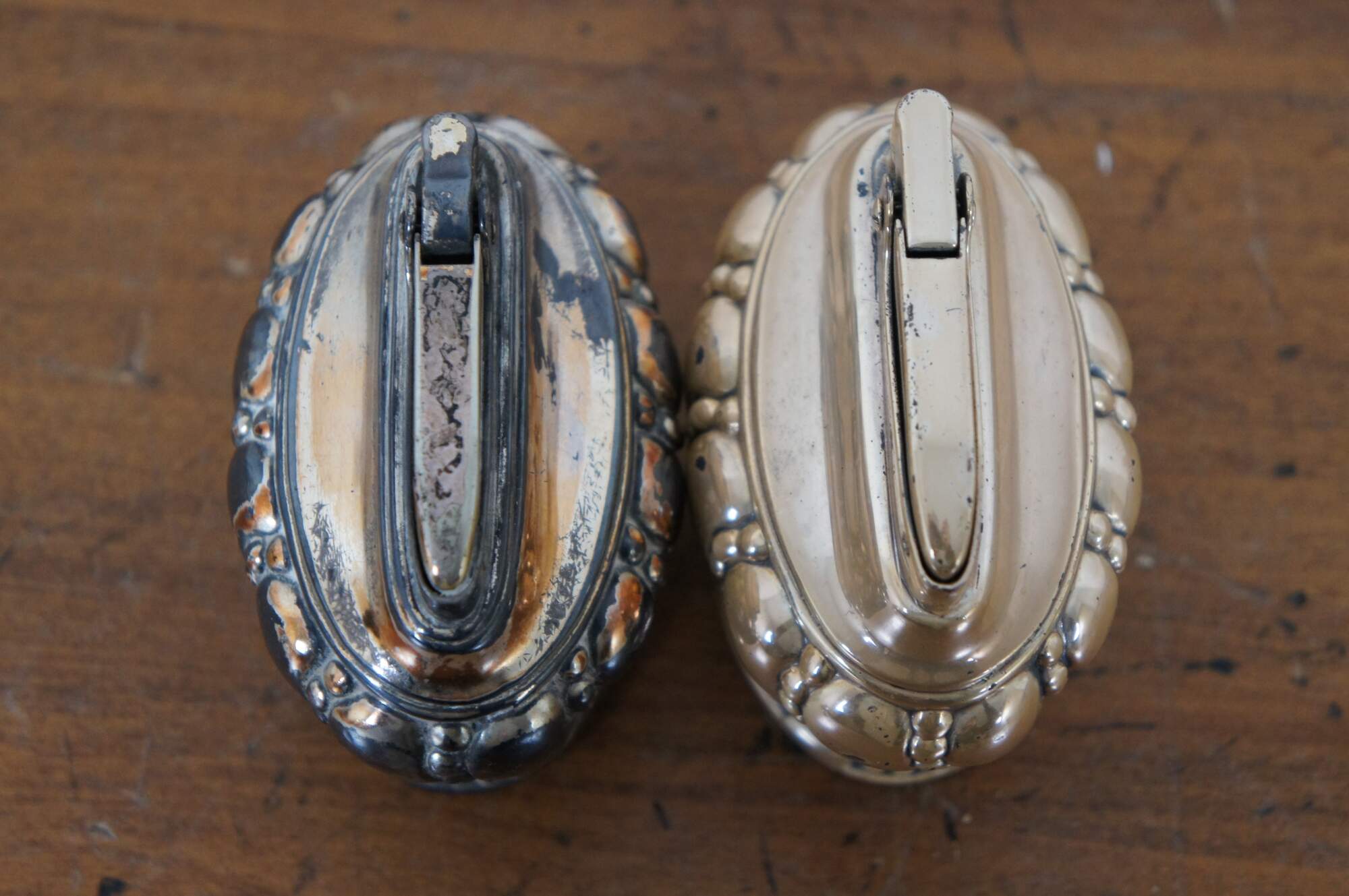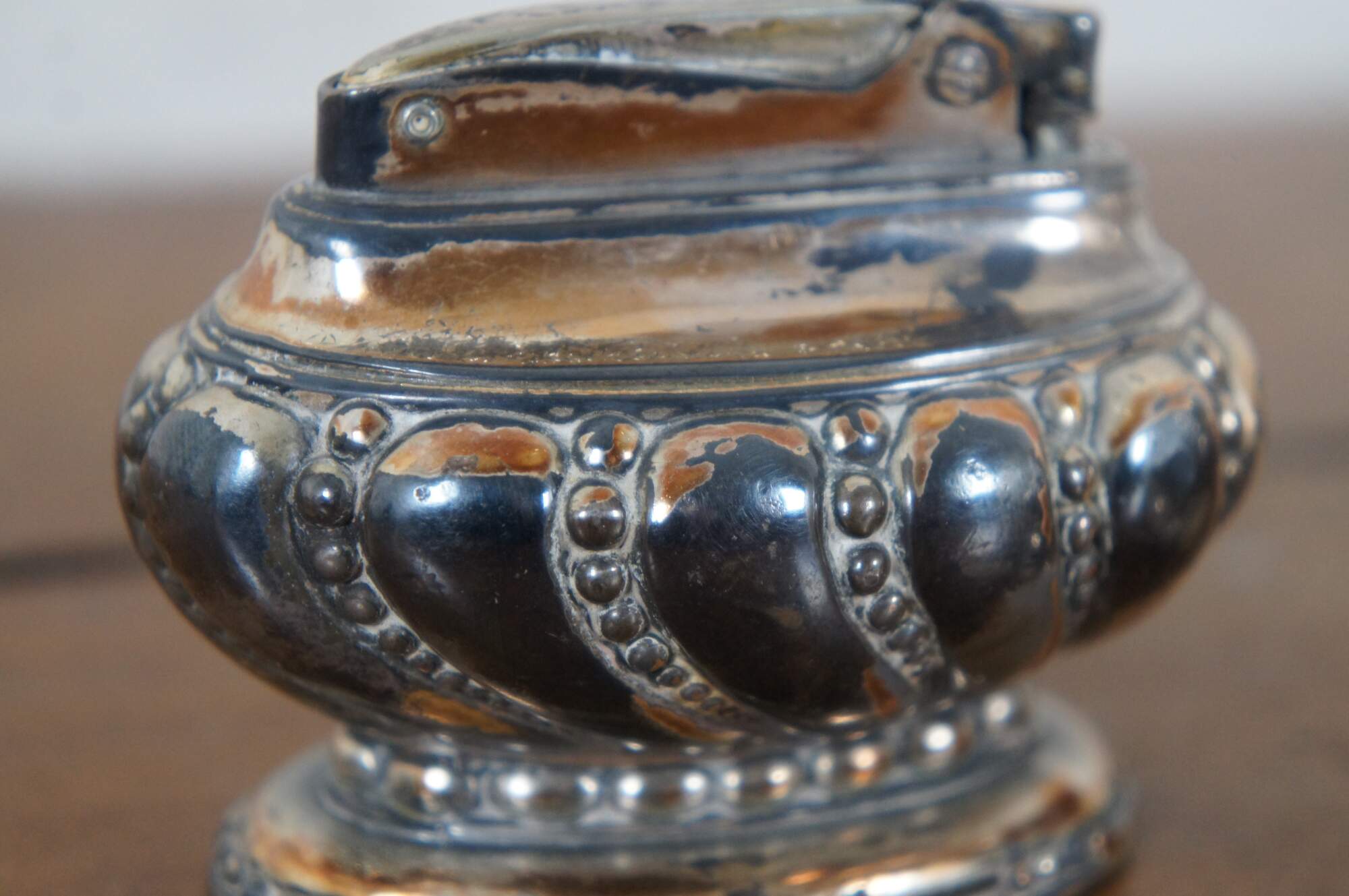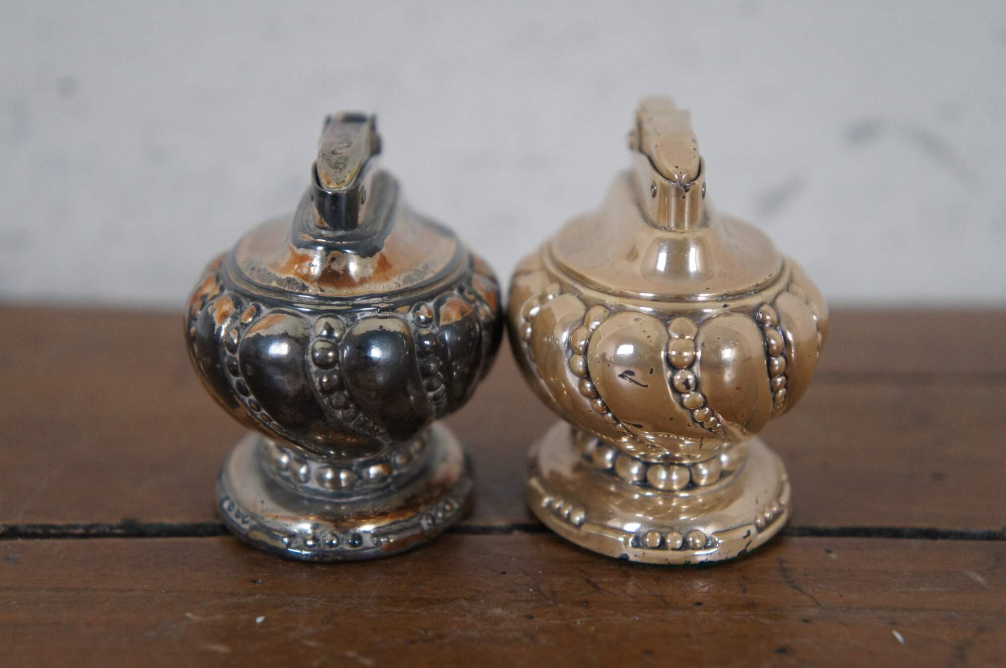 Pair mid 20th century Ronson "Crown" tobacco table lighters featuring a footed oval body molded with swirling beaded details.