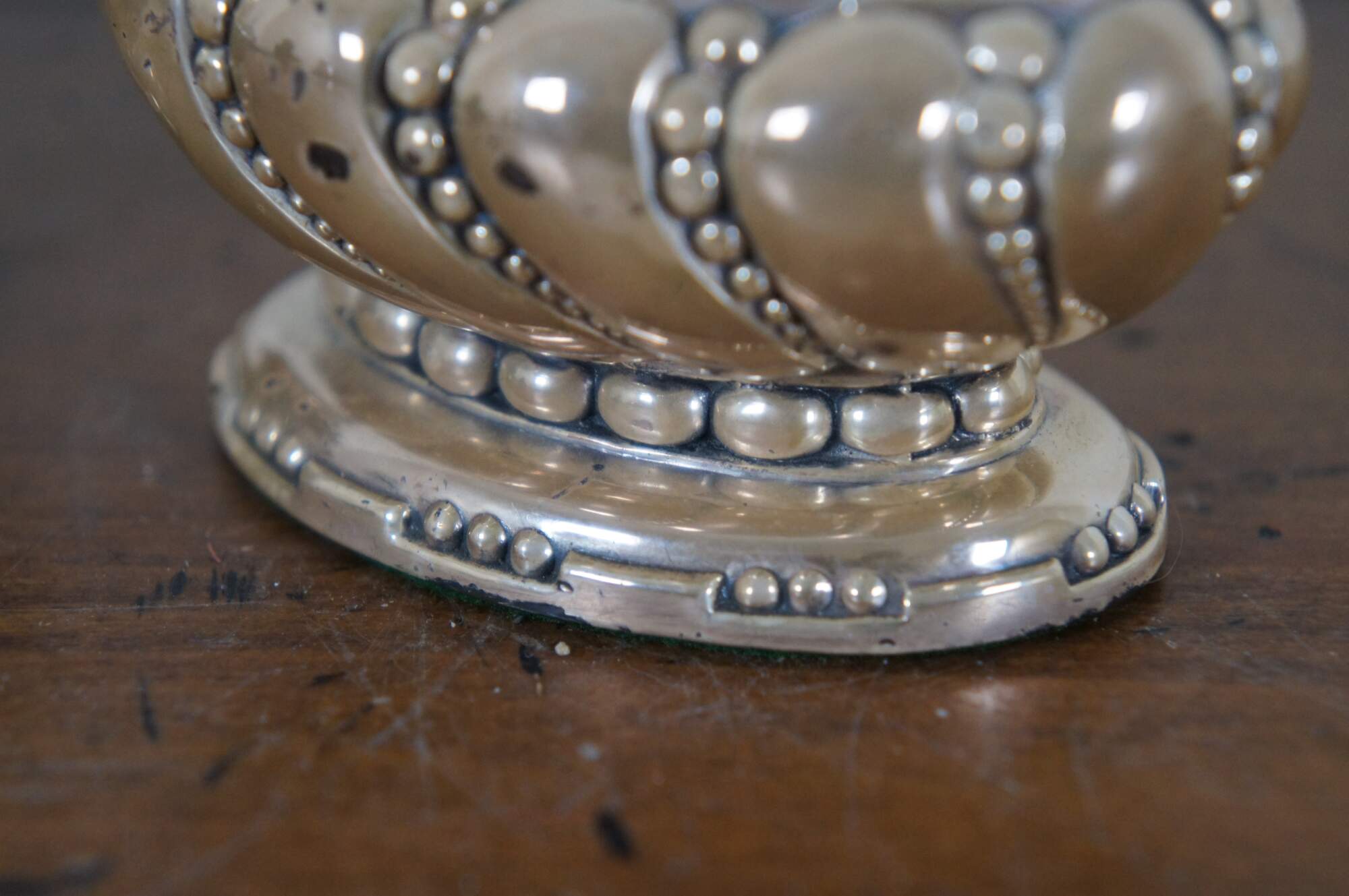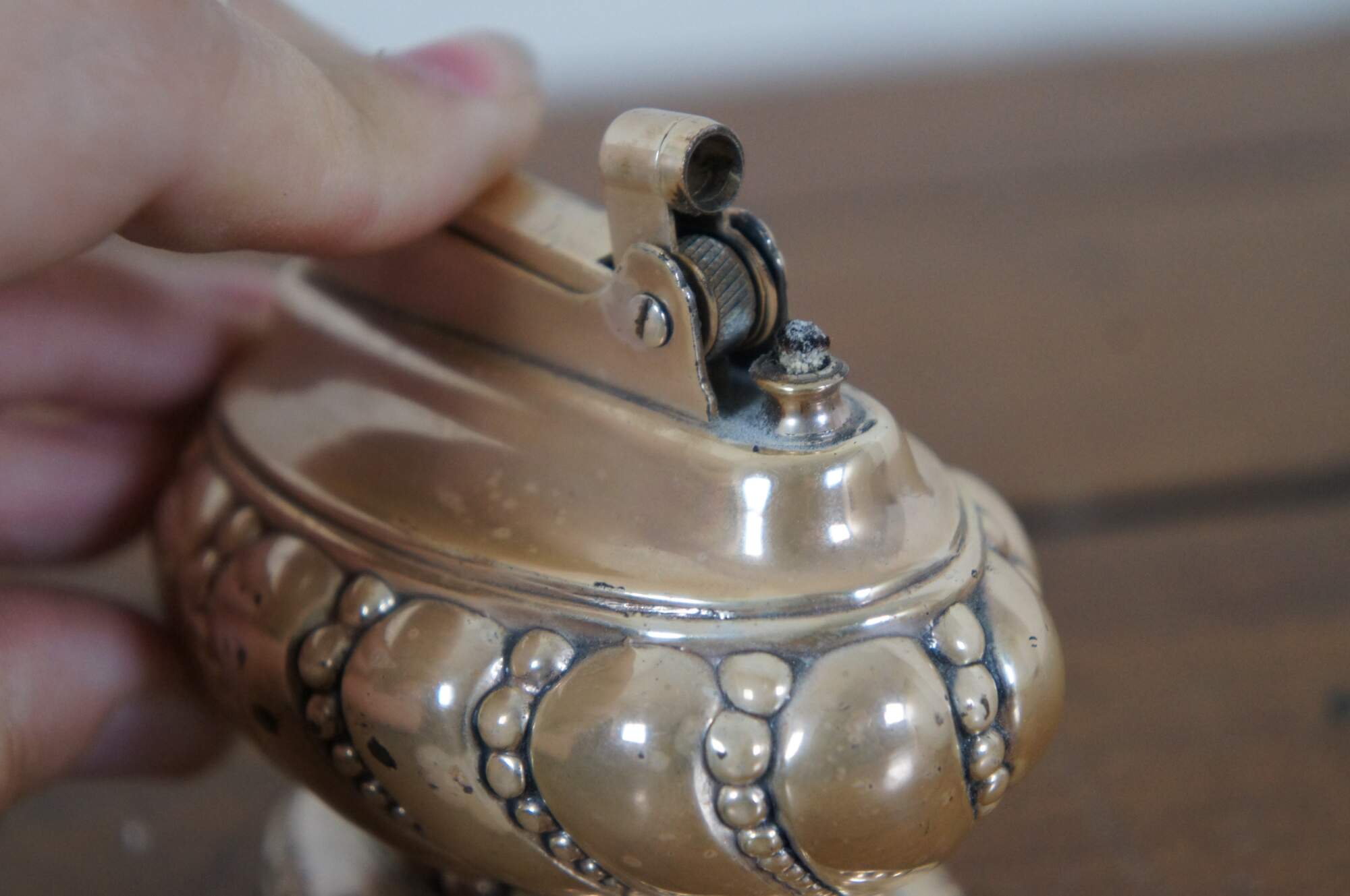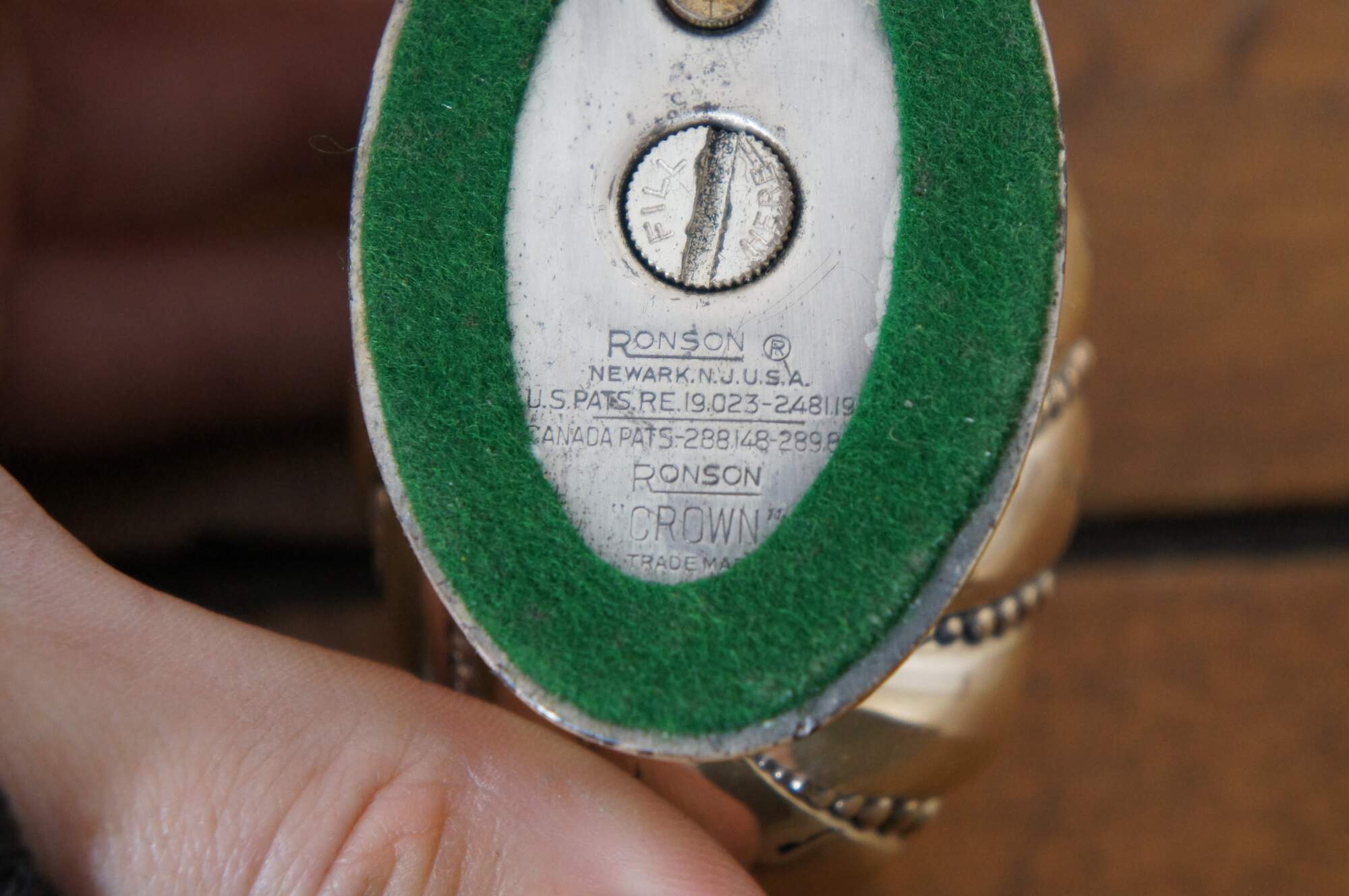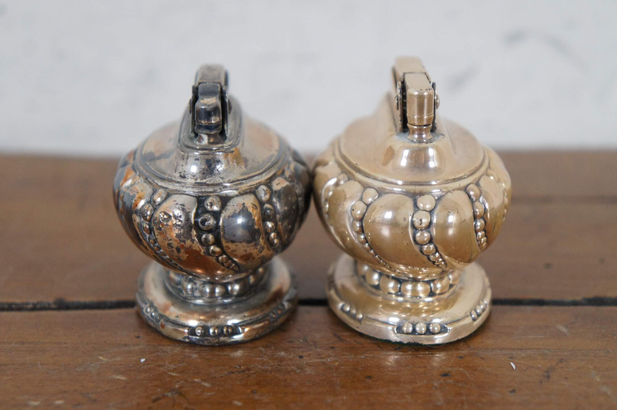 Pair mid 20th century Ronson "Crown" tobacco table lighters featuring a footed oval body molded with swirling beaded details.