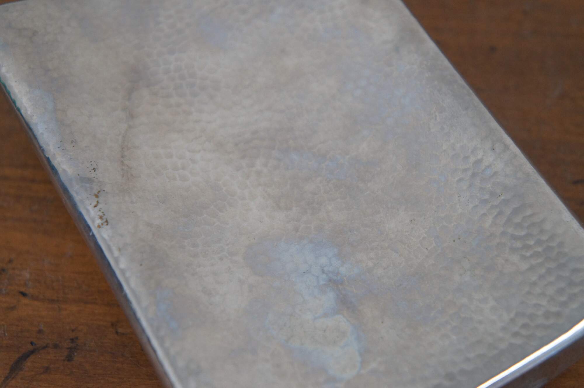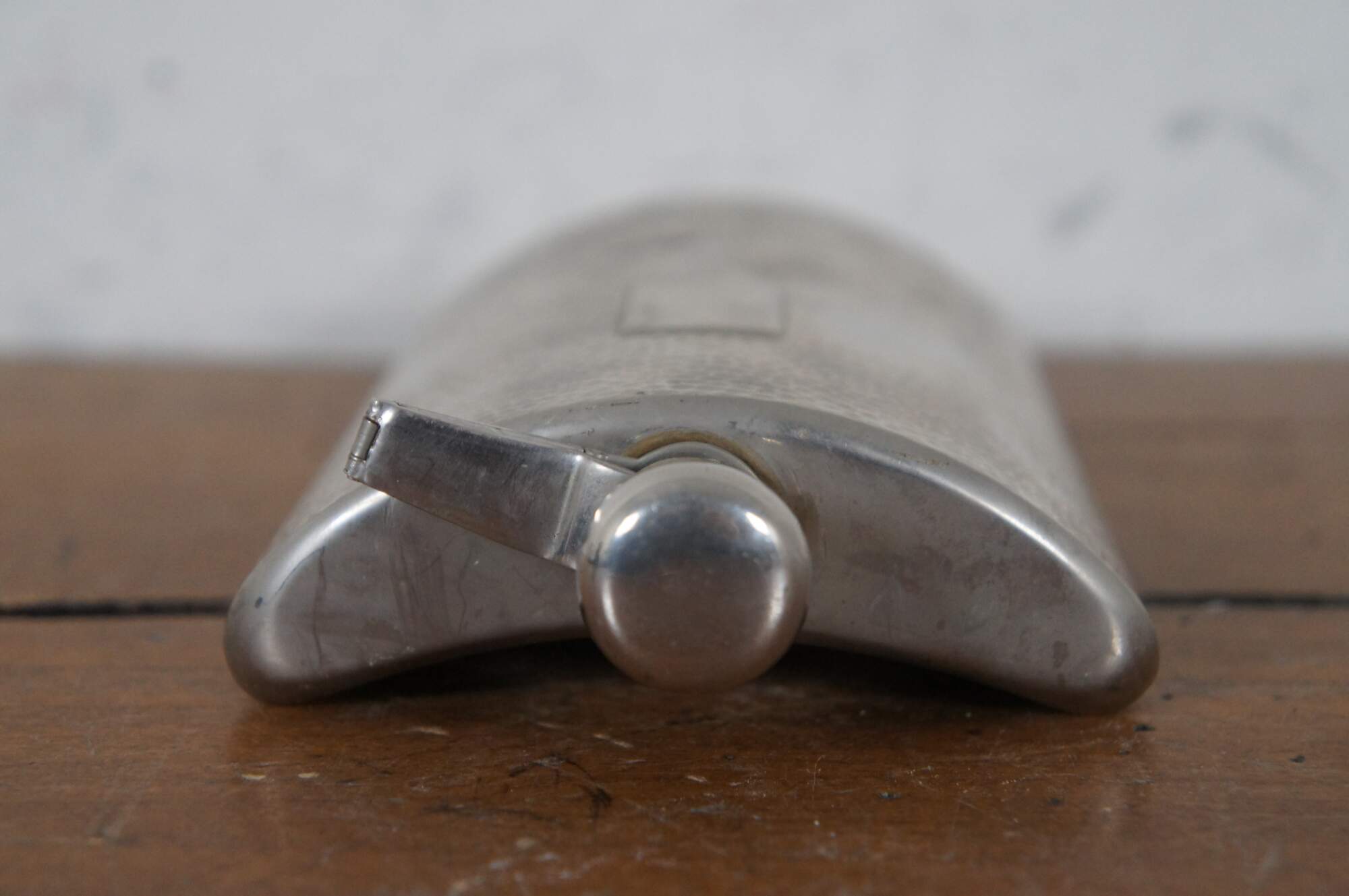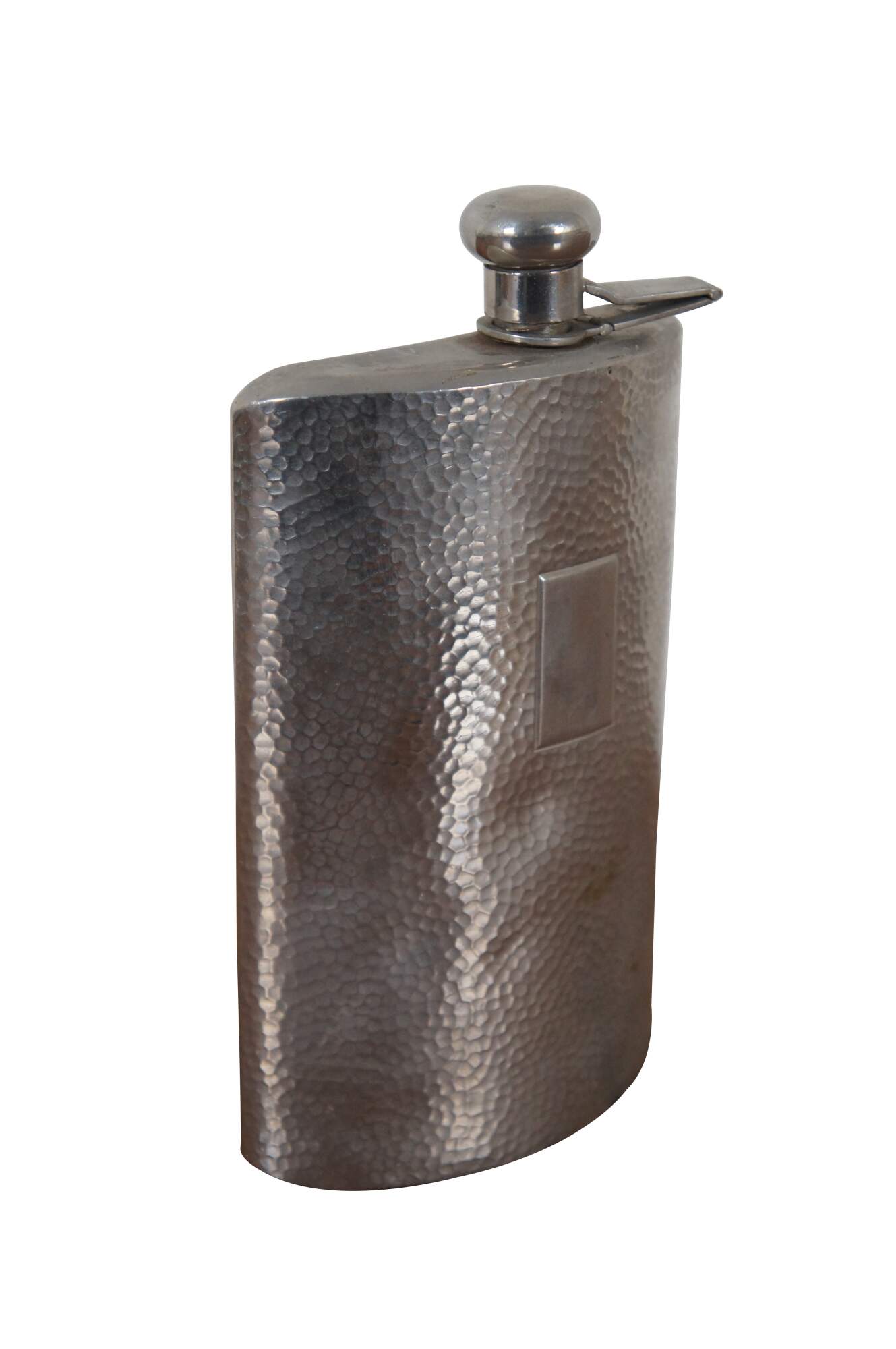 Antique hammered silverplate large hip flask with cork lined flip top and rectangular panel on the front for a monogram. Marked Germany on base. Triangular mark on lid hinge.