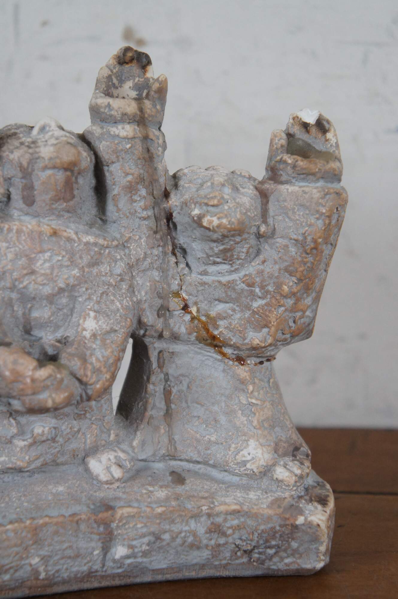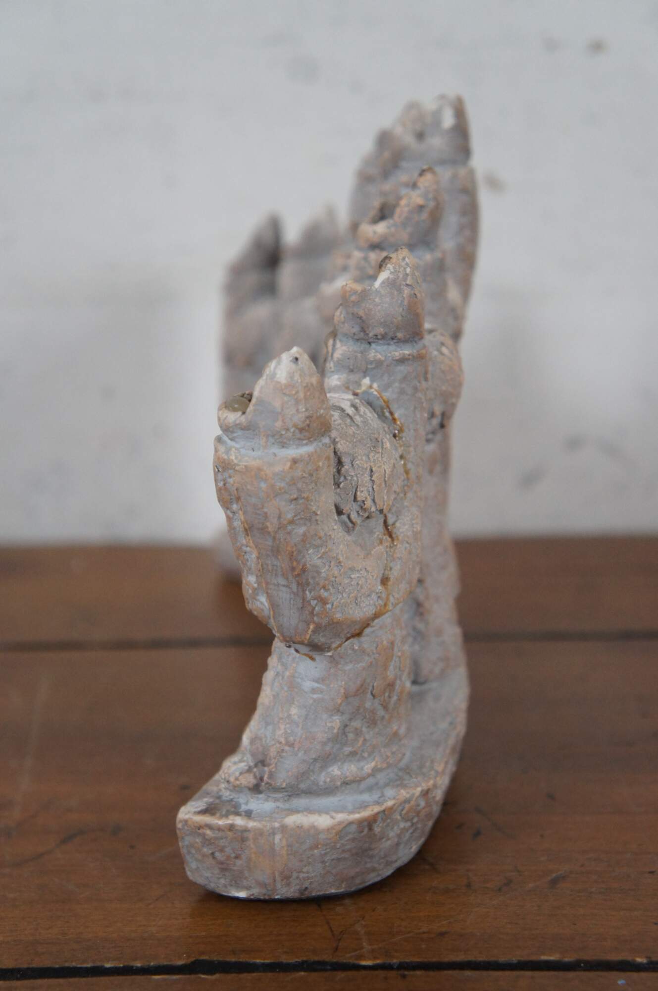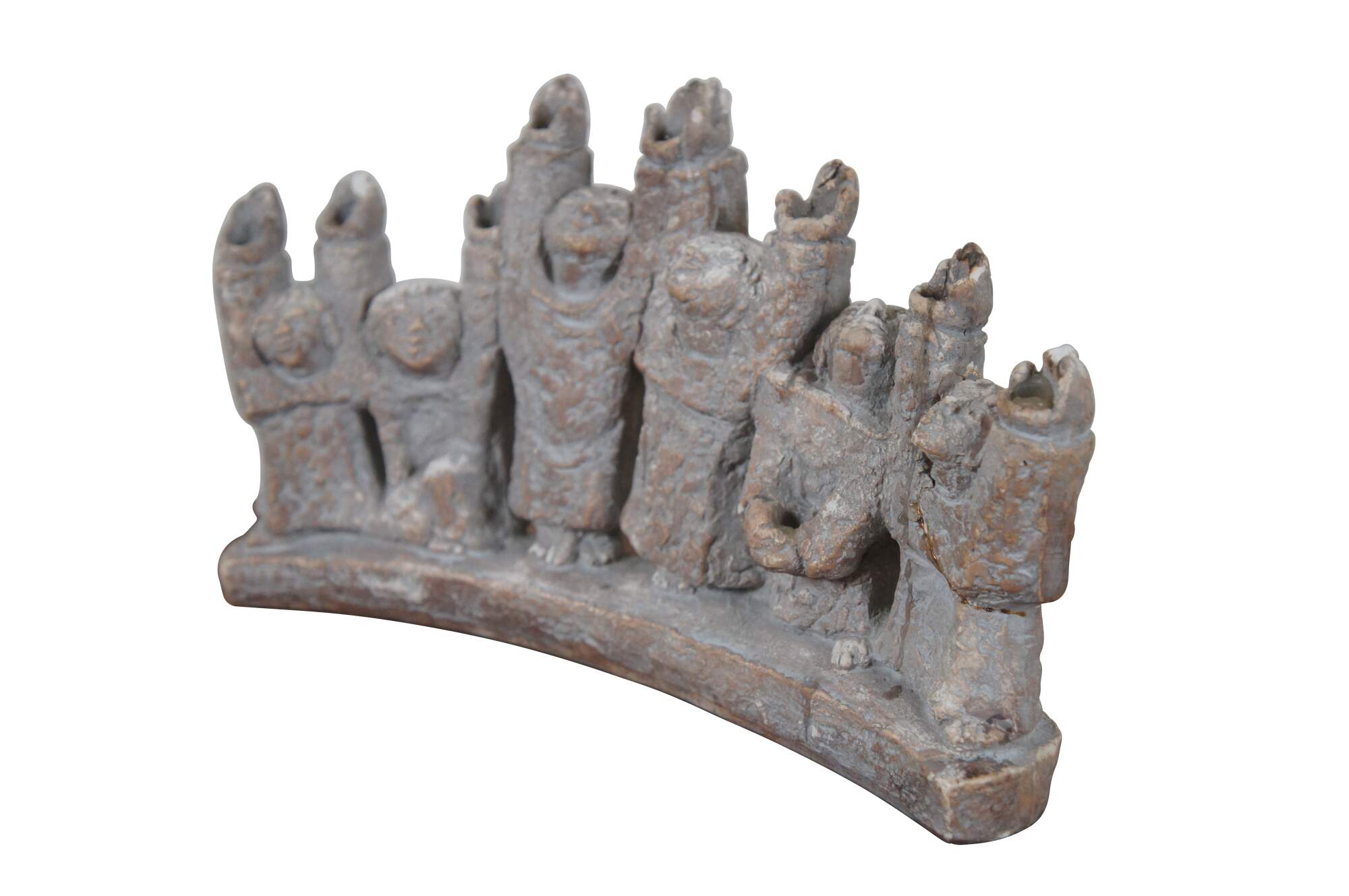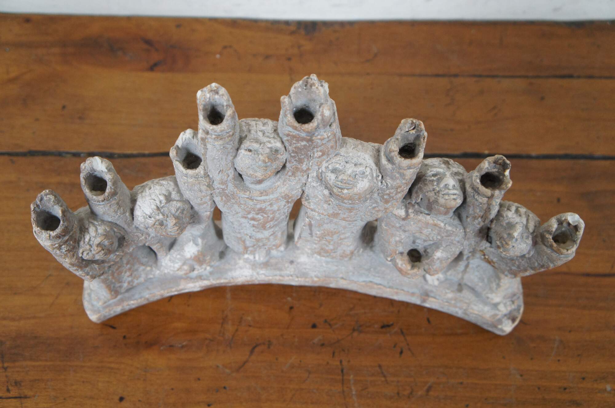 Vintage 1965 ceramic brutalist Durastone Hanukkah menorah produced by Austin Products Inc (designed by Ellen Lord), shaped by 6 human figures (Maccabees) standing in an arch, their arms and faces raised up. Candles sit in the hands.