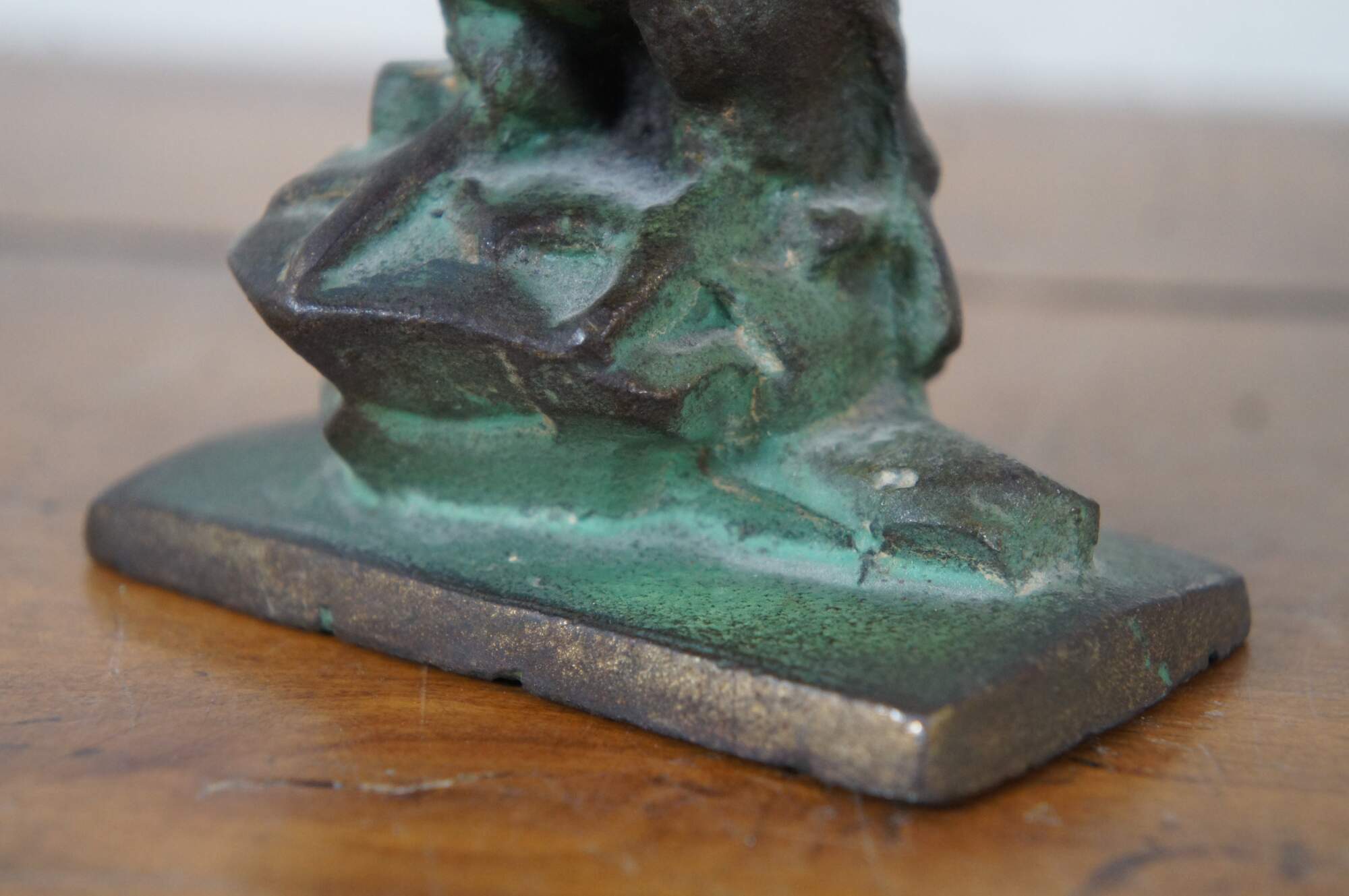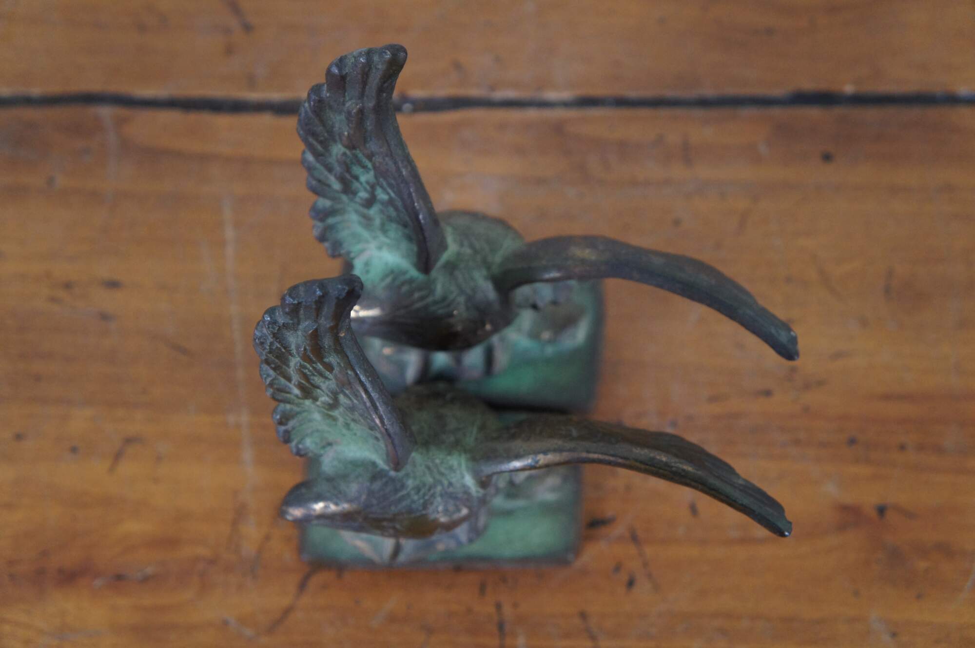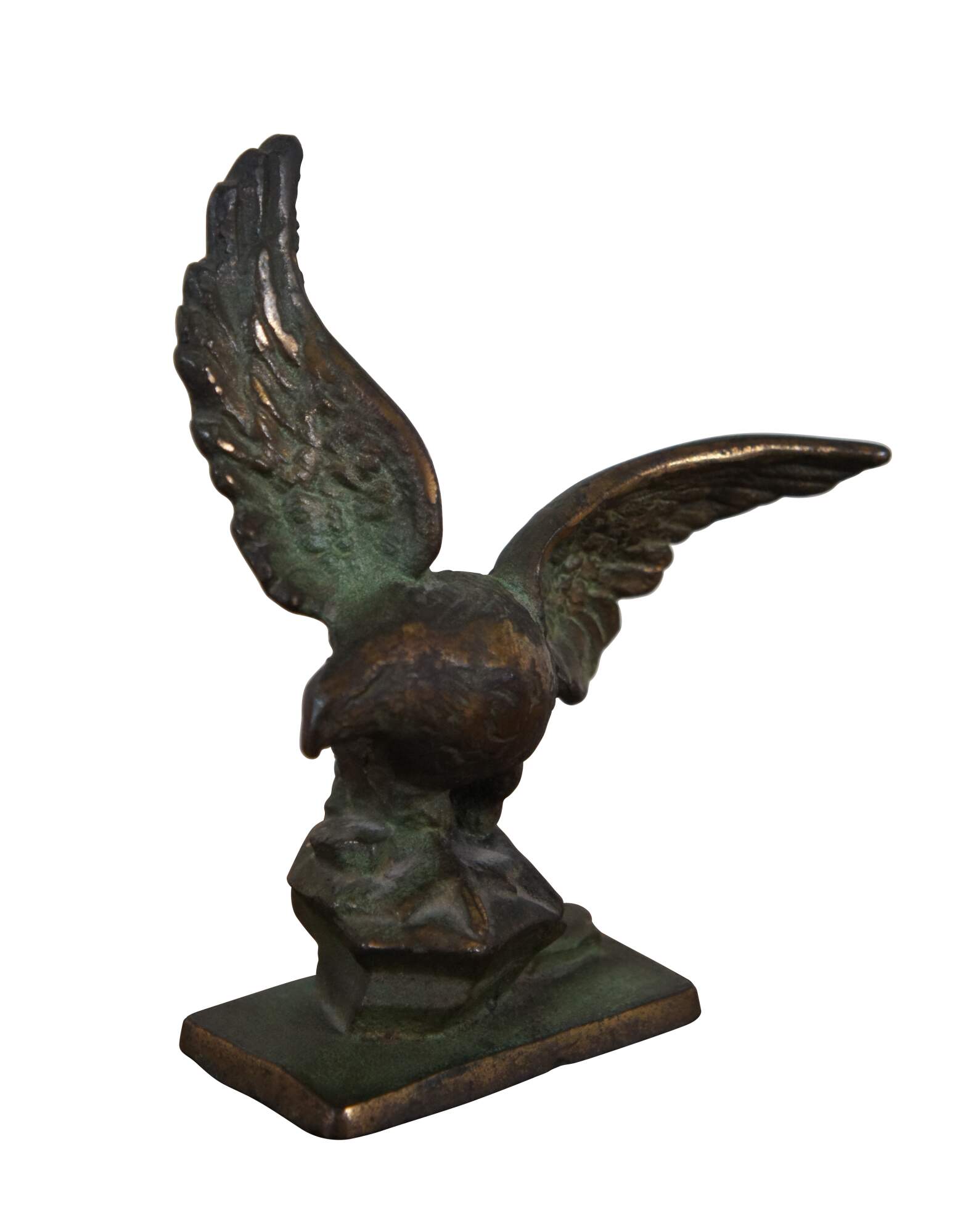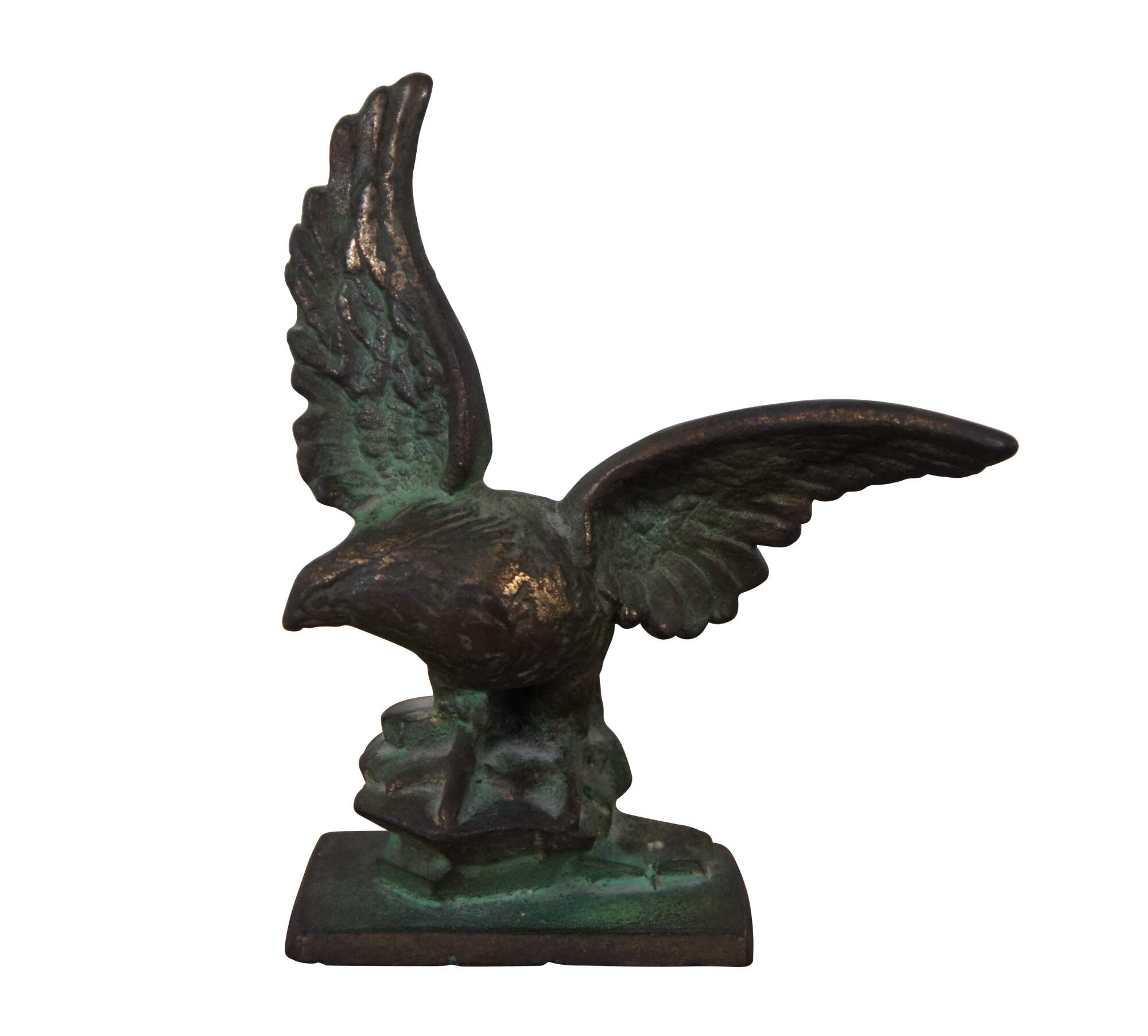 Pair of antique early 20th century cast bronze book ends in the shape of eagles with wings outstretched, perched on a pedestal of rocks.