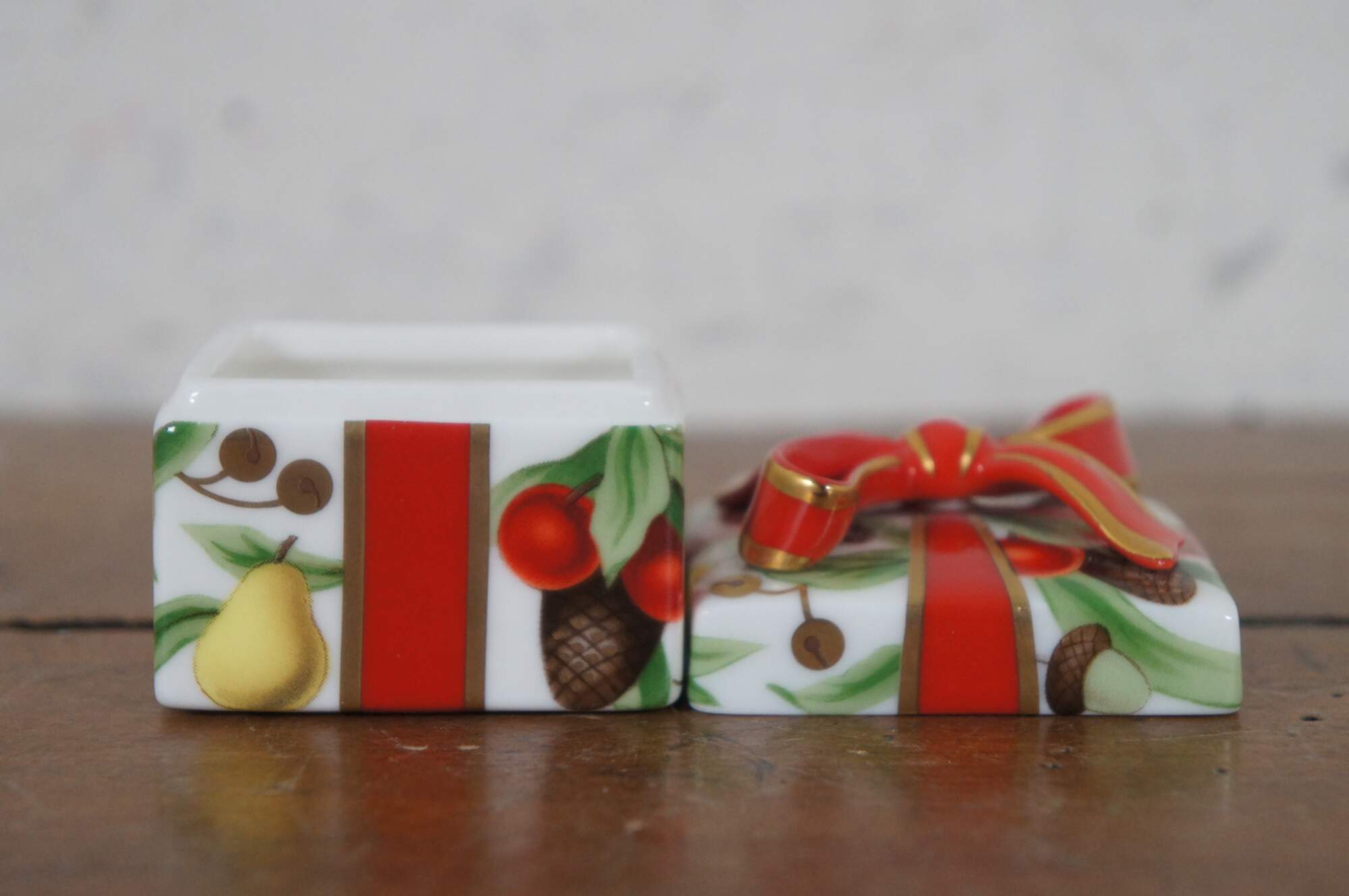 Vintage Tiffany and Company "Tiffany Holiday" white porcelain limoge style trinket box in the shape of a square Christmas gift tied with a red bow and hand painted gilt details, litho printed with a design of bells, cherries, pinecones, pears and acorns. Made in Japan.