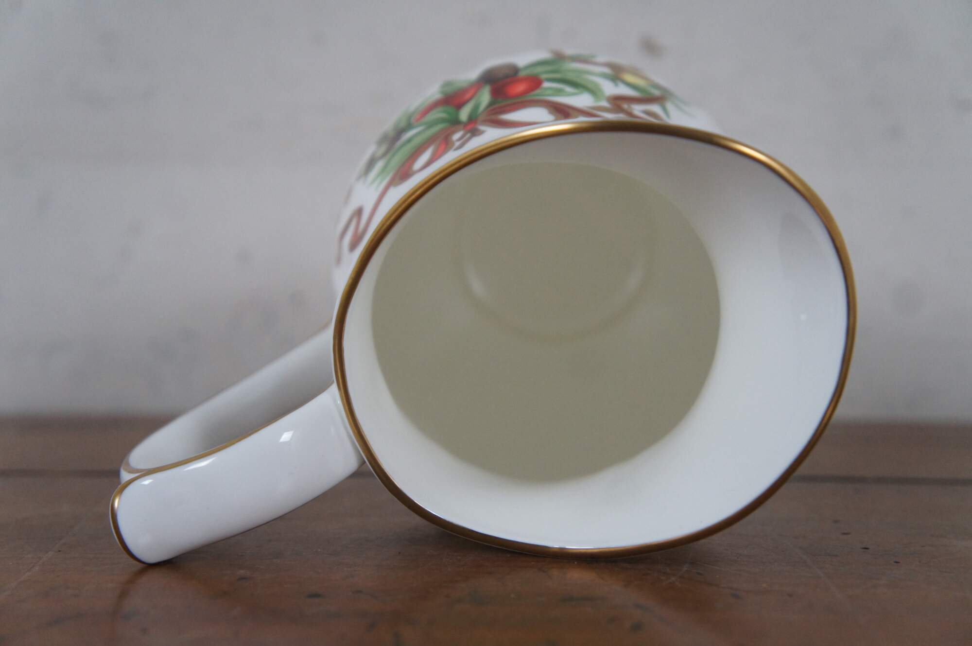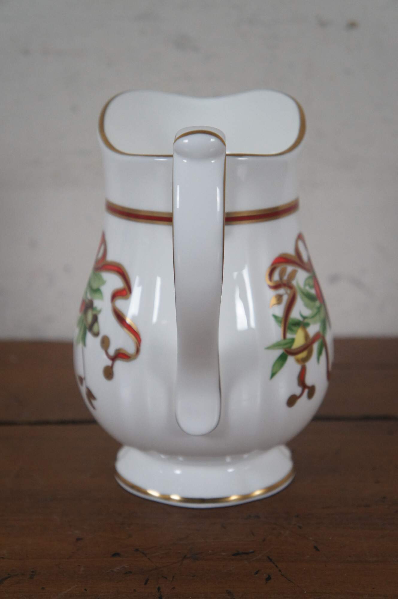 Vintage Tiffany and Company "Tiffany Holiday" white porcelain creamer / pitcher, hand painted with gilt details, litho printed with a design of cherries, pinecones, pears, bells, and acorns, tied with a red ribbon. Made in Japan.