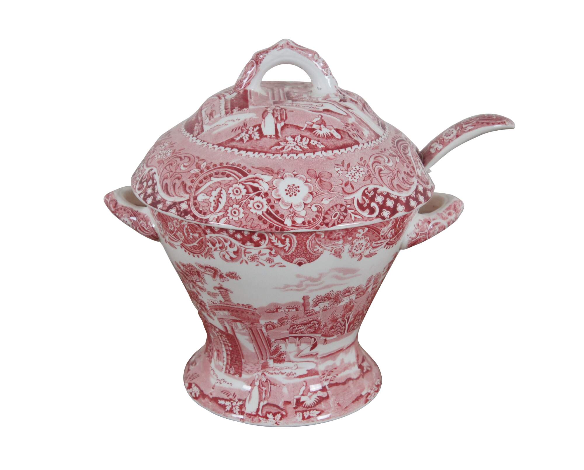 Antique rare complete supper set by W.R. Midwinter in the Landscape pattern, including four lidded crescent shaped serving dishes, tall lidded soup tureen and matching ladle. Designed to fit on a 21" lazy susan.