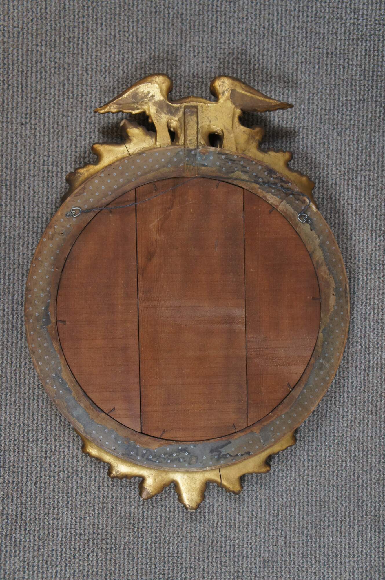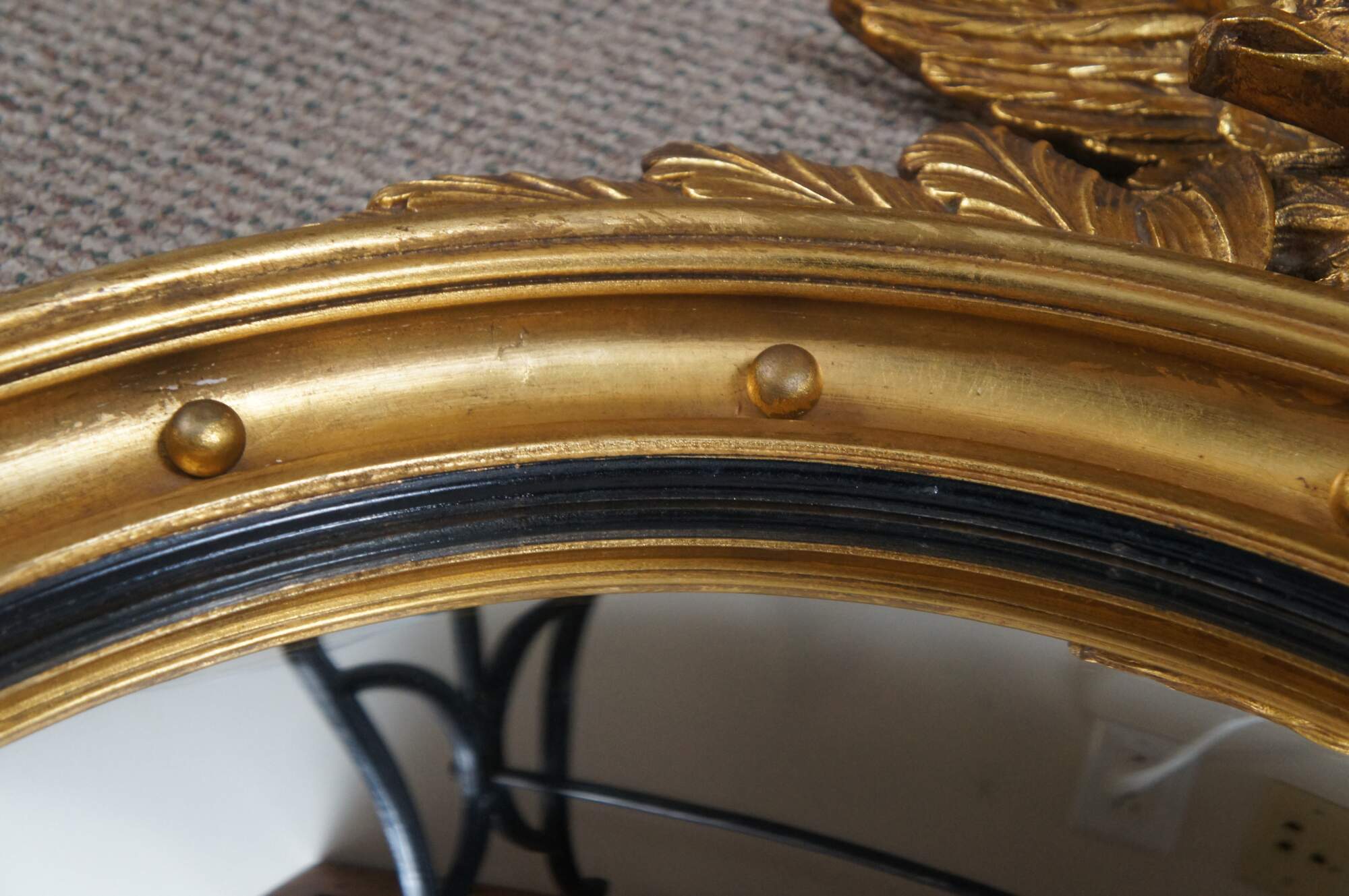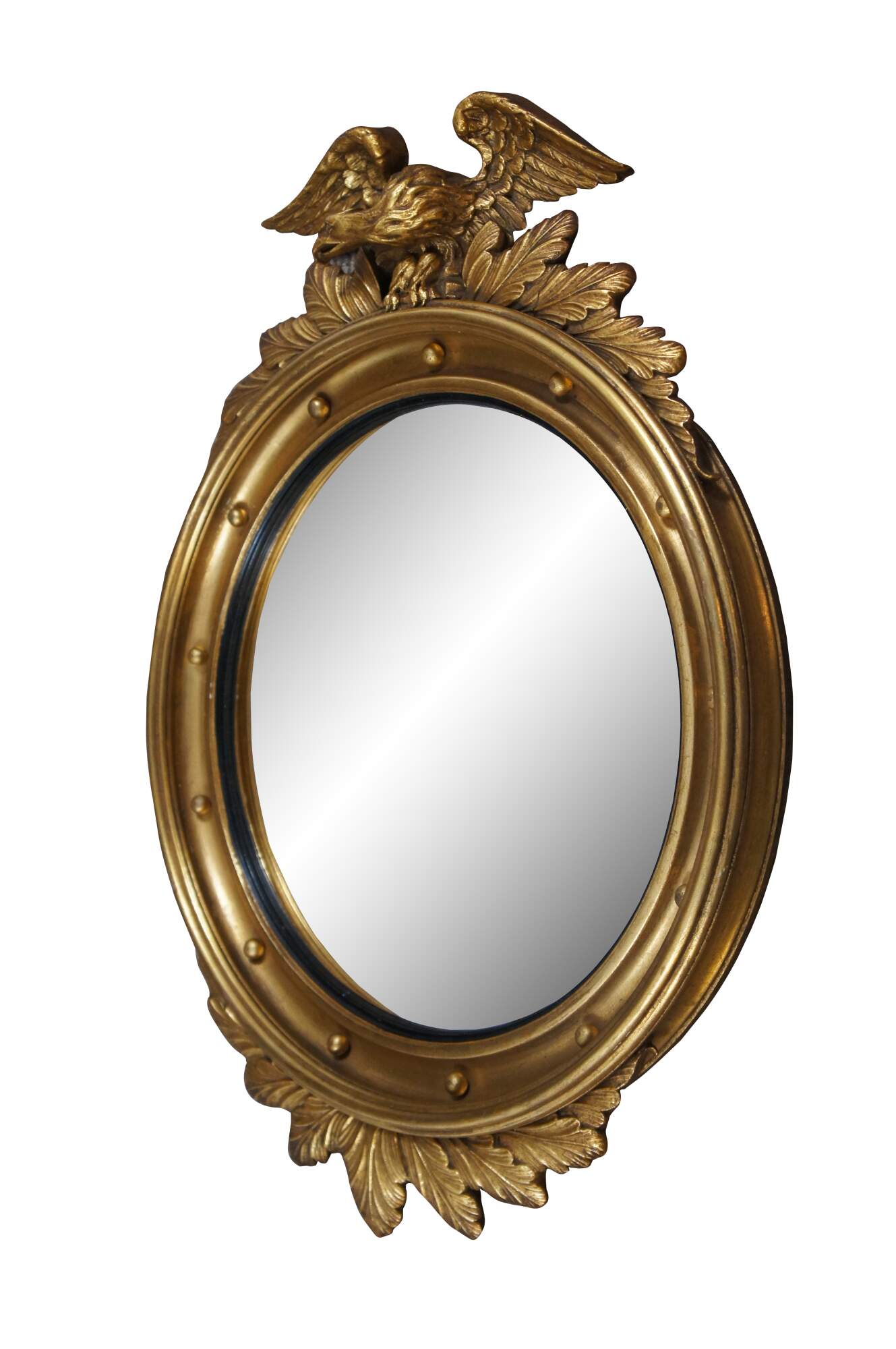 Antique 19th Century gold giltwood bullseye / convex wall mirror featuring a round frame carved with an American eagle with wings outstretched and bunches of acanthus leaves, over a beveled and braded frame with a black inner border around the convex mirror.