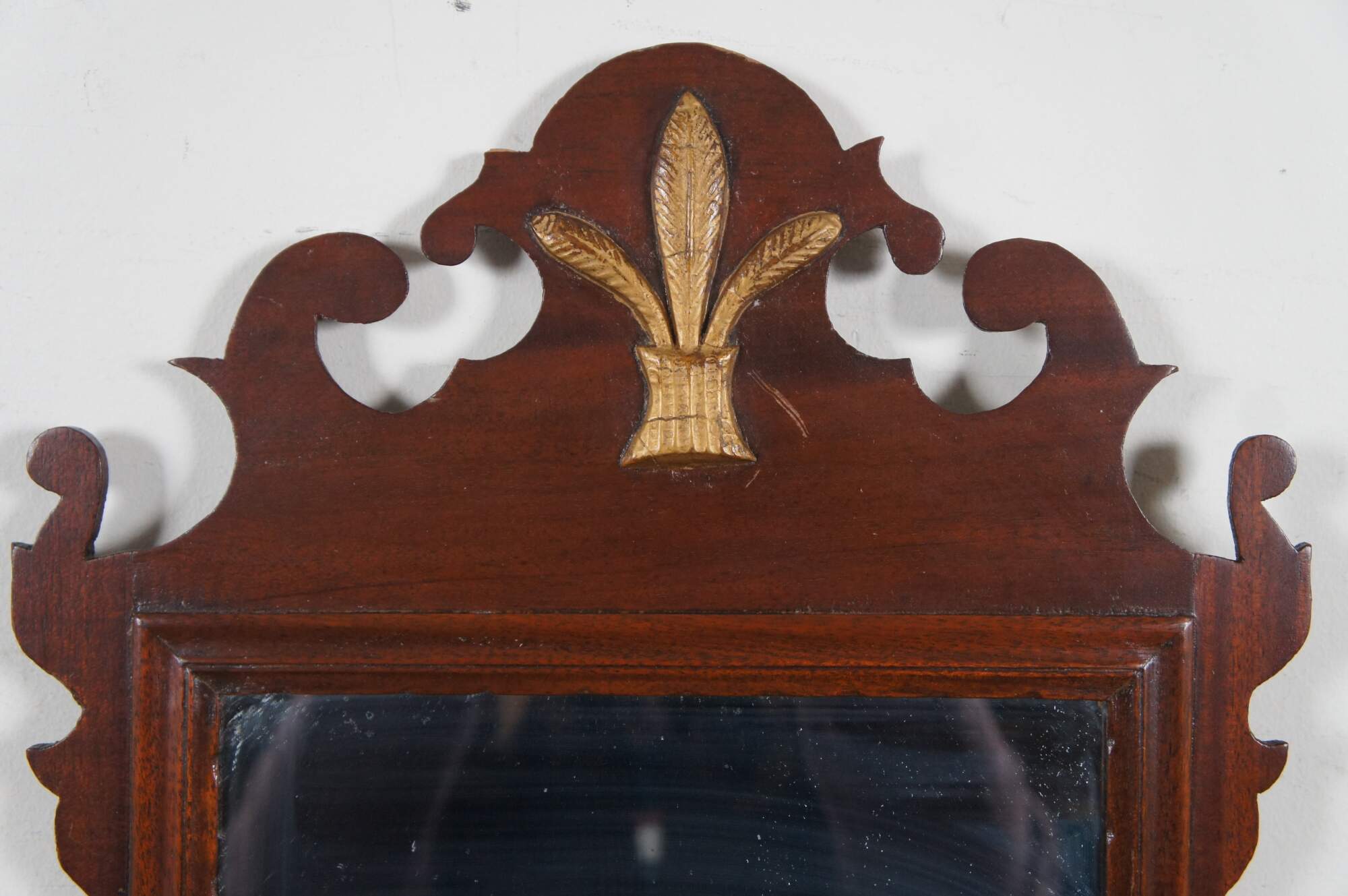 Antique mahogany American Federal style carved wall or vanity mirror with applied gilt plumage / trio of feathers accent.