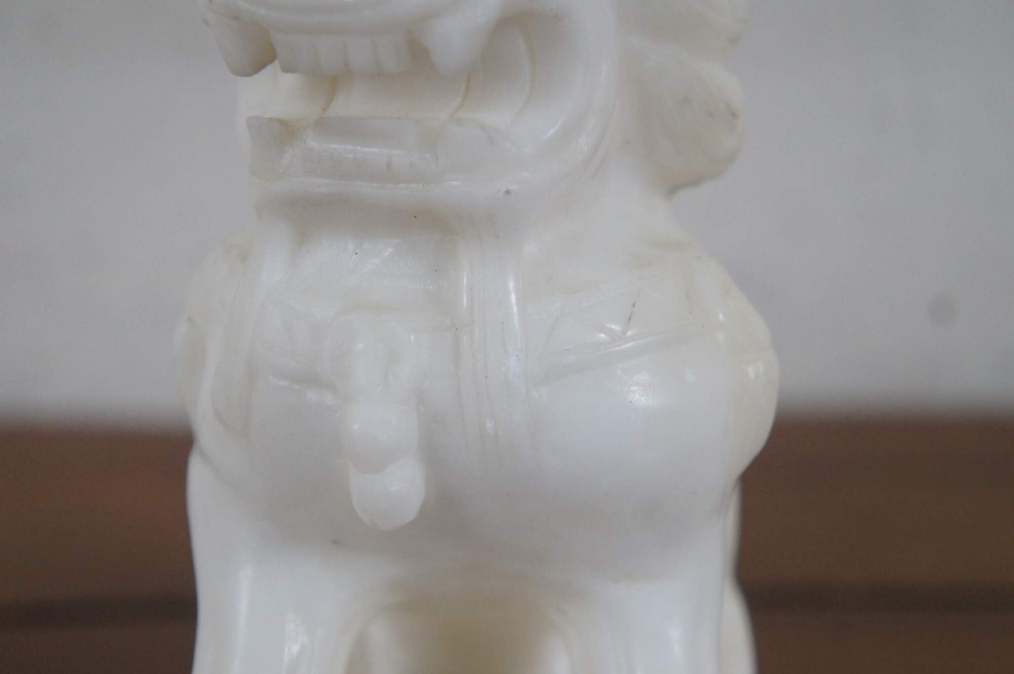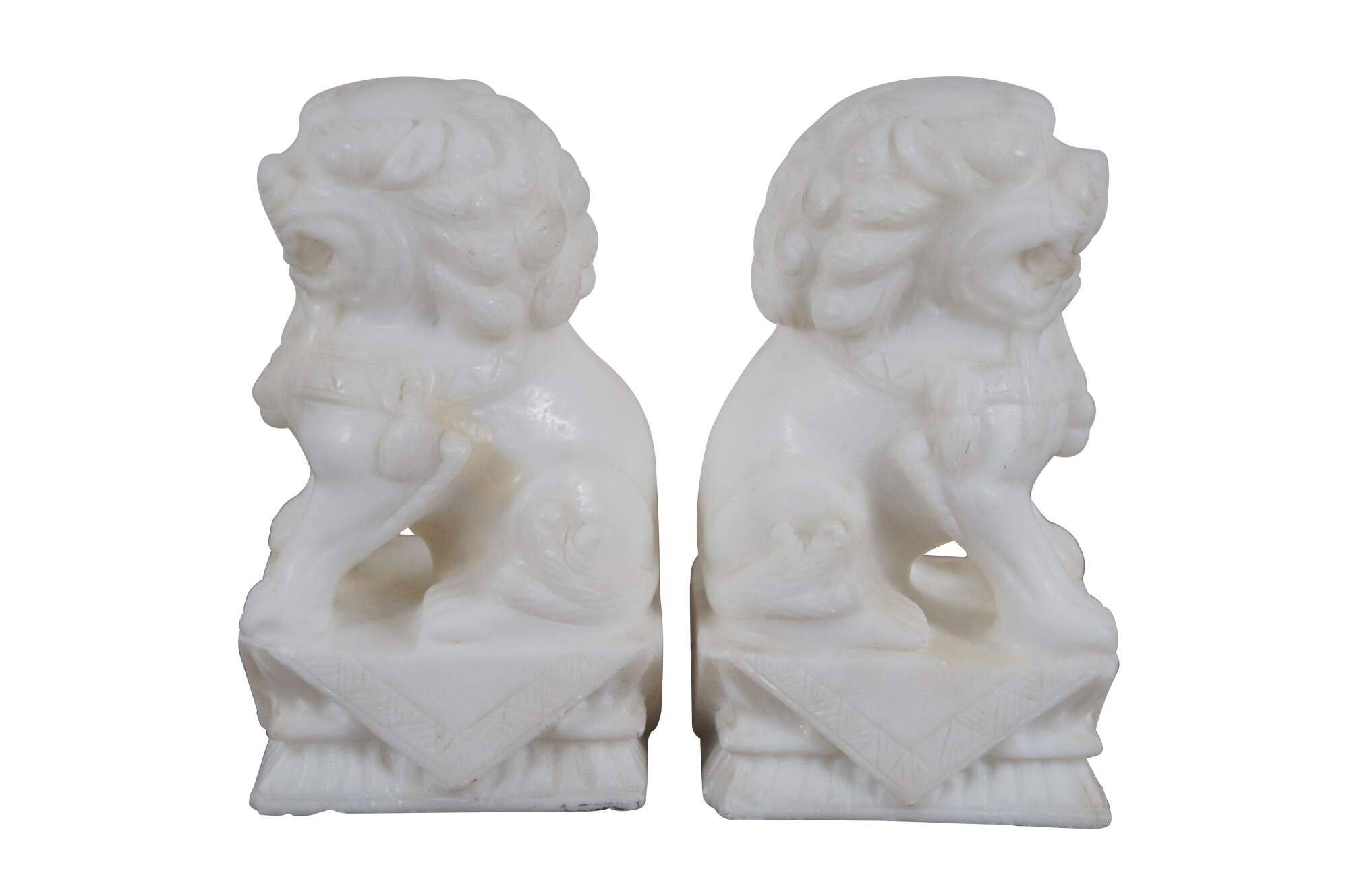 Pair of white marble carved stone fu dogs / Chinese guardian lion figurines or bookends.