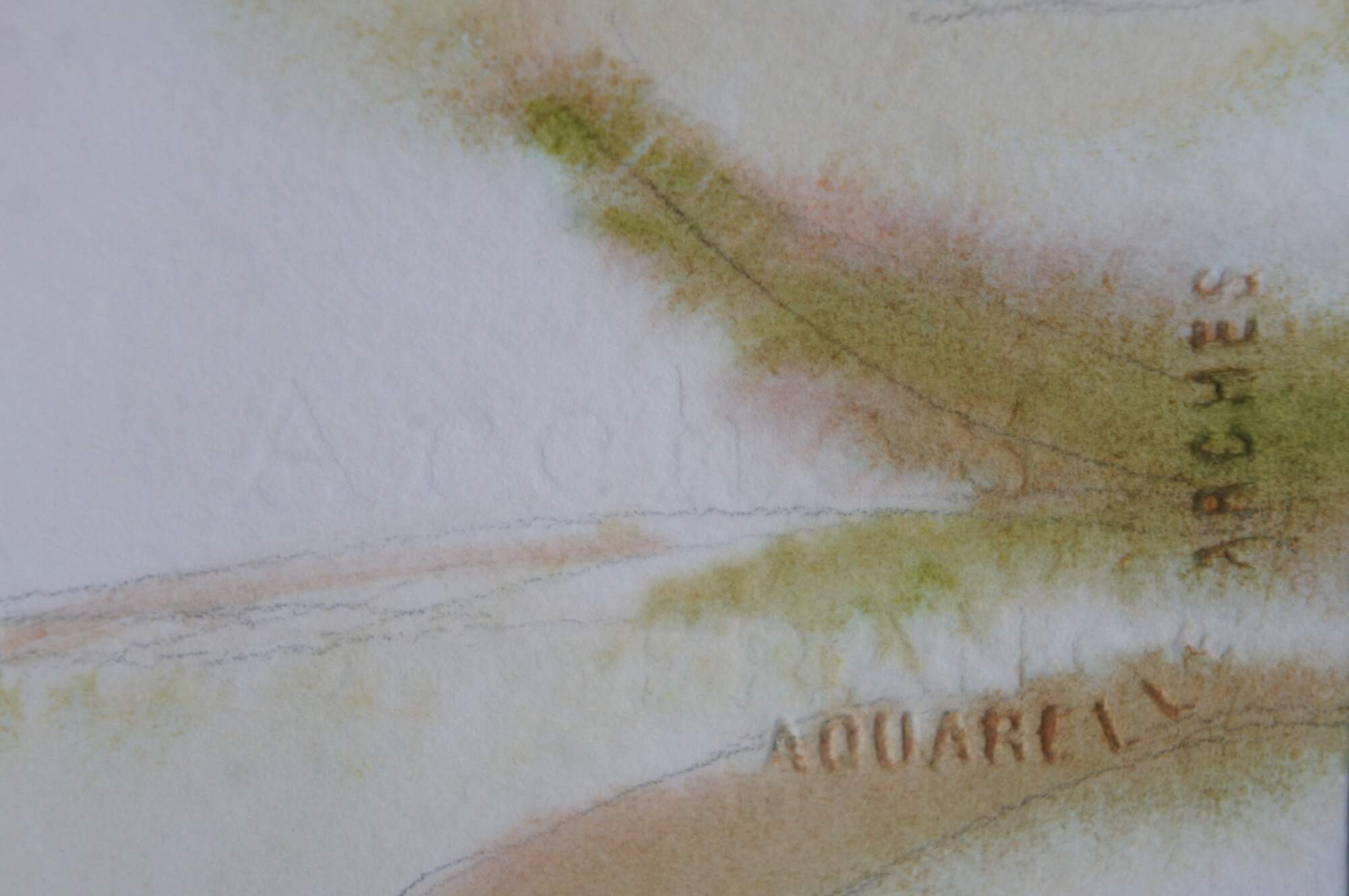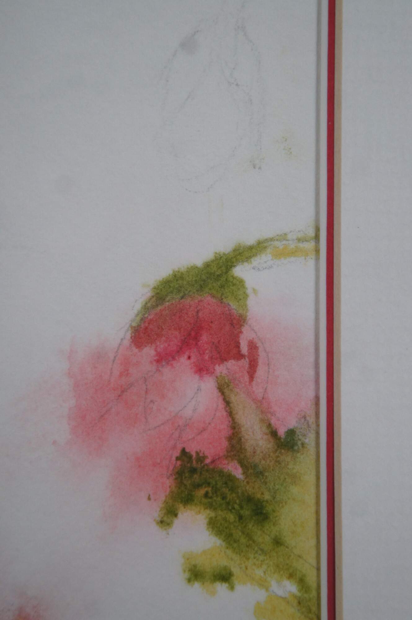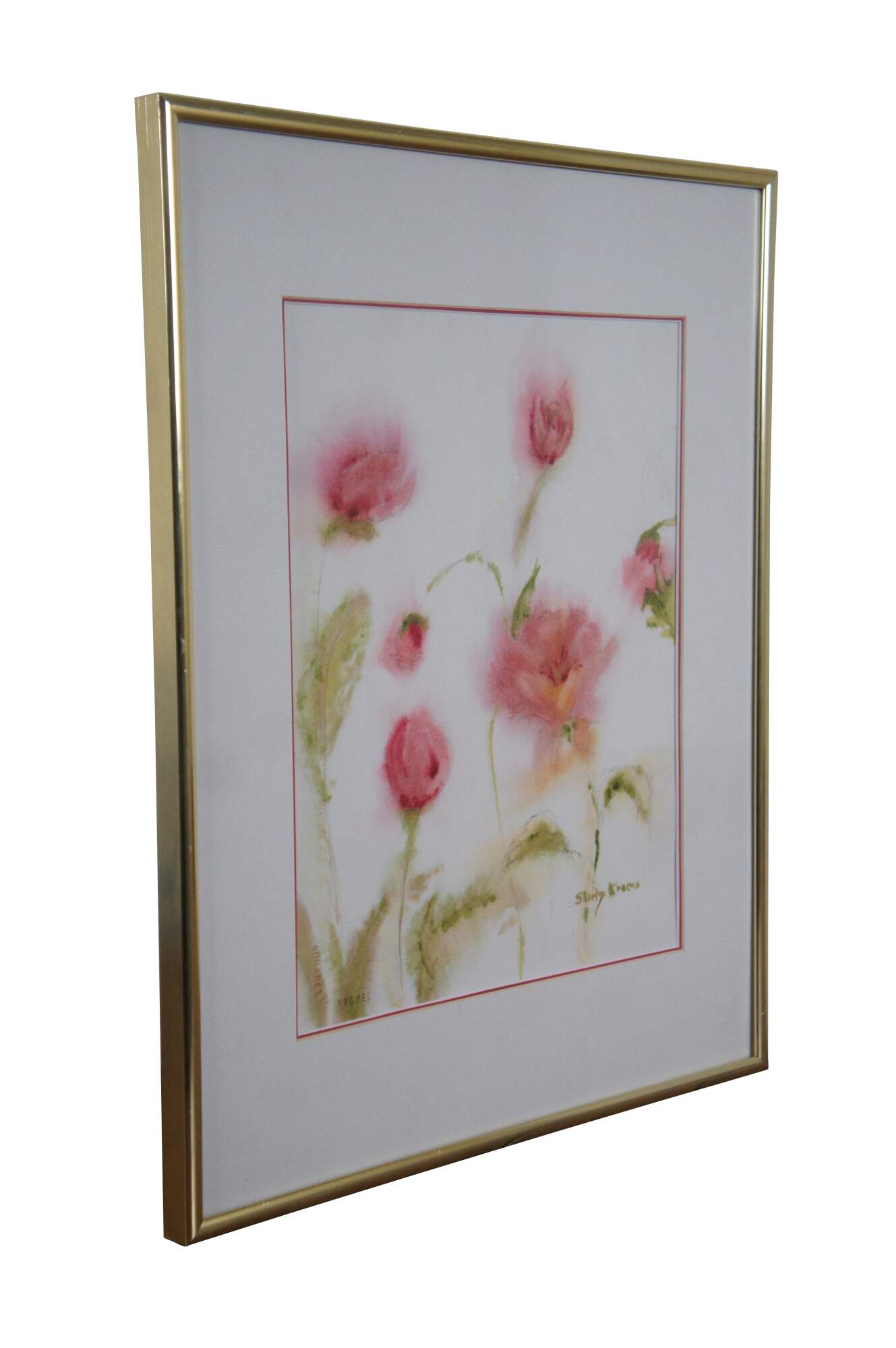 Vintage watercolor painting on aquarell arches paper of blossoming pink crocuses. Signed in lower right "Shirley Krocas." Gold metal frame, pink and white layered mat.