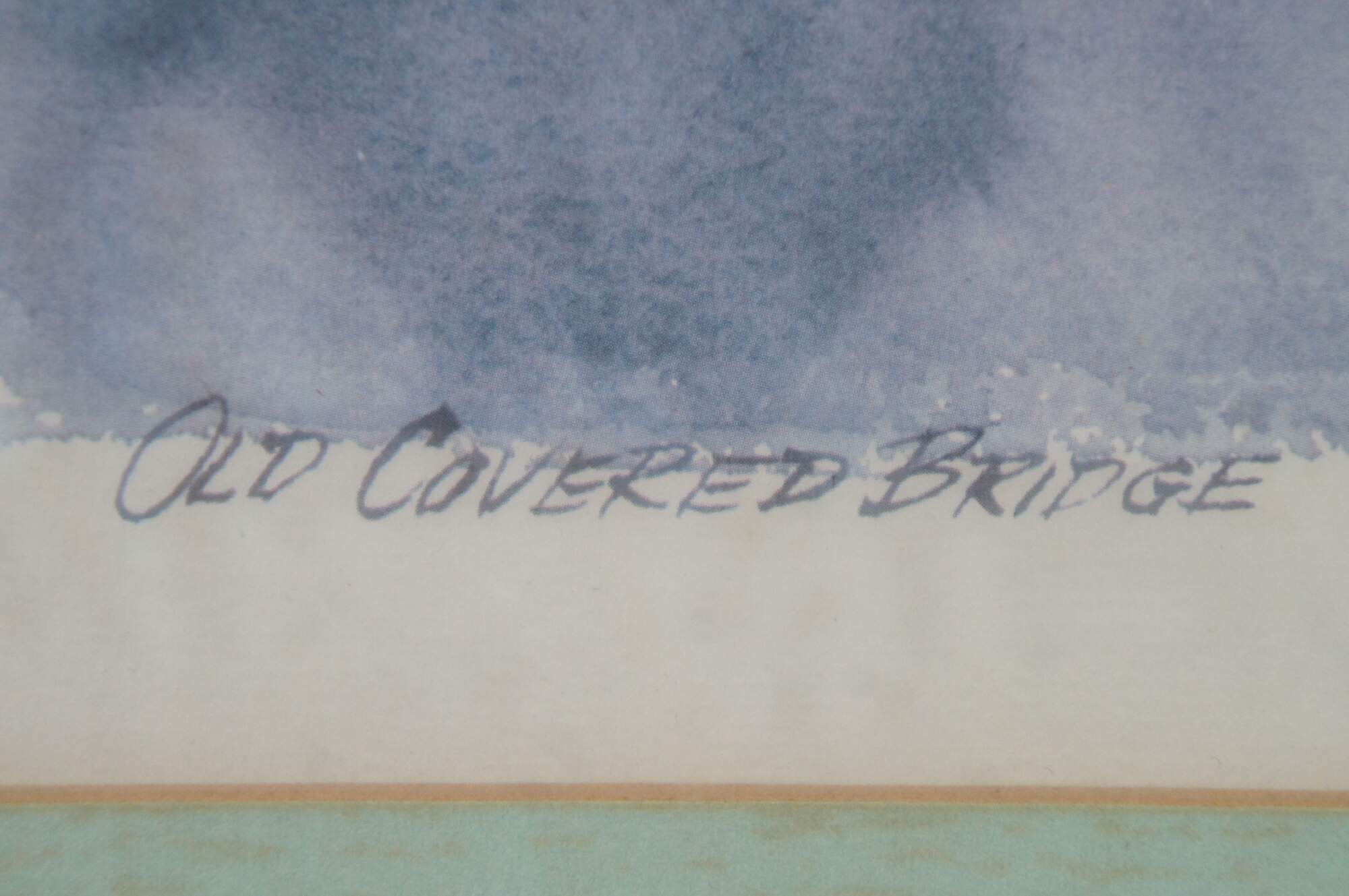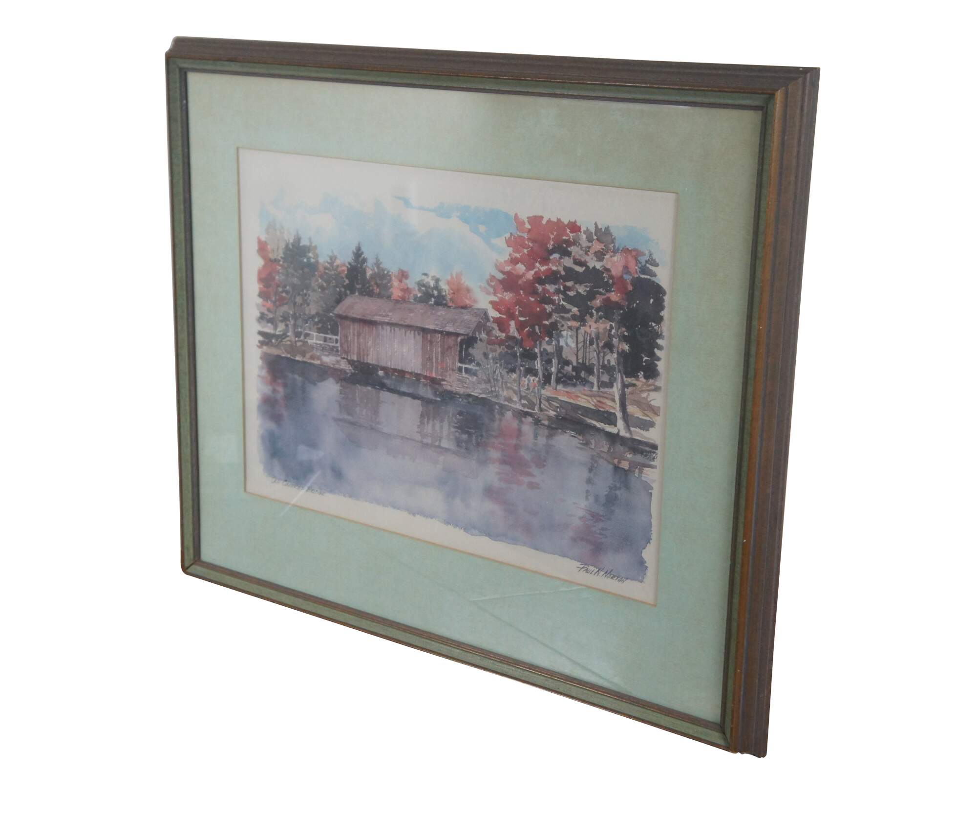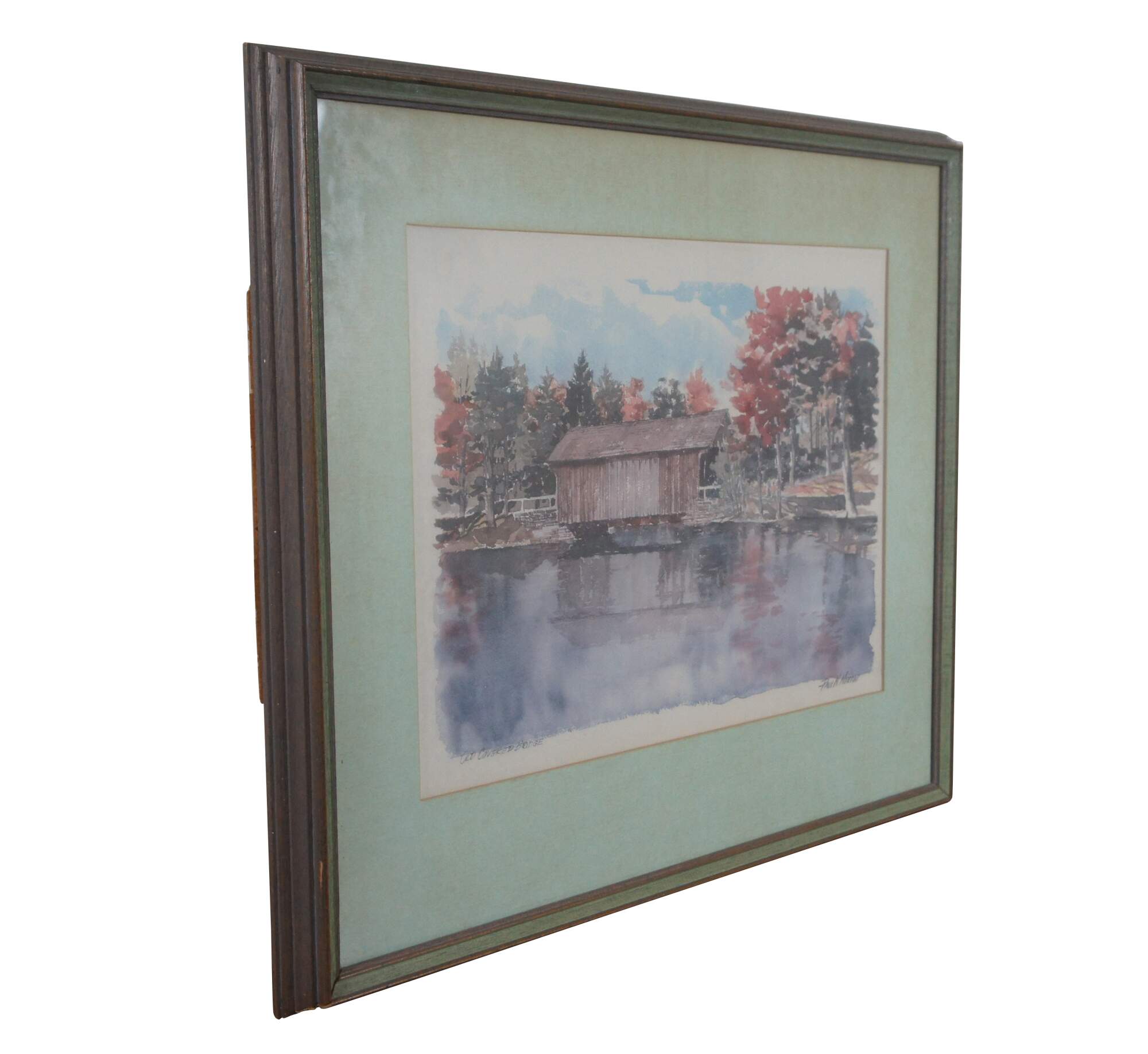 Mid century framed off set lithograph print by Paul N. Norton. Aptly titled, "Old Covered Bridge" this work features a covered bridge in Autumn, attributed to Washington States Lewis River near Cedar Creek. Signed in plate. Numbered 5215 on reverse. Wood frame with green painted bevel, green mat.