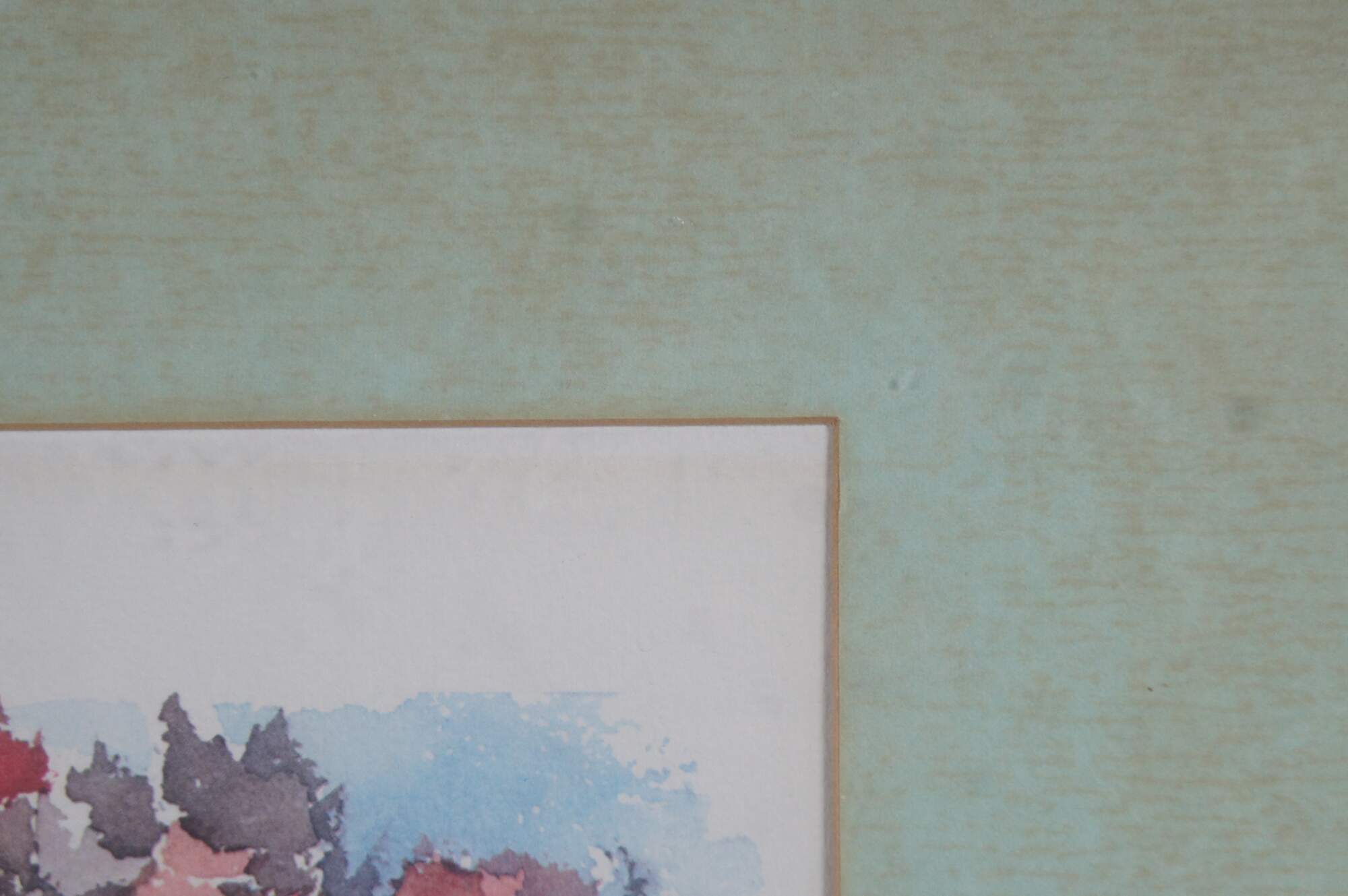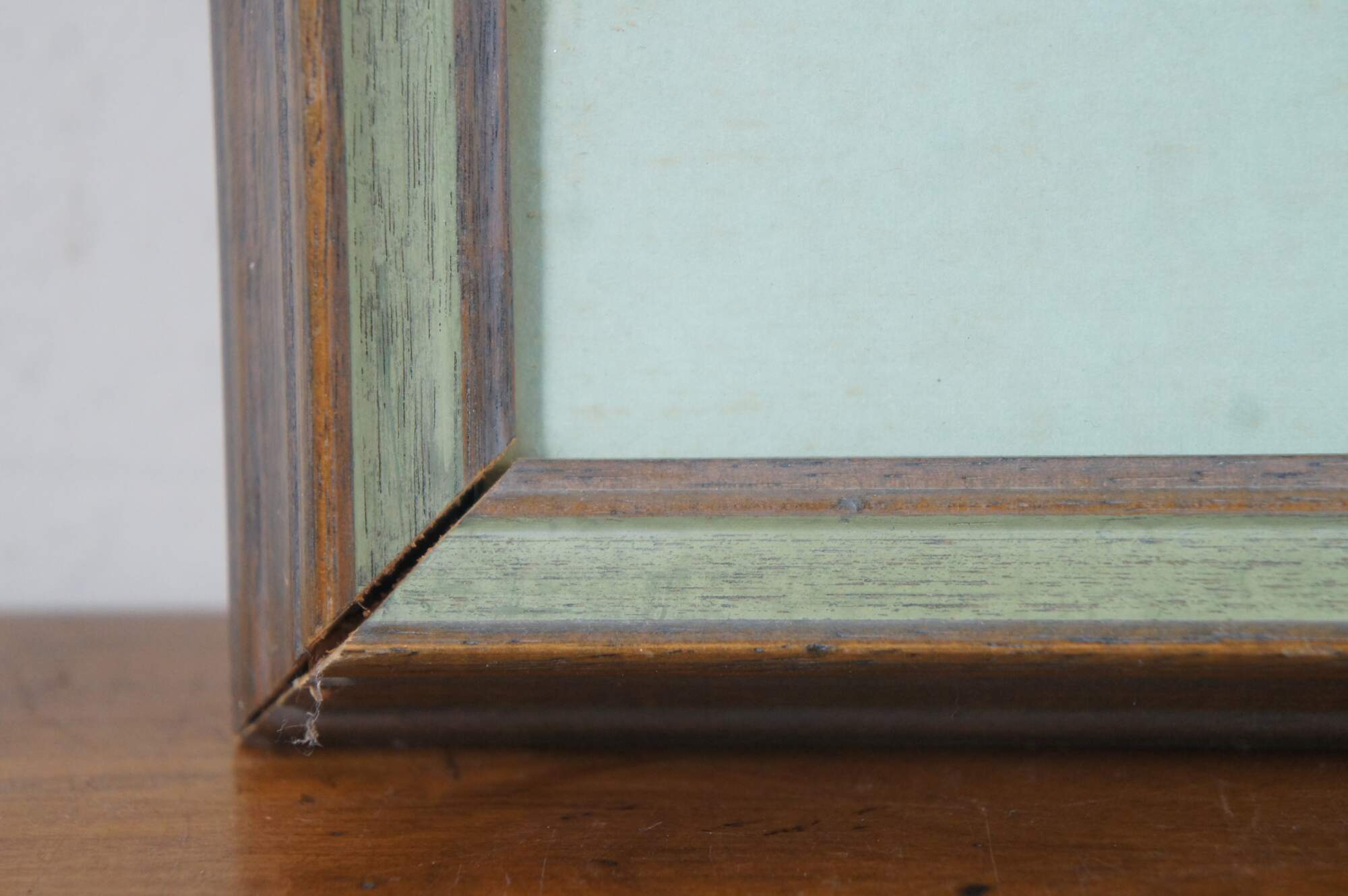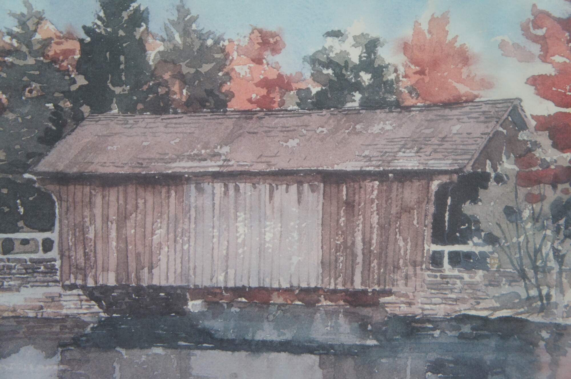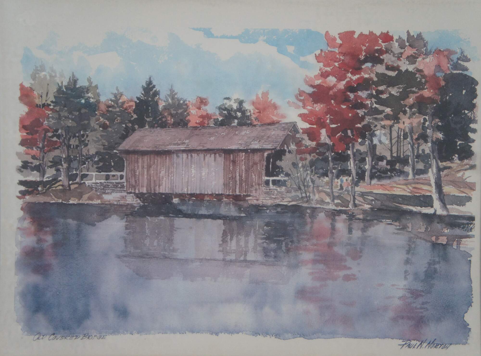 Mid century framed off set lithograph print by Paul N. Norton. Aptly titled, "Old Covered Bridge" this work features a covered bridge in Autumn, attributed to Washington States Lewis River near Cedar Creek. Signed in plate. Numbered 5215 on reverse. Wood frame with green painted bevel, green mat.