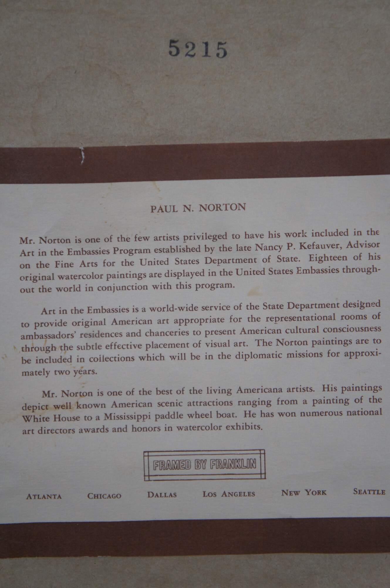 While Paul N. Norton won prestigious national commissions and traveled extensively in Europe, he may be best remembered as a master of the familiar. He painted subjects near and dear to himself and the fellow members of his midwest community known as the Quad Cities - Mississippi River scenes, local historic landmarks, churches, schools, and parks. His paintings were reproduced by the thousands, often as part of local business promotions for a public eager to own a piece of his artwork. His most popular works include paintings of the Delta Queen, Lone Star, and Quinlan riverboats, the Lincoln Memorial and U.S. Capitol Buildings. His first federally commissioned work was presented to Congress in 1971, and he went on to share an audience with President Ronald Reagan in 1981 while presenting a painting of the White House.