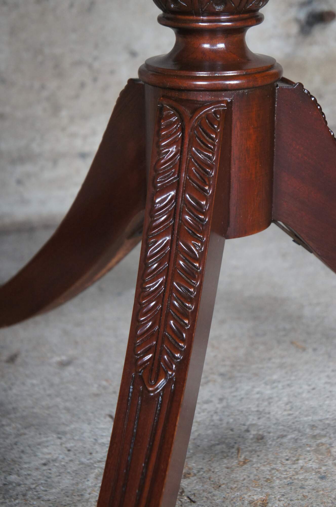 Baker Furniture English Regency style dining table. Features an impressive mahogany banded top with two leaves for extension and table pads. The table is supported by a double pedestal mahogany tripod base with shapely acanthus carved urns over three downswept legs with mirrored canthus carving and fluting. The legs are capped with scalloped brass casters. 122" fully extended