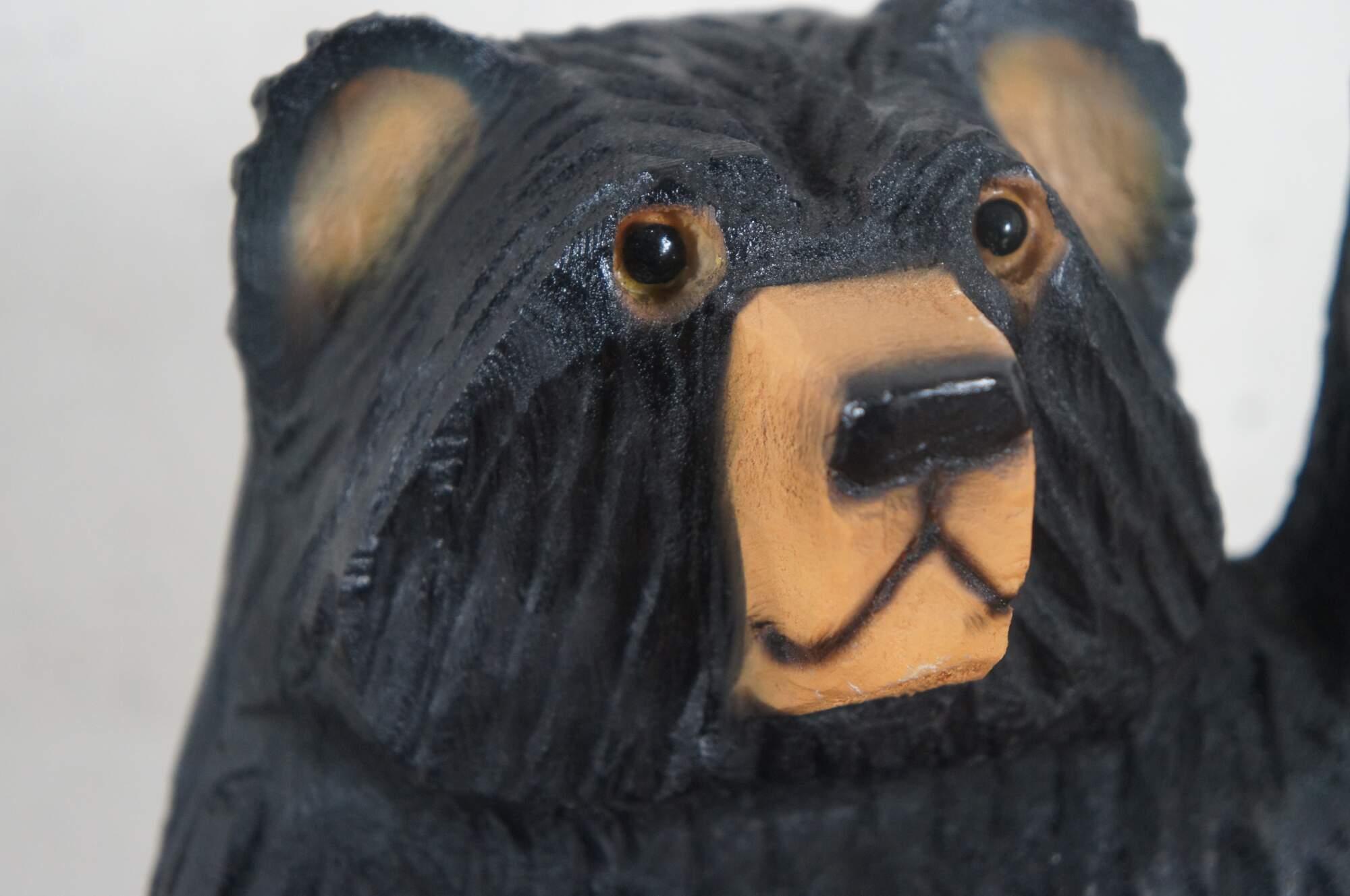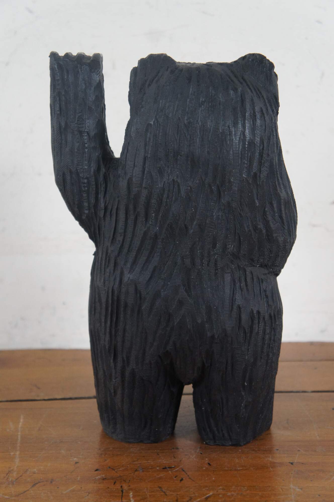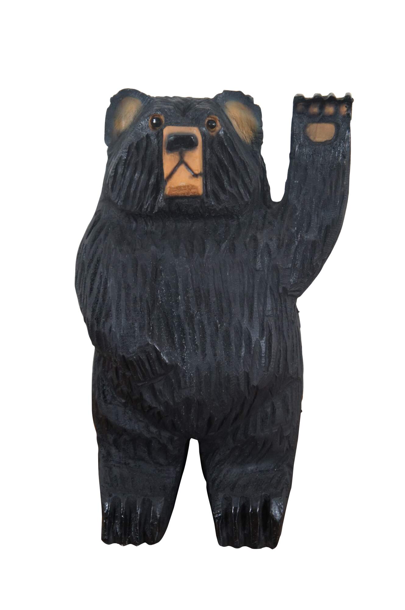 Vintage chainsaw carved wooden figurine / sculpture in the shape of a semi-cartoonish black bear standing on its hind legs with one paw raised in a wave. Rustic hunting lodge decor.