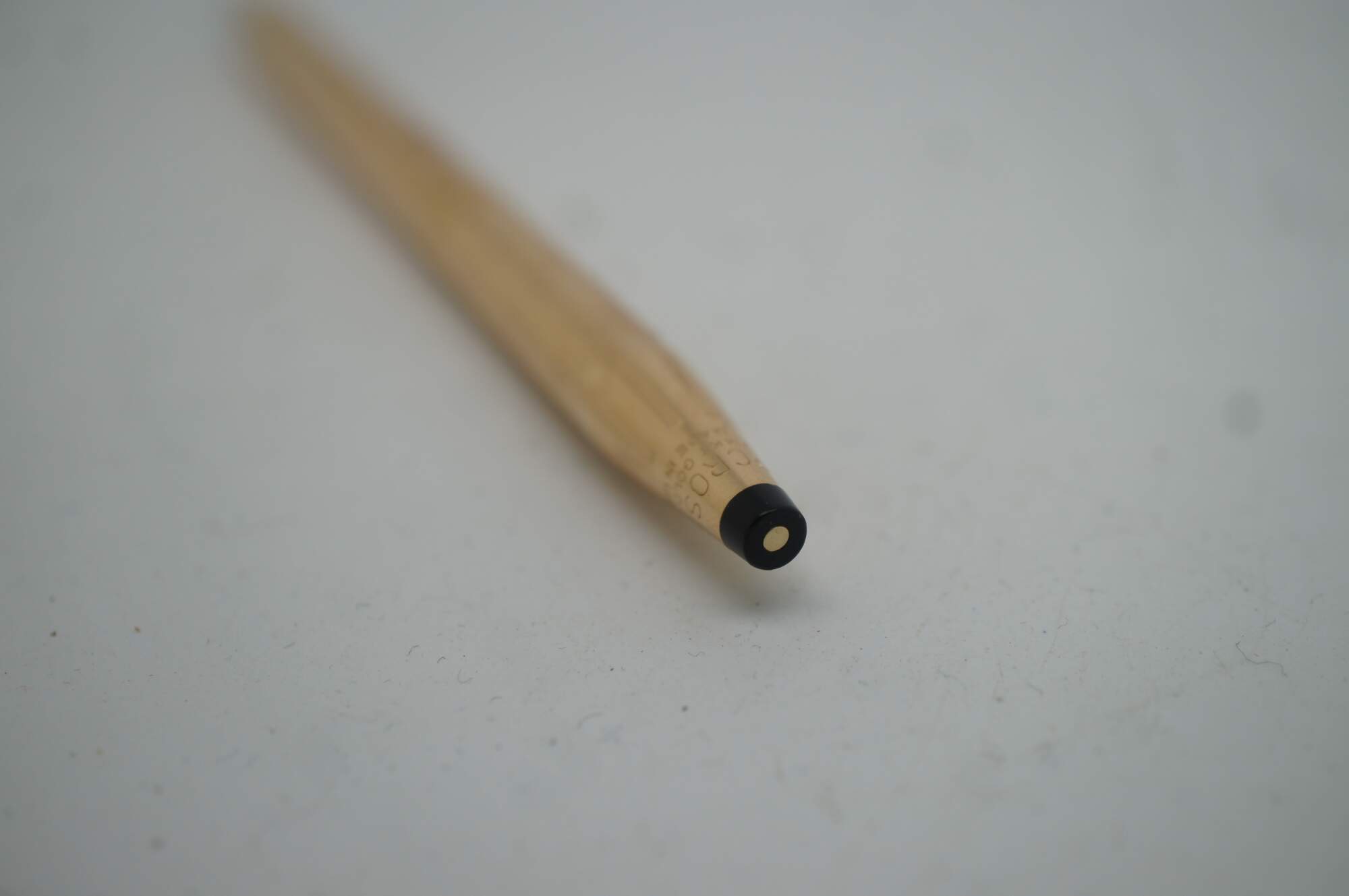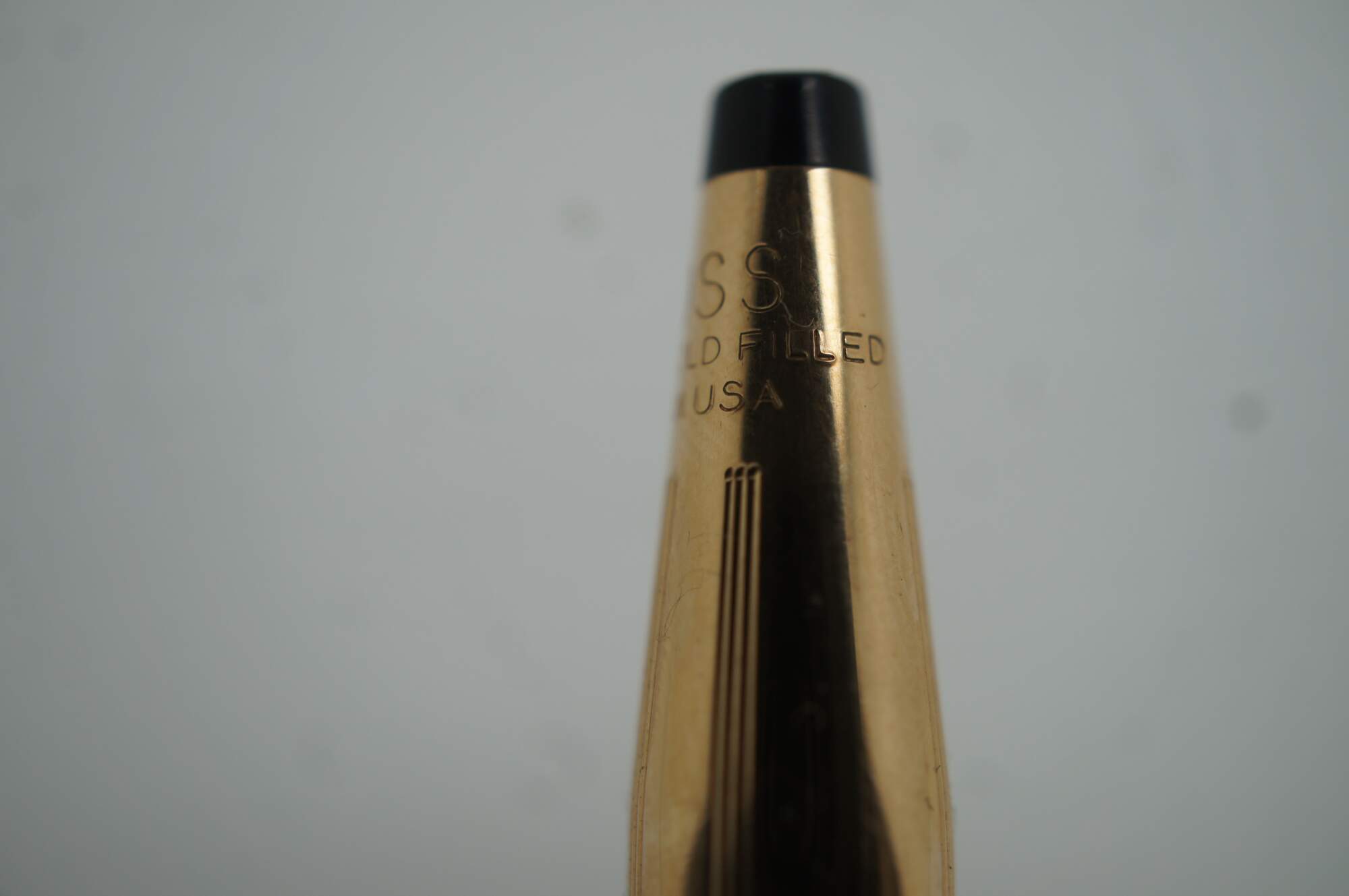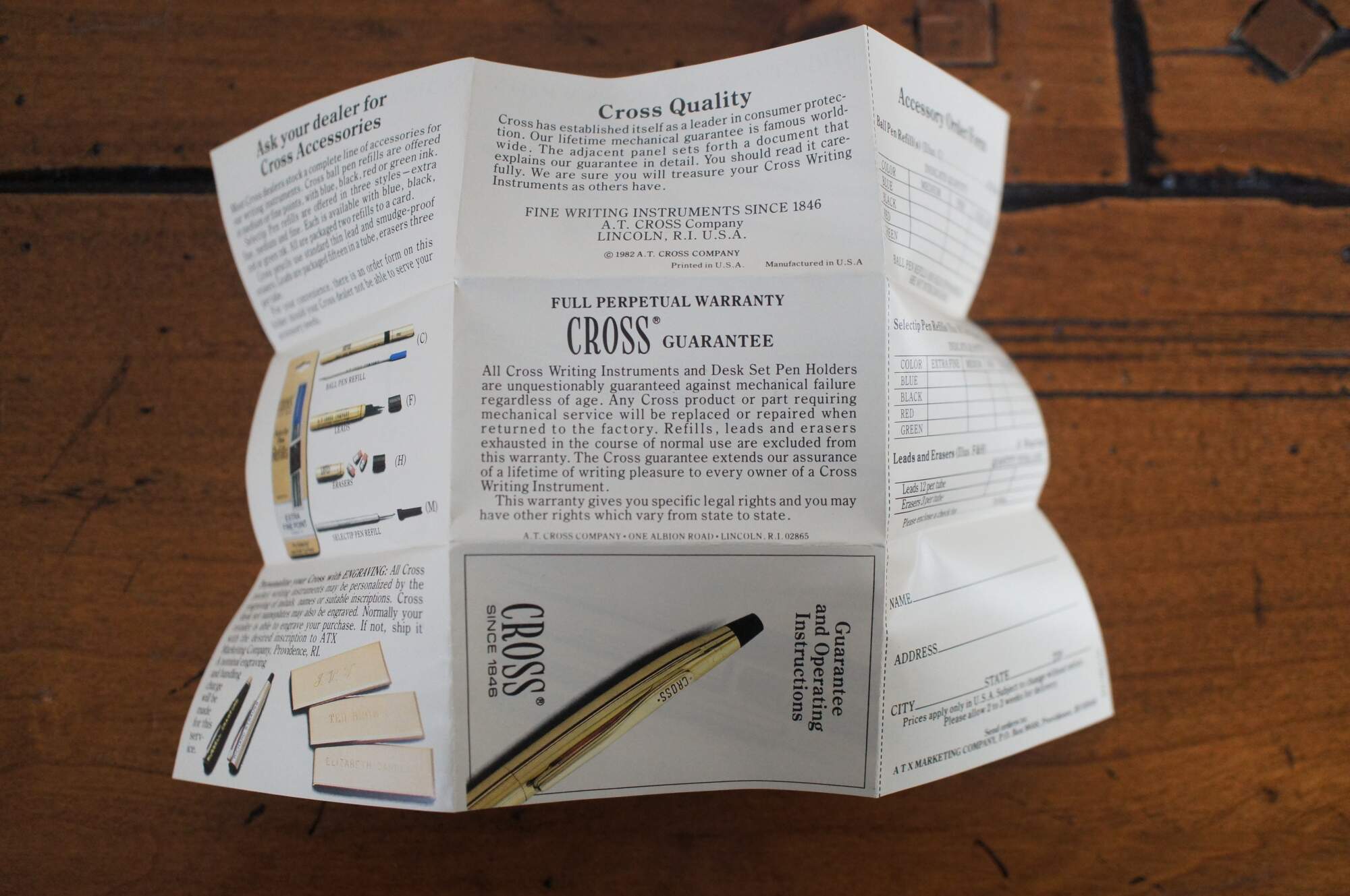 Vintage A.T. Cross refillable 1/20 14K gold filled ballpoint pen featuring a detail band of flowers / roses. Made in USA. Includes original box, dust bag, and leather sleeve. Engraved with the name of original owner.