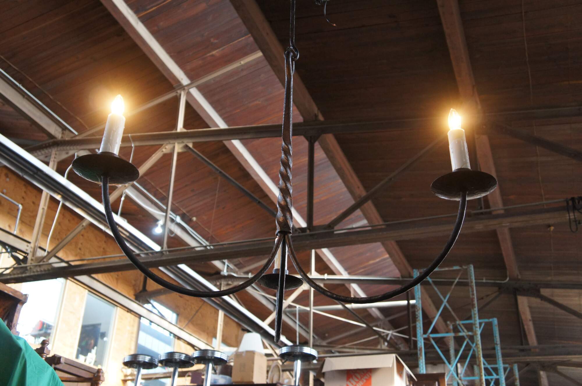 Paul Ferrante old iron forged wrought iron chandelier. Features primitive old world stying with twisted center and downswept arms leading to three lights with wax drip pans and candle covers.