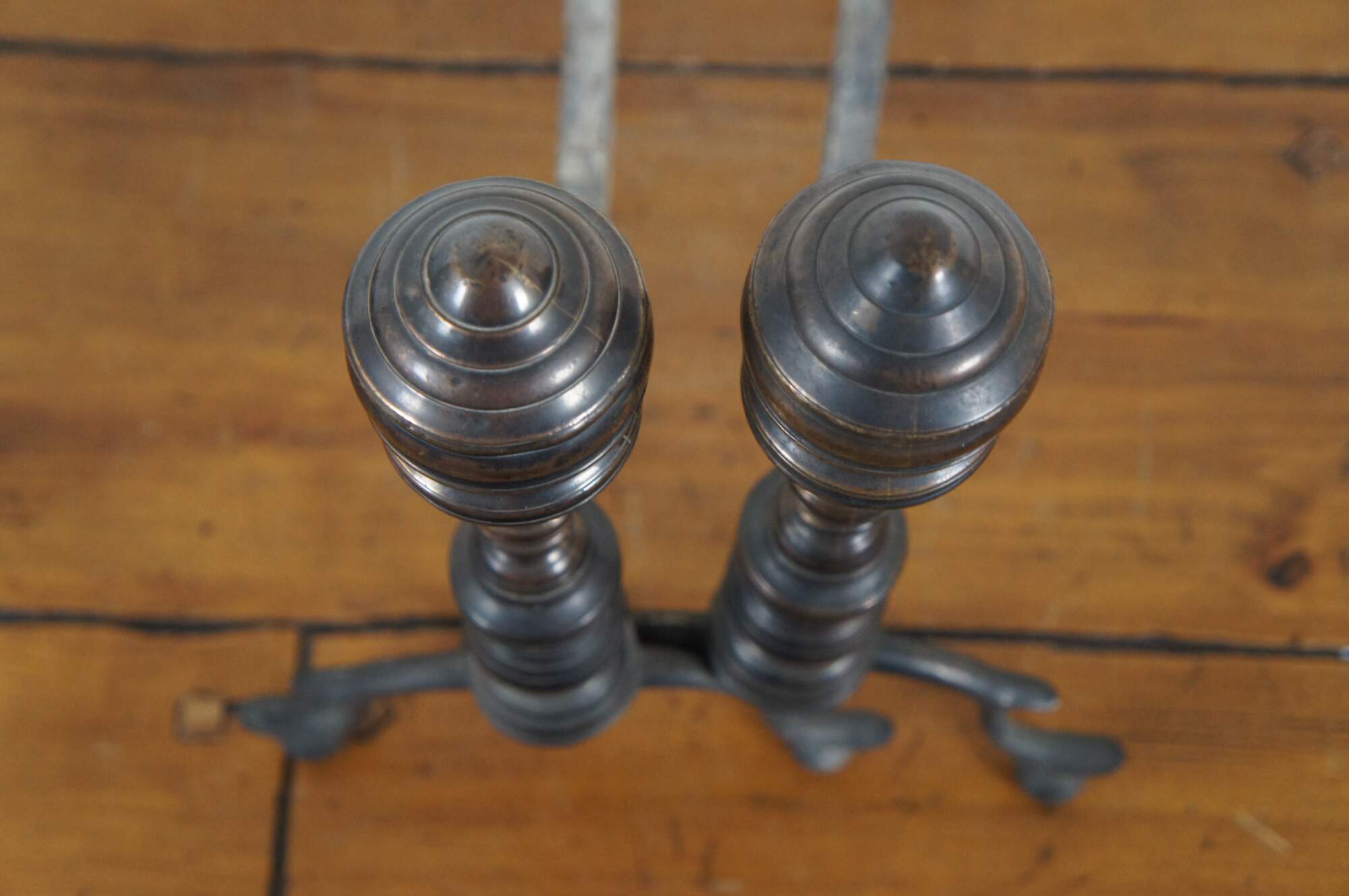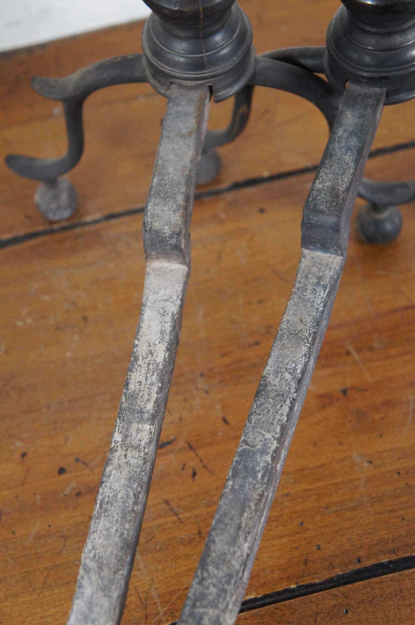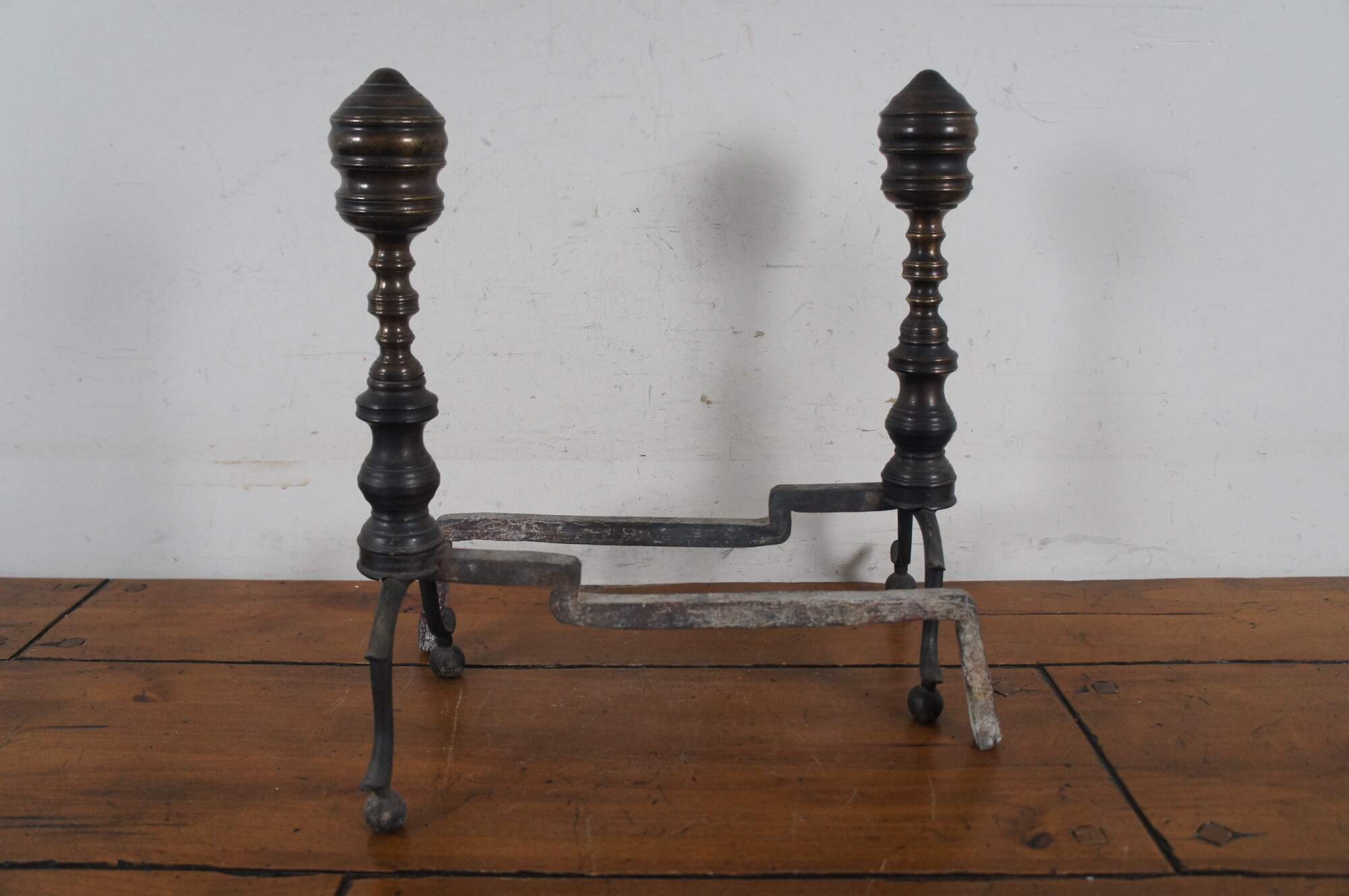 Pair of late 18th / early 19th century antique wrought iron and brass andirons / fire dogs featuring Colonial or Georgian styling with bow legs and a lovely dark patina.