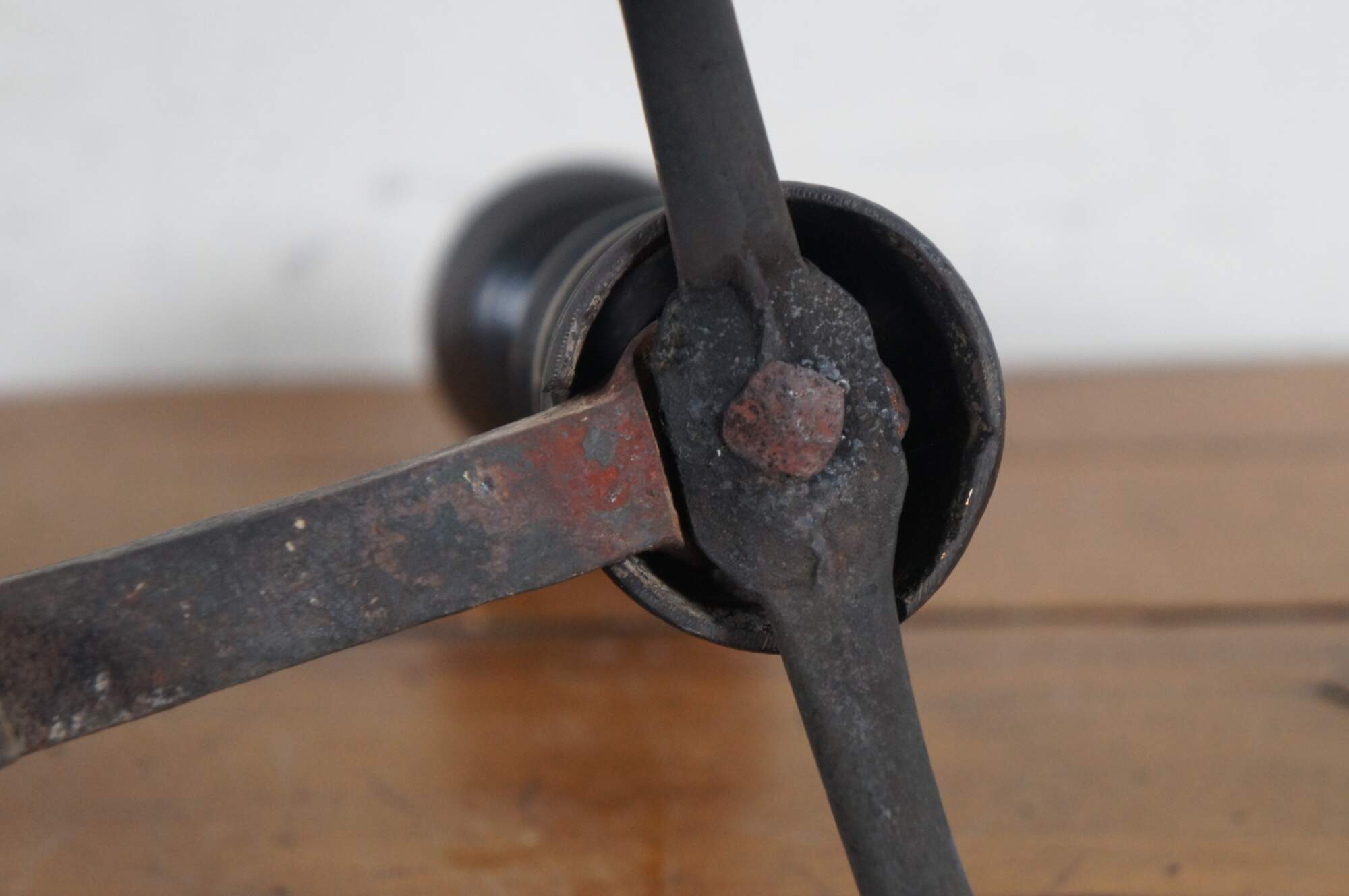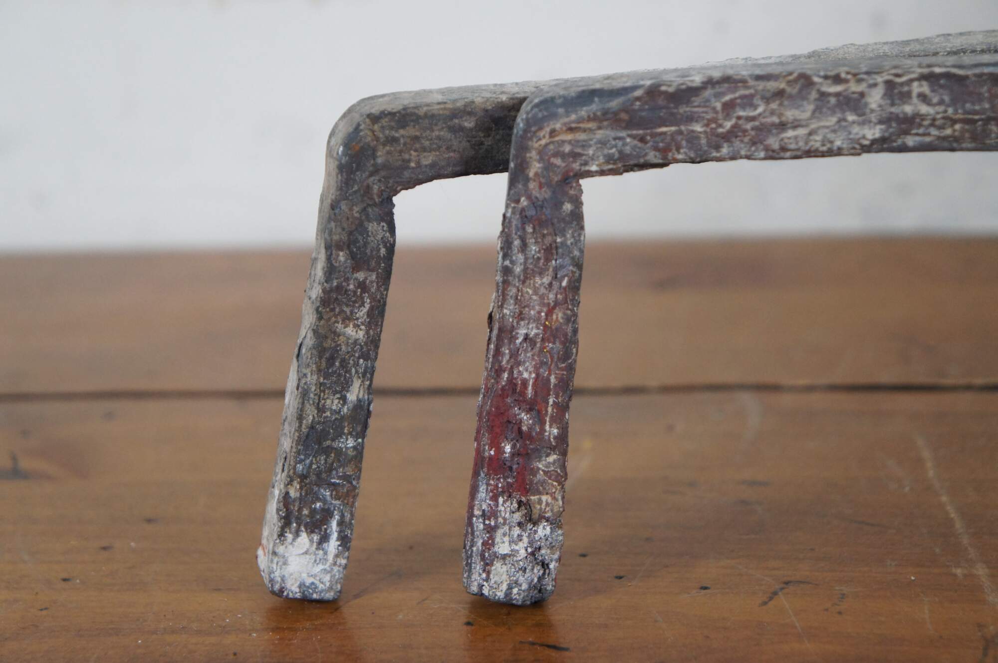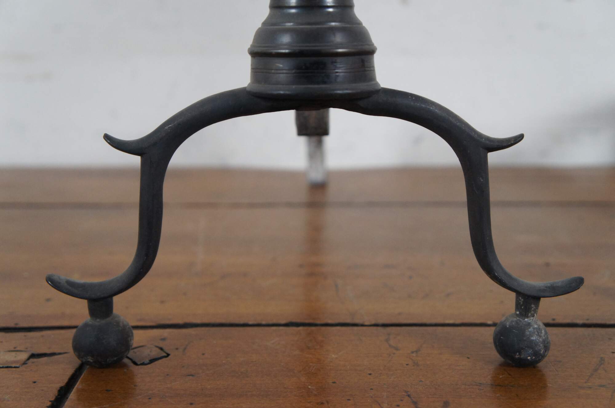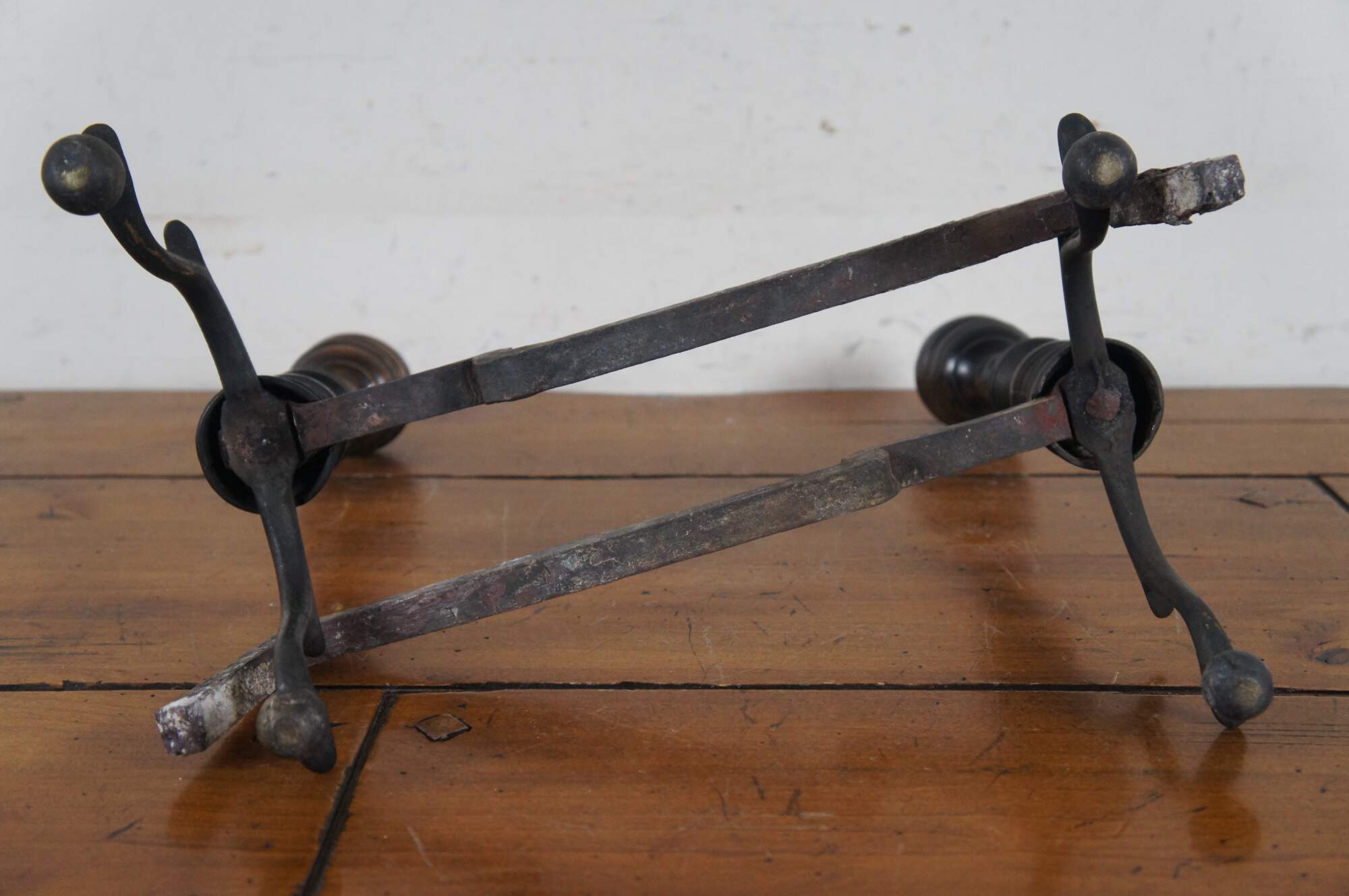 Pair of late 18th / early 19th century antique wrought iron and brass andirons / fire dogs featuring Colonial or Georgian styling with bow legs and a lovely dark patina.