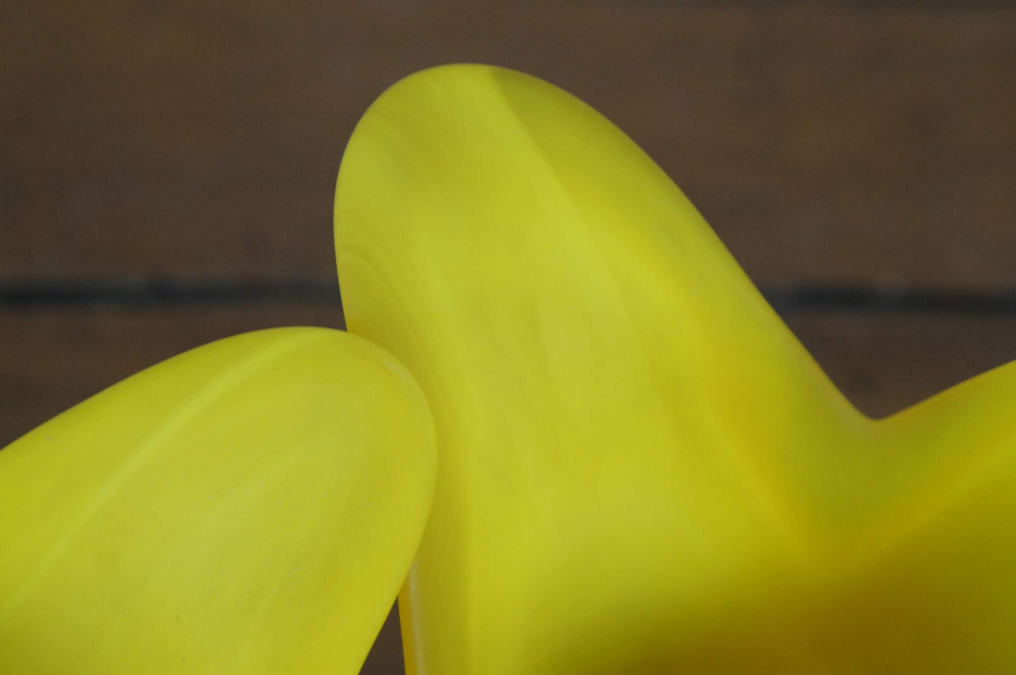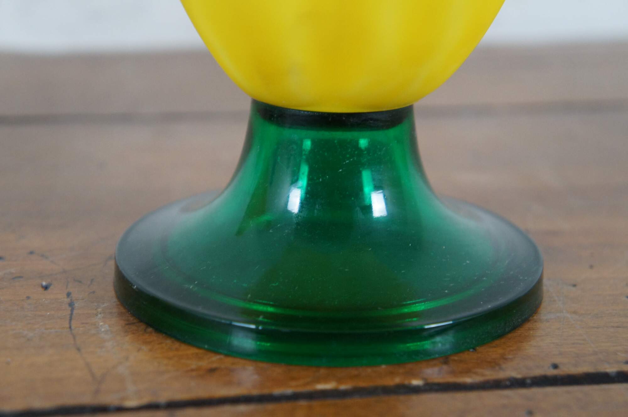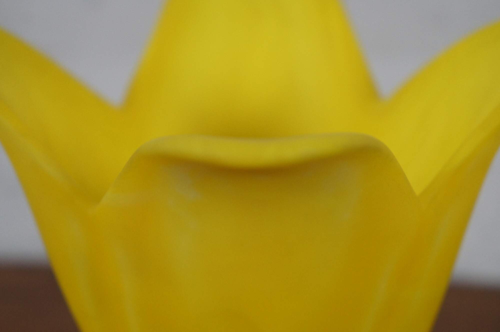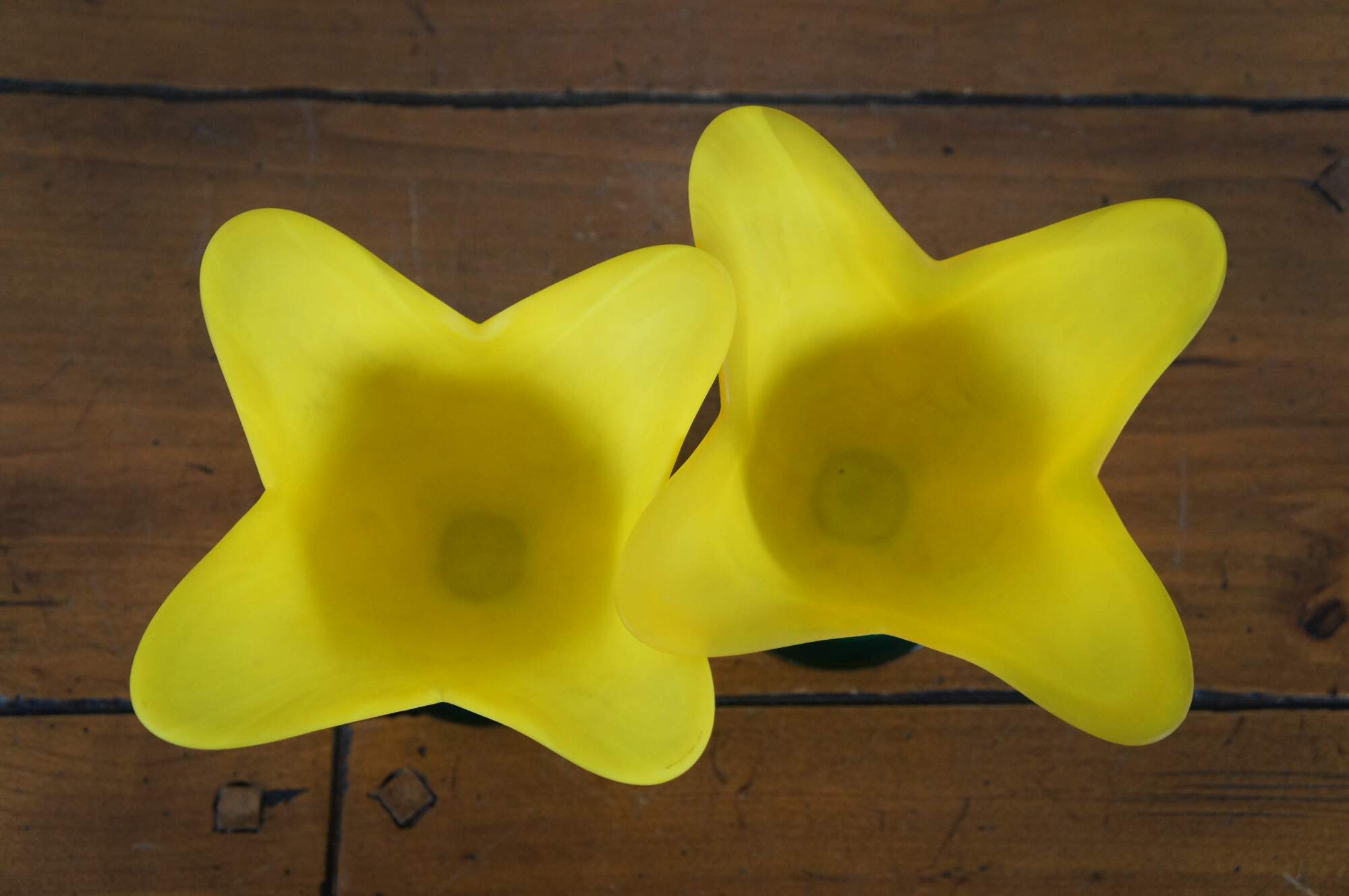 Pair of vintage Studio Nova votive / tea light tulip or daffodil shaped candle holders, featuring round green bases and frosted yellow petal shaped tops.