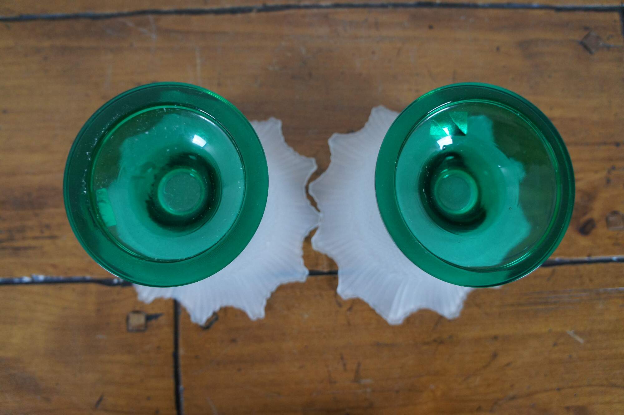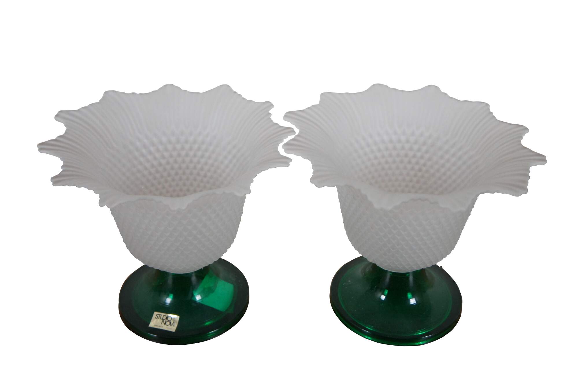 Pair of vintage votive / tea light candle holders by Studio Nova, featuring round green bases and white frosted glass tops shaped like a flower and textured like a pineapple topped with flared leaves. Hand made in Portugal.