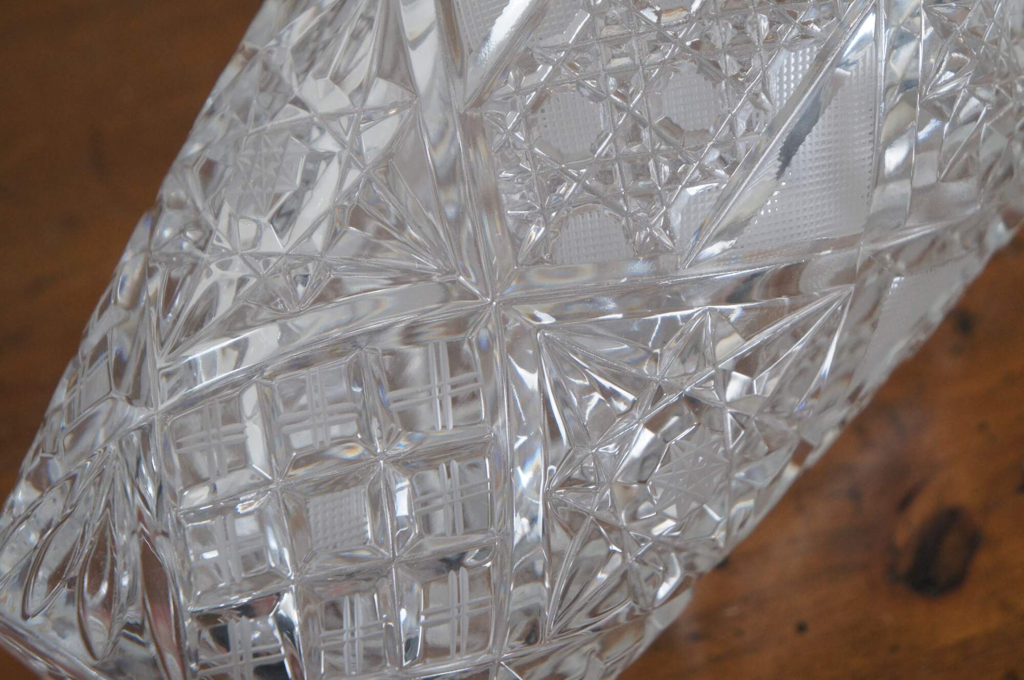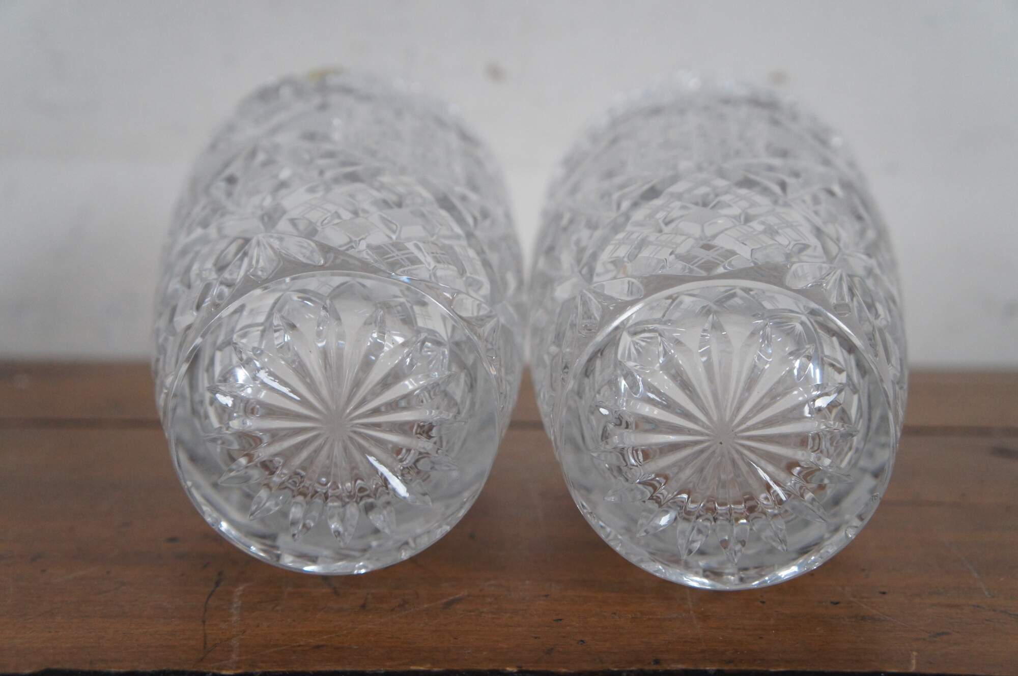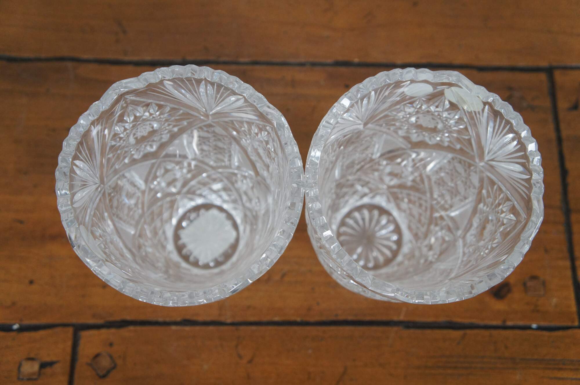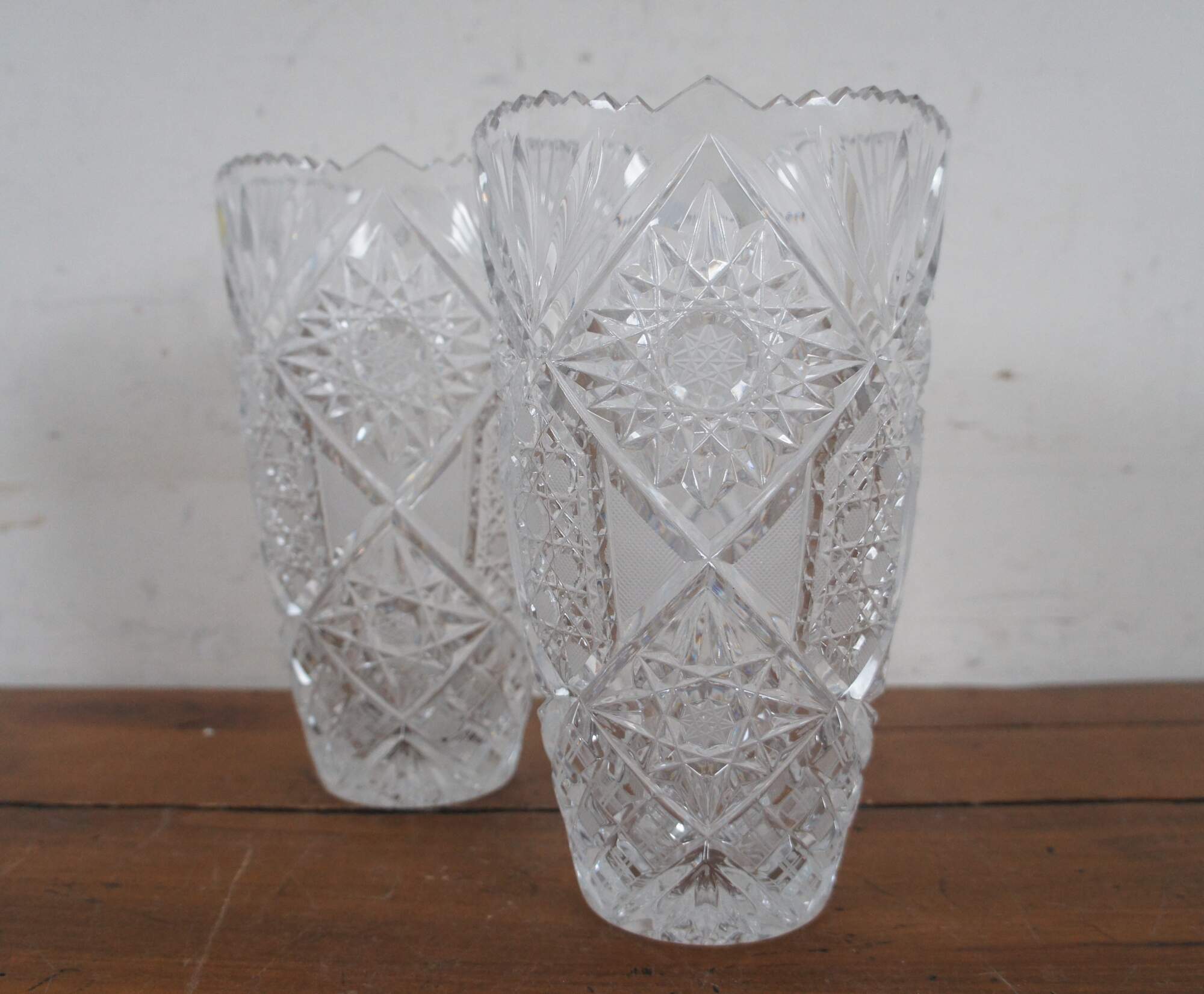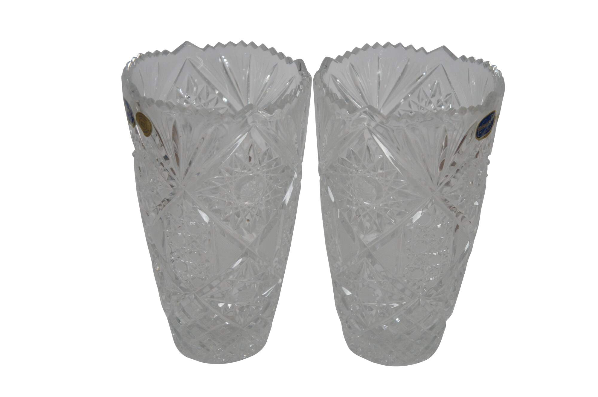 Pair of late 20th century hand cut lead crystal flower vases by Bohemia Crystal in the Queen Lace pattern with tapered base and sawtooth top edge. Made in the Czech Republic.