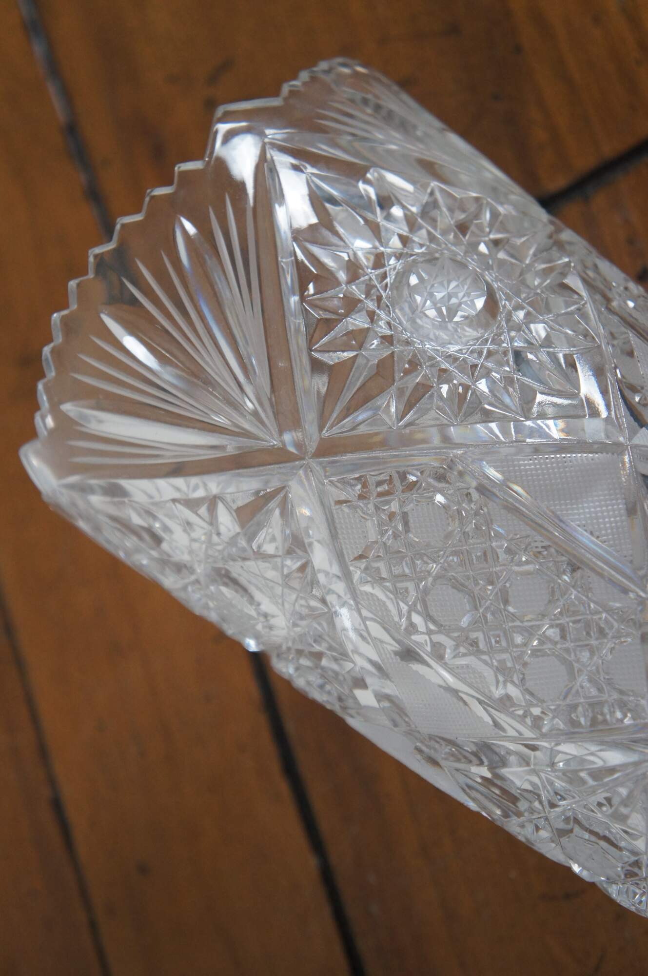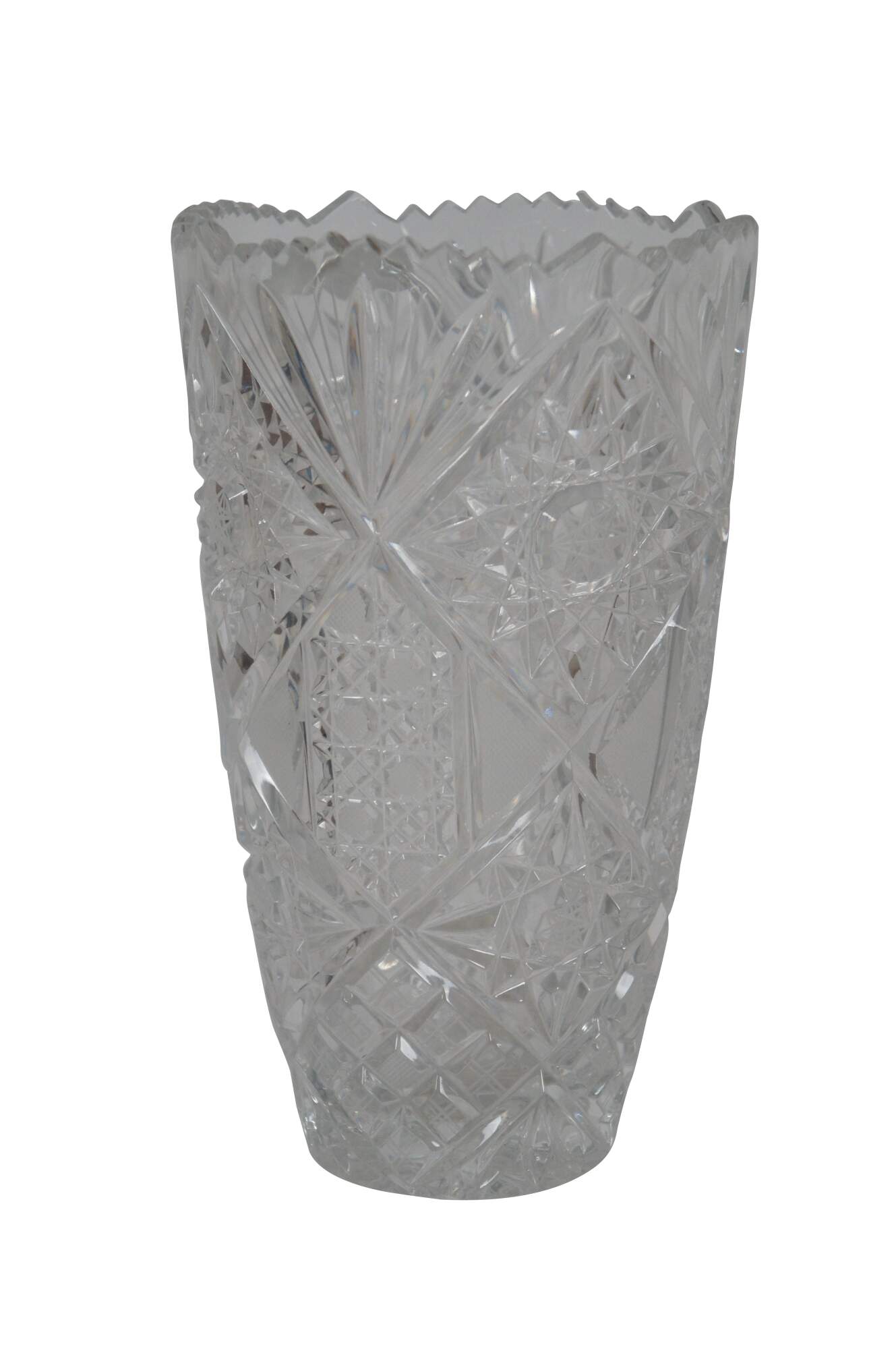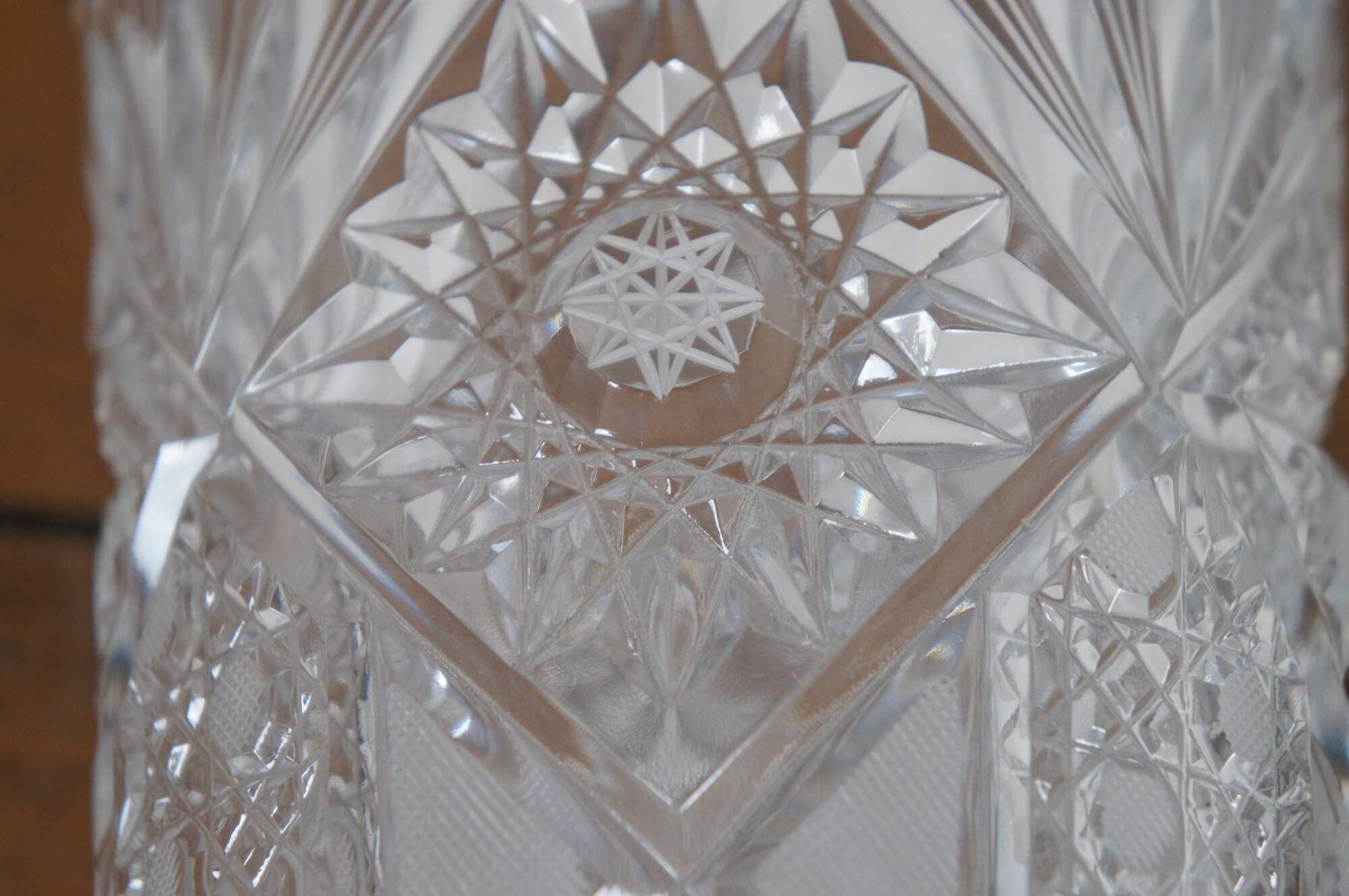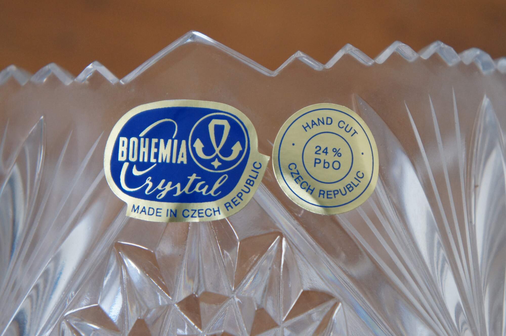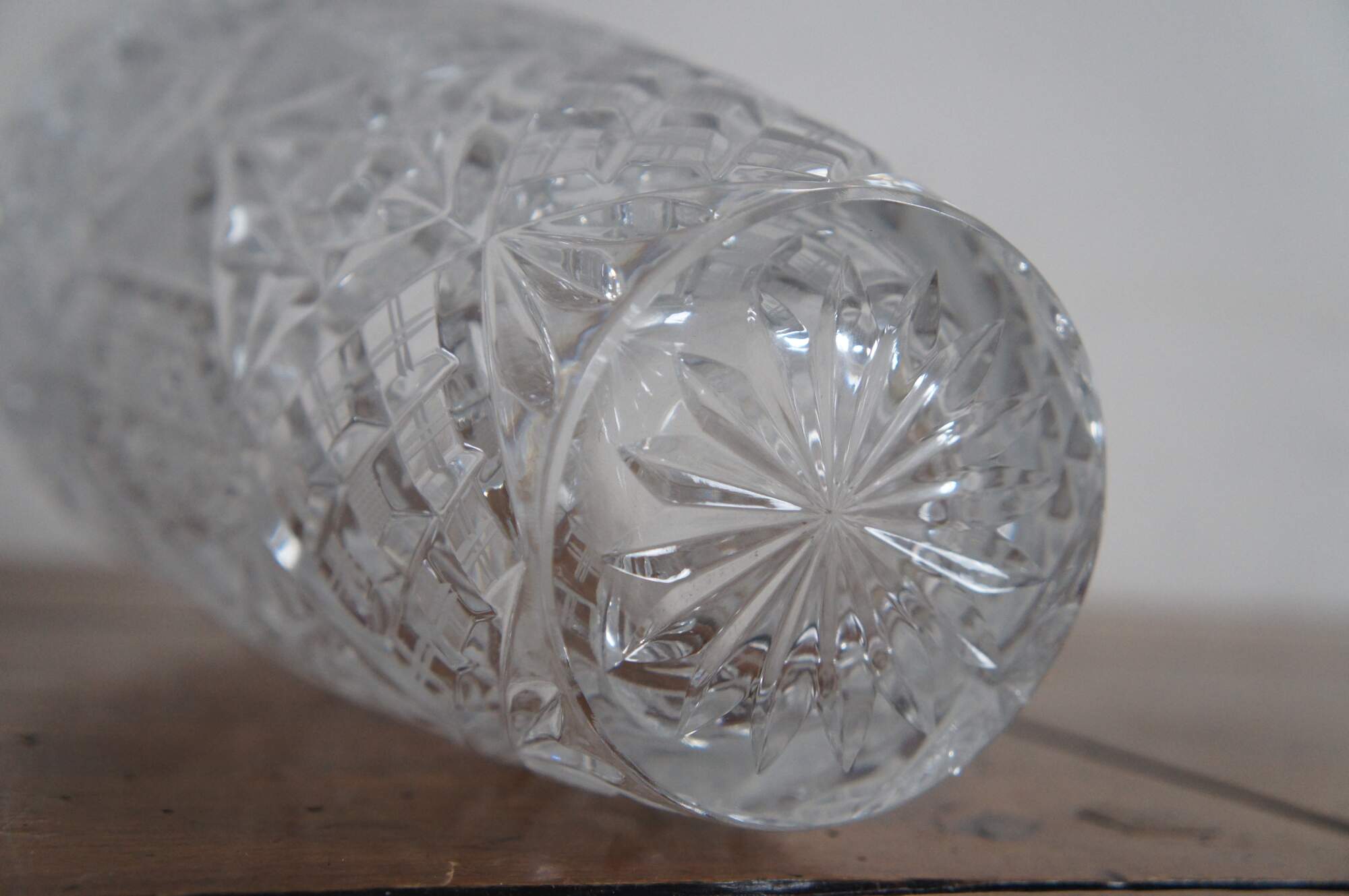 Pair of late 20th century hand cut lead crystal flower vases by Bohemia Crystal in the Queen Lace pattern with tapered base and sawtooth top edge. Made in the Czech Republic.