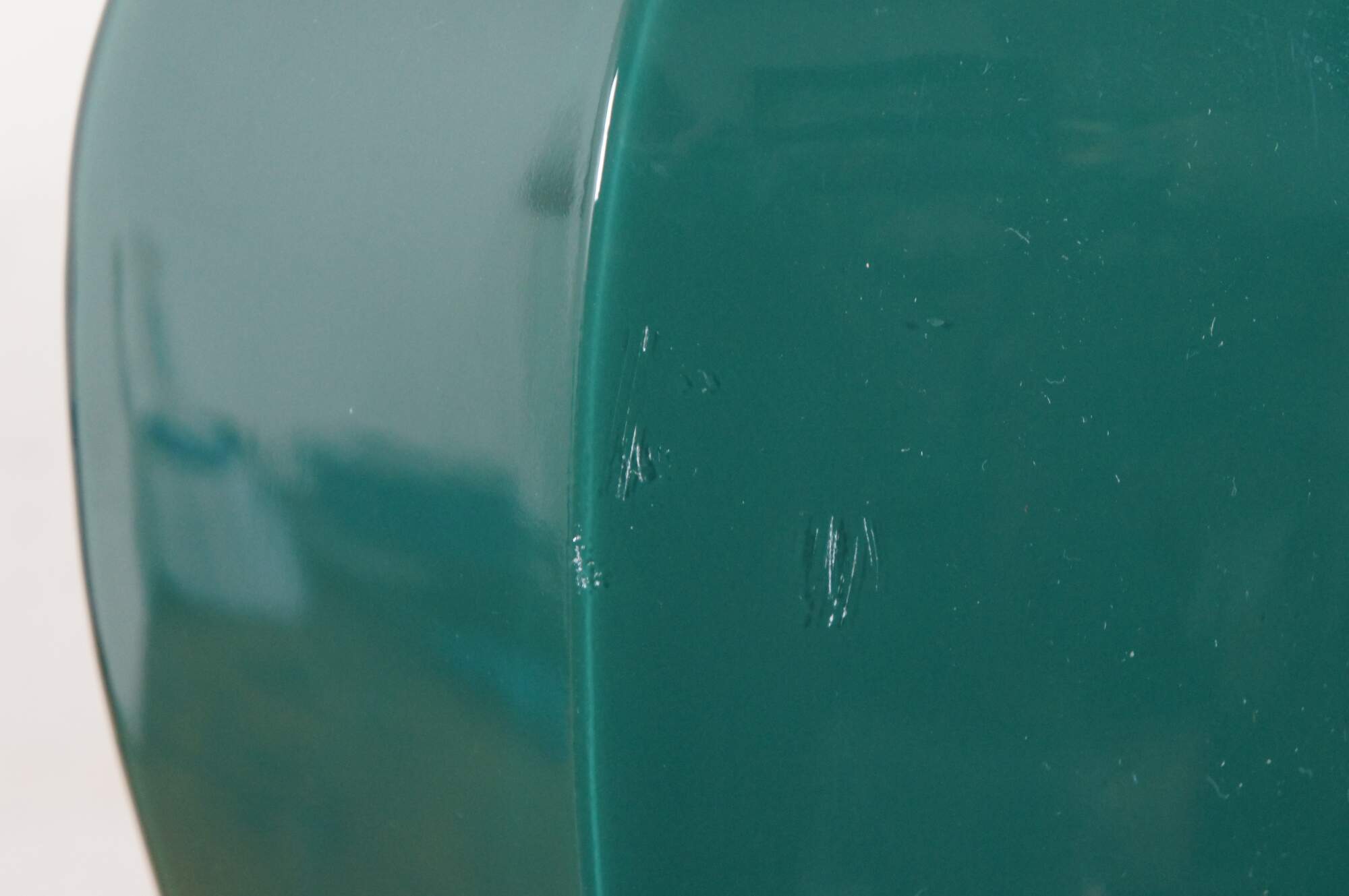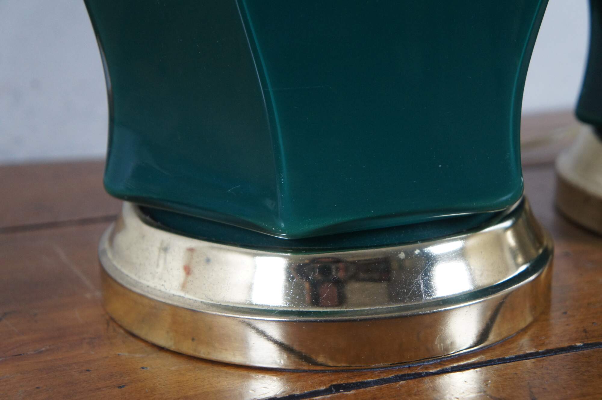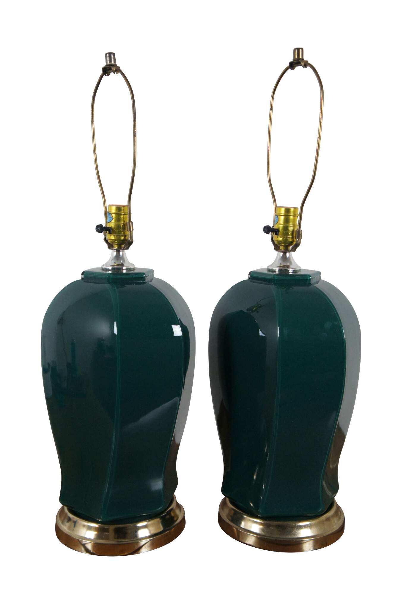 Pair of mid 20th century glass table lamps, reverse painted in forest green featuring brass bases and a unique faceted ginger jar / urn shaped body. Includes harp and simple cap shaped finials.