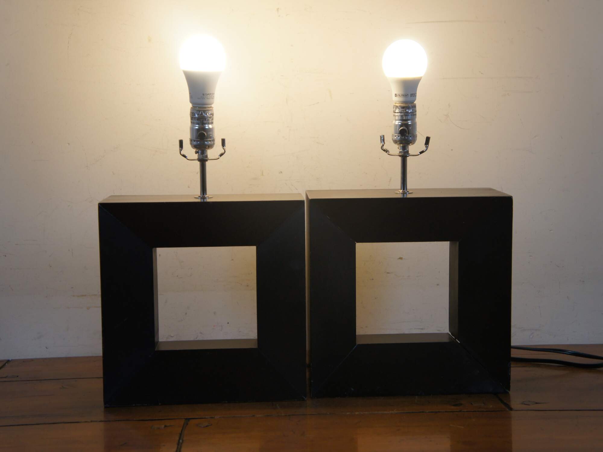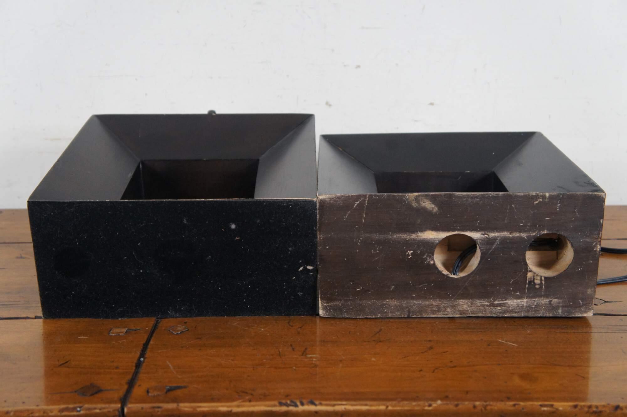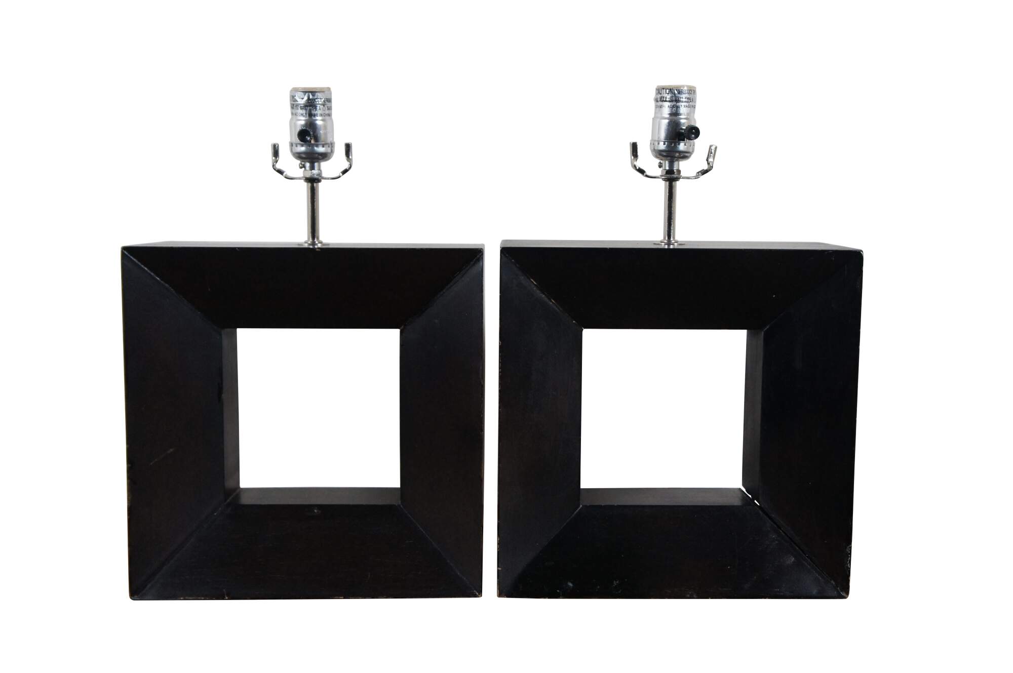 Pair of mid century modern wooden table lamps featuring square beveled forms with cut out centers, with a deep, ebonized finish. No harps.