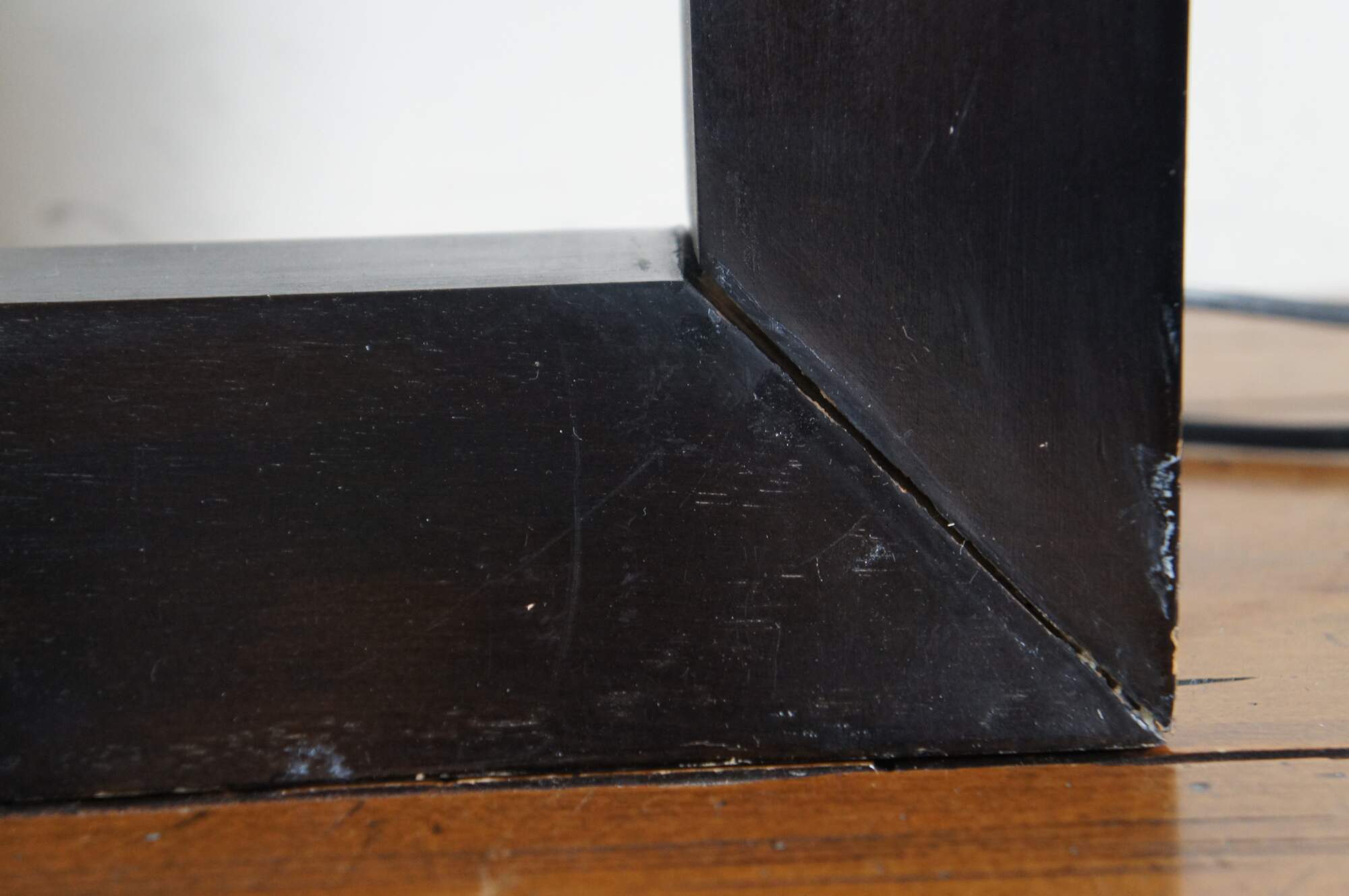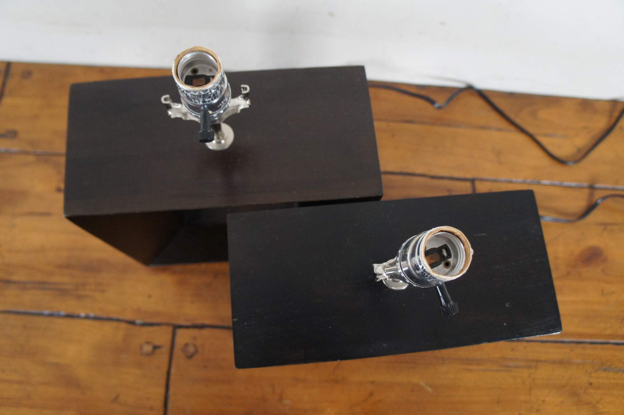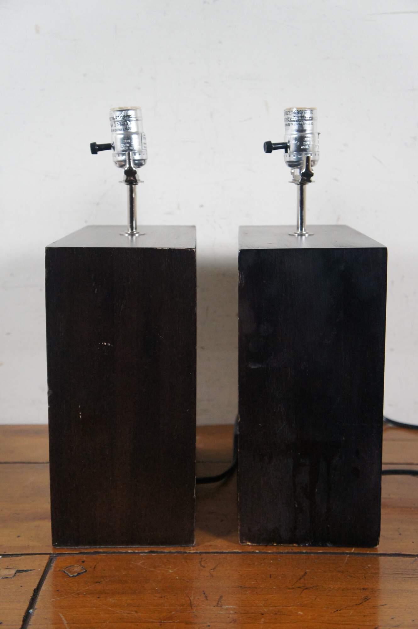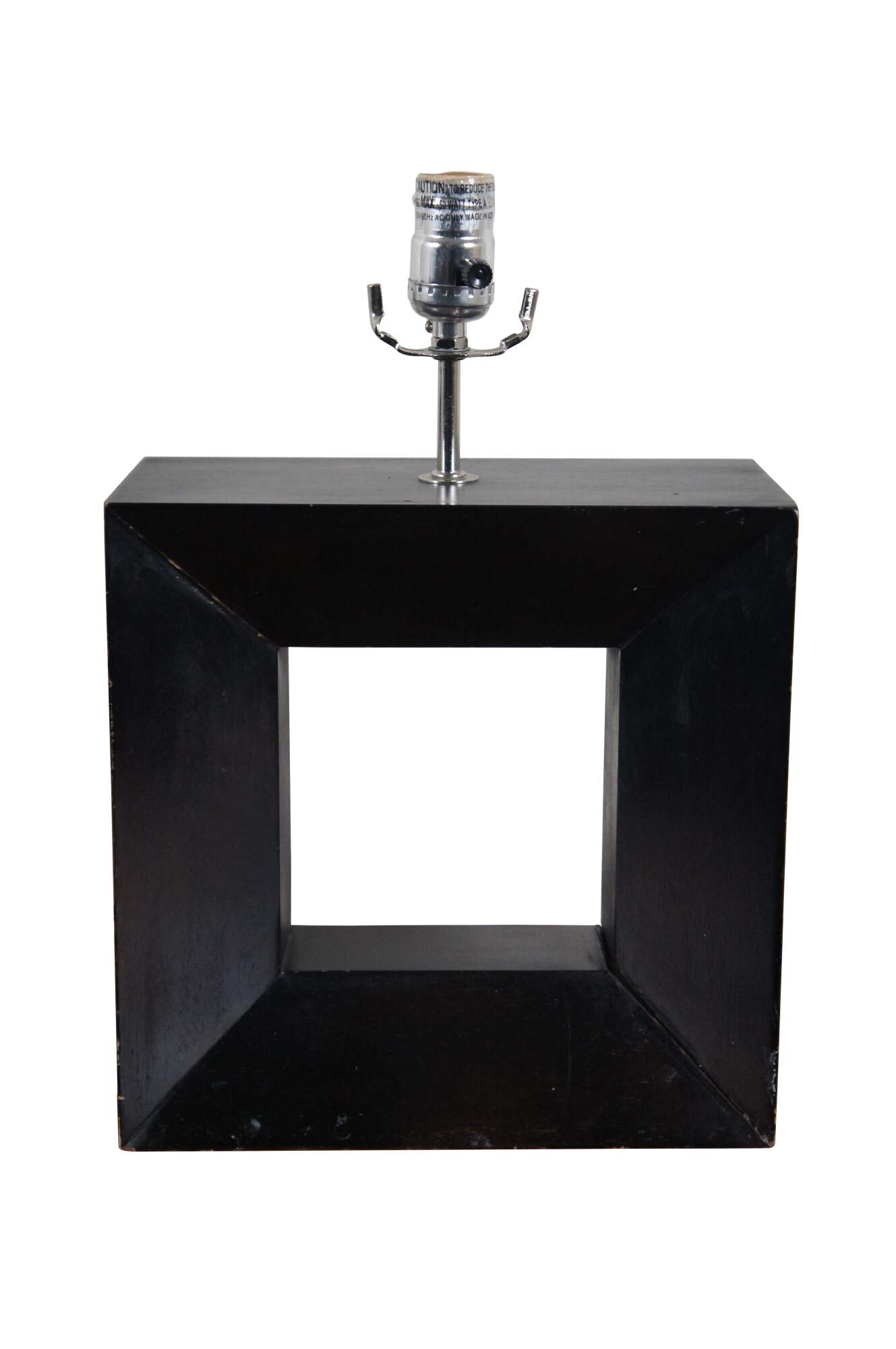 Pair of mid century modern wooden table lamps featuring square beveled forms with cut out centers, with a deep, ebonized finish. No harps.