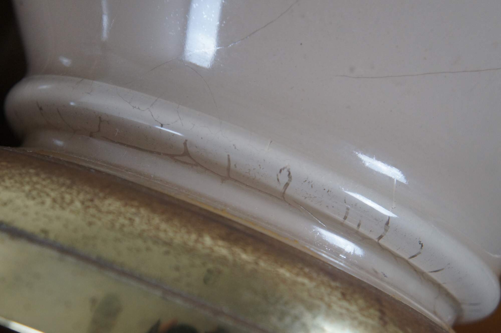Three mid 20th century glass table lamps featuring a bulbous ginger jar shape, reverse painted a slightly pinkish beige, with brass bases. Includes harps and simple cap shaped finials.