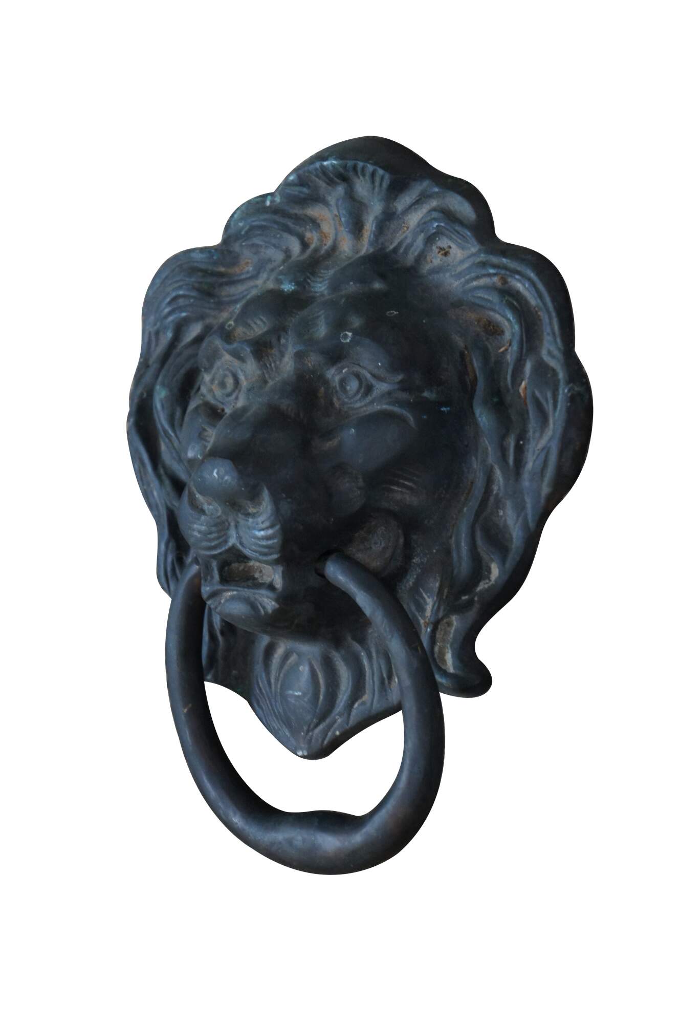 Antique Georgian solid brass door knocker in the traditional shape of a lion's head with a ring in it's mouth.