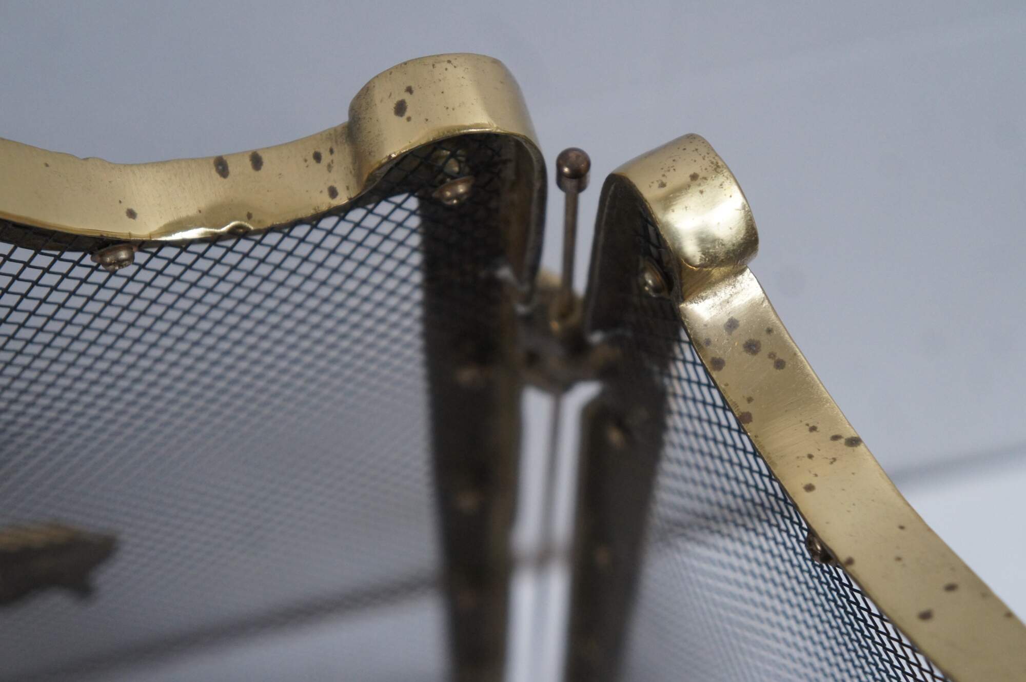 Mid century French Louis XV brass hearth / fireplace screen featuring three folding metal mesh panels framed in scrolled brass with scalloped shell accents, paw feet and appliques featuring a pair of lovebirds below a Neoclassical bow on a flowering branch and winged gryphons flanking a mantel urn / vase.