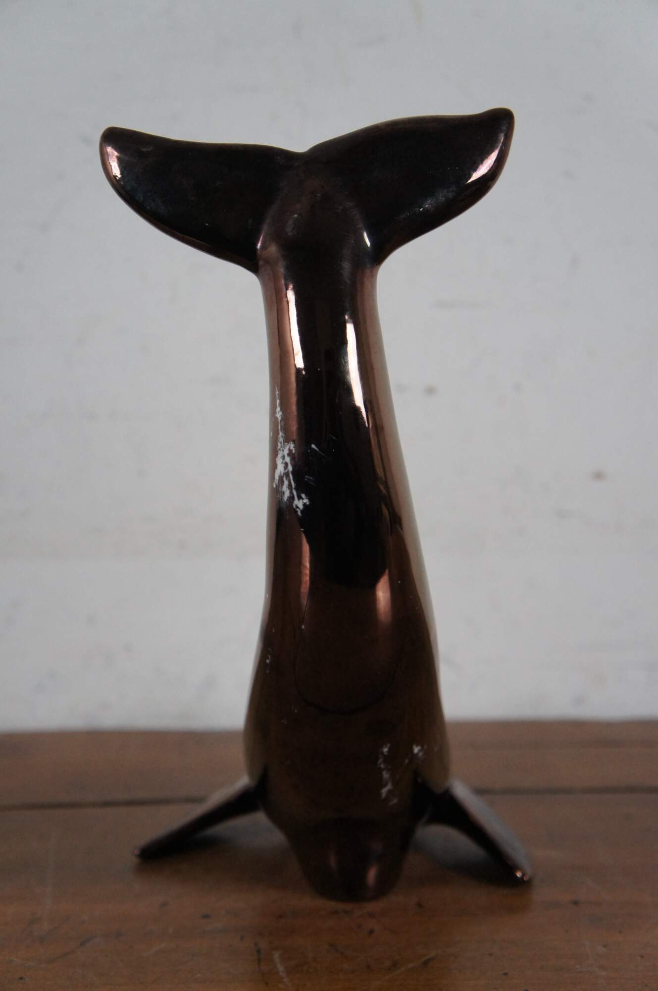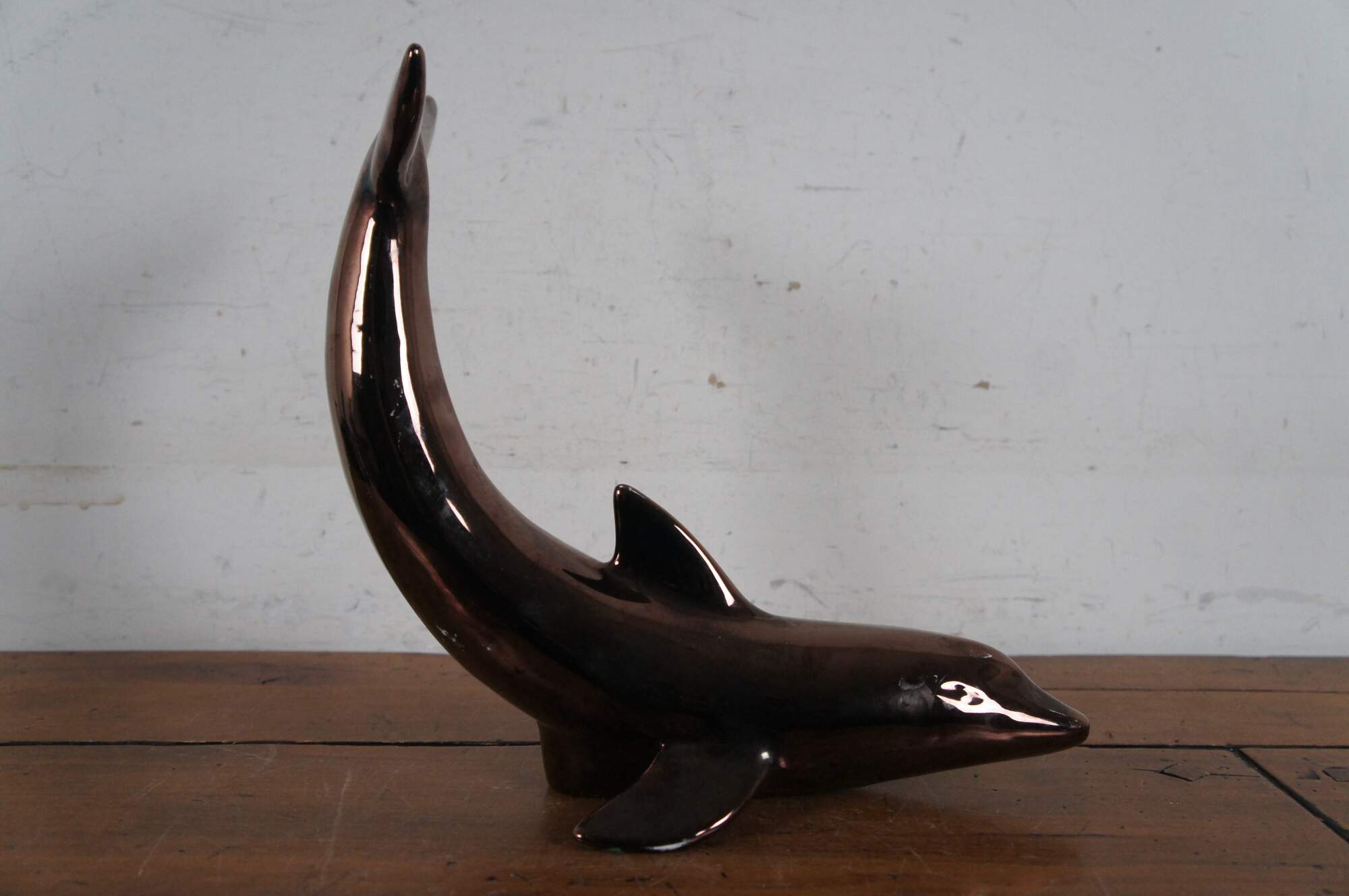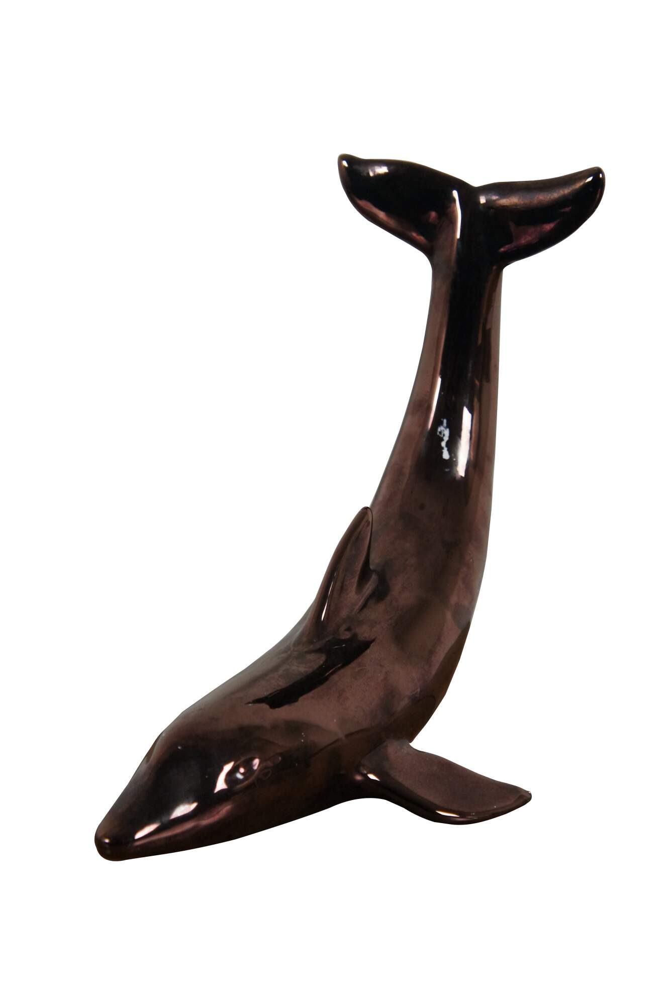 Vintage porcelain sculpture / figurine in the shape of a dolphin with tail in the air, finished in an iridescent / metallic bronze color
