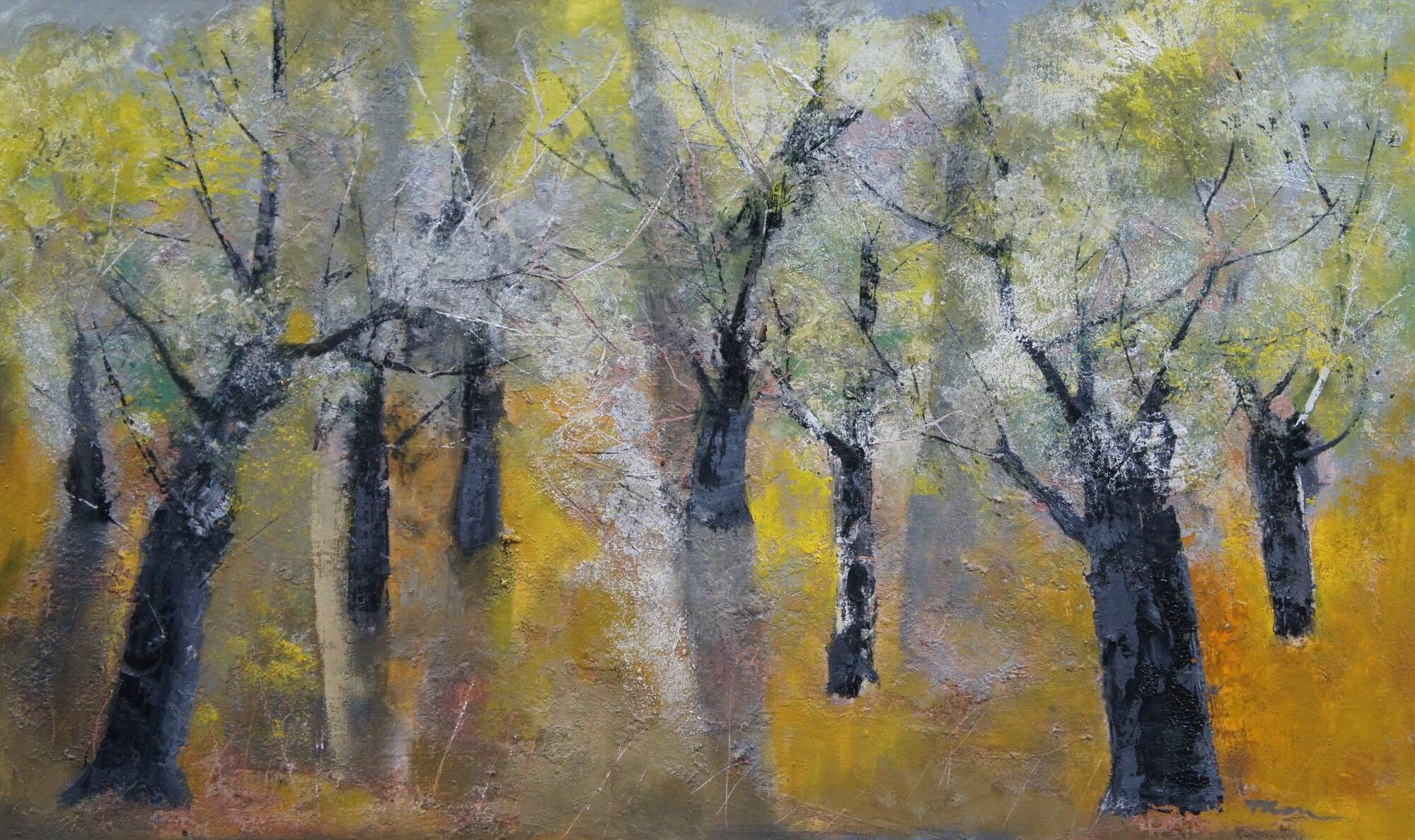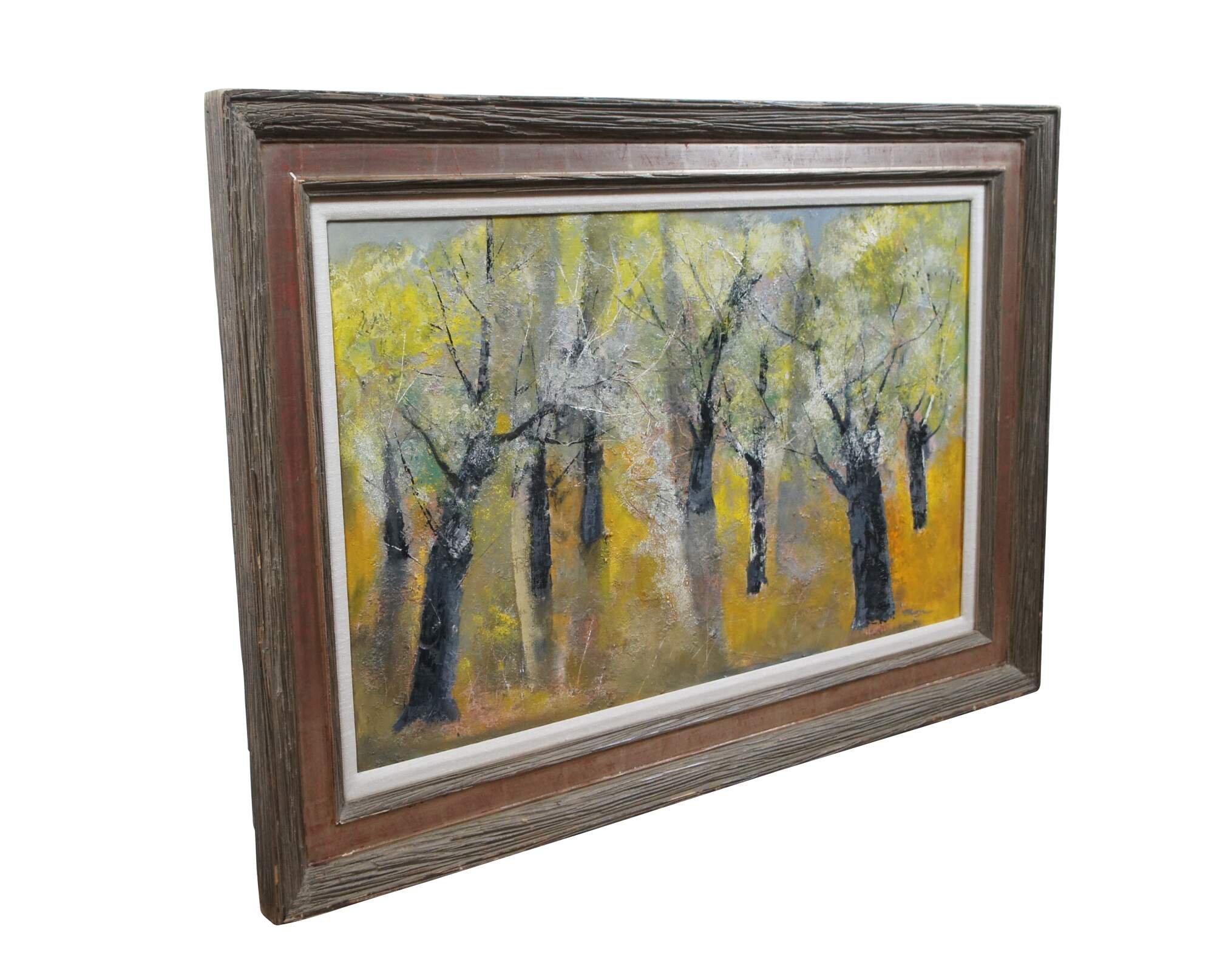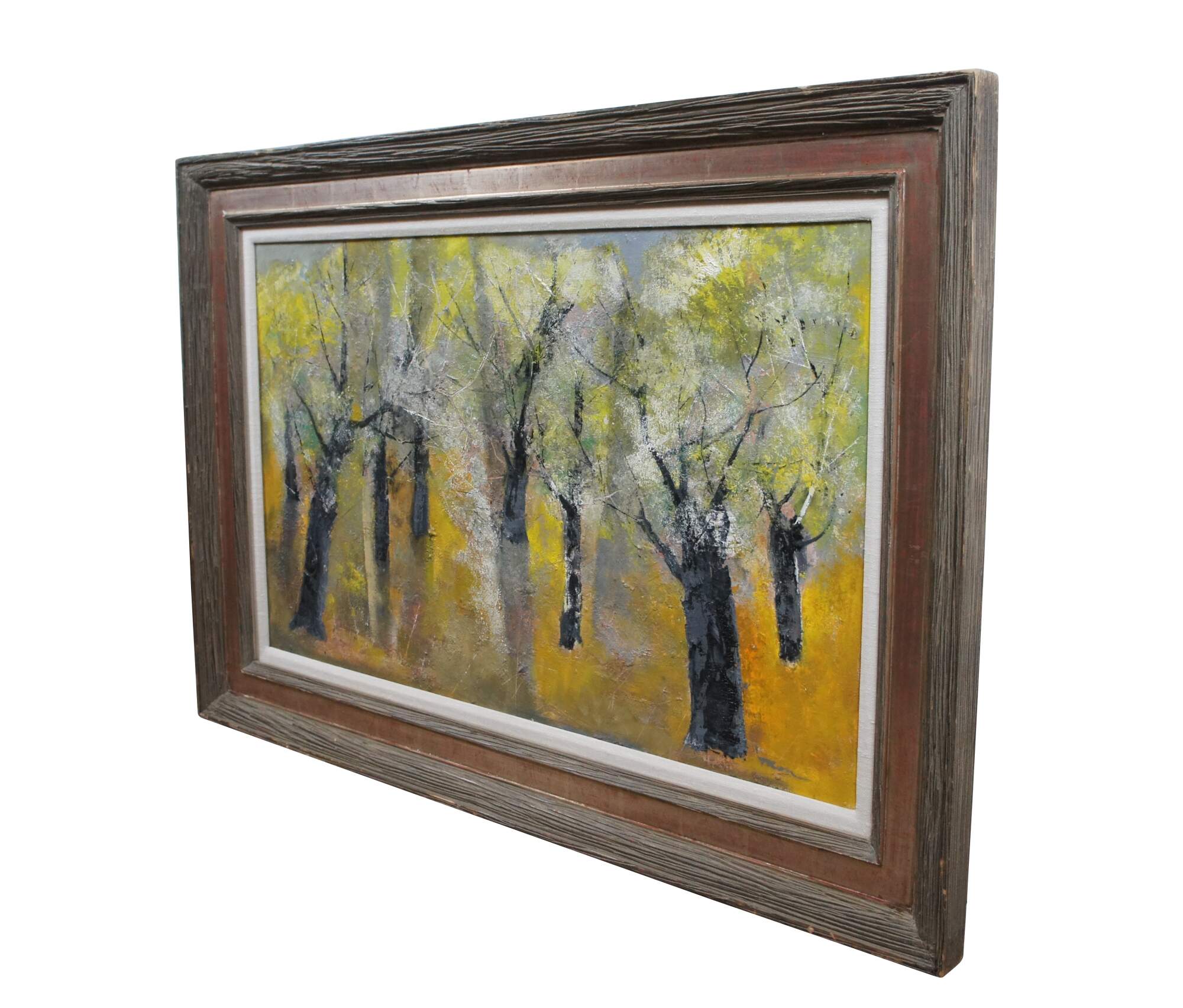 Mid 20th century oil on board landscape painting by William Thon, titled "Olive Trees," No. 850. Shows an abstract expressionist forestscape with black trunked trees whith green and white leaves over a golden forest floor. Signed lower right corner. Rustic wood frame with red stained recessed bevel and white linen mat. Labels on reverse from Midtown Galleries (New York, New York), Frost Gully Gallery (Portland, Maine). Exhibited at The Ogunquit Museum of American Art (Ogunquit, Maine) - "Creative Lives" July 1 - September 30, 1996.