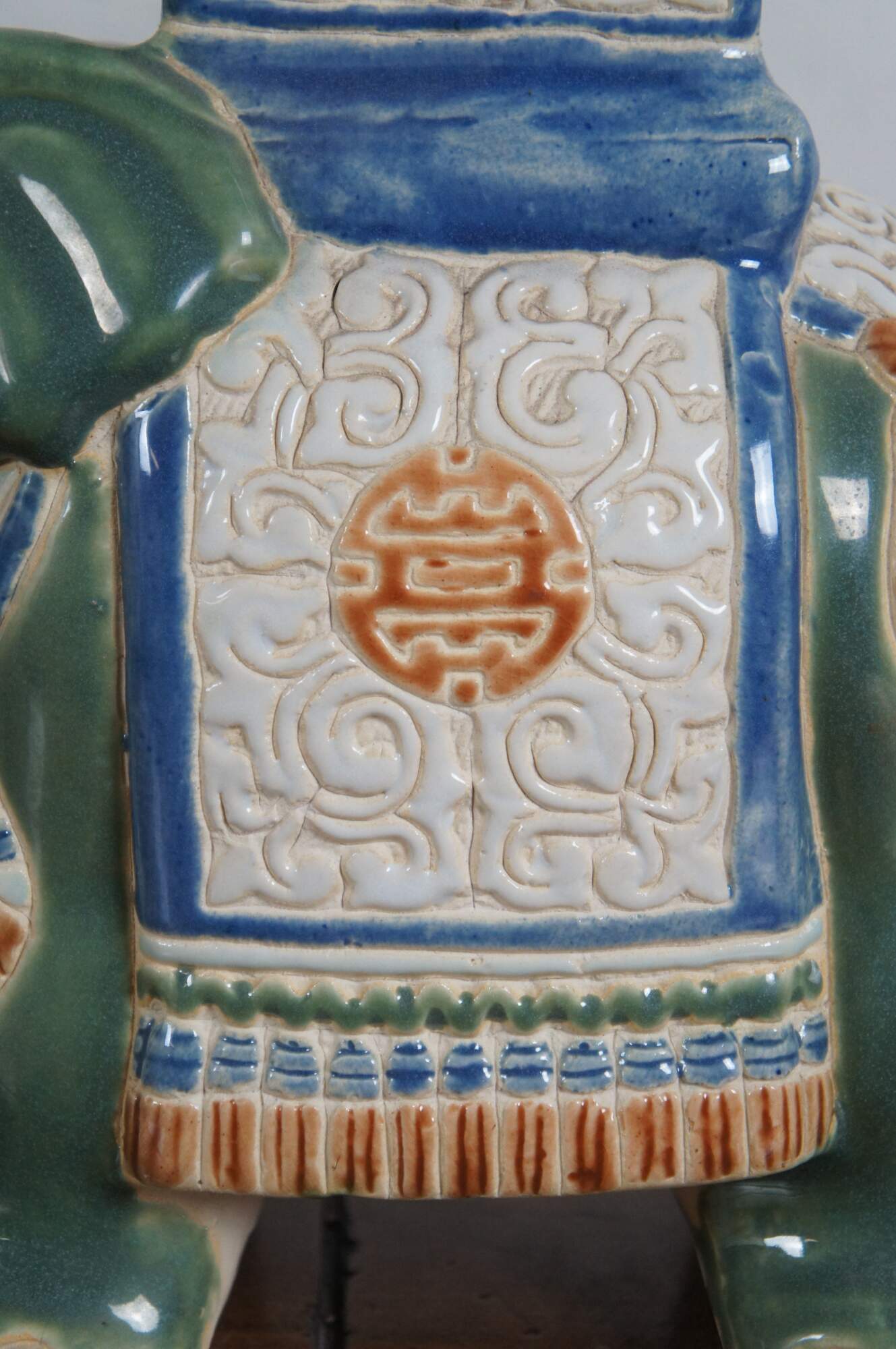 Pair of vintage majolica style ceramic plant / candle stands / garden stools / Bookends in the shape of green Asian elephants with raised trunks, decorated with coverings in white, blue, and orange.