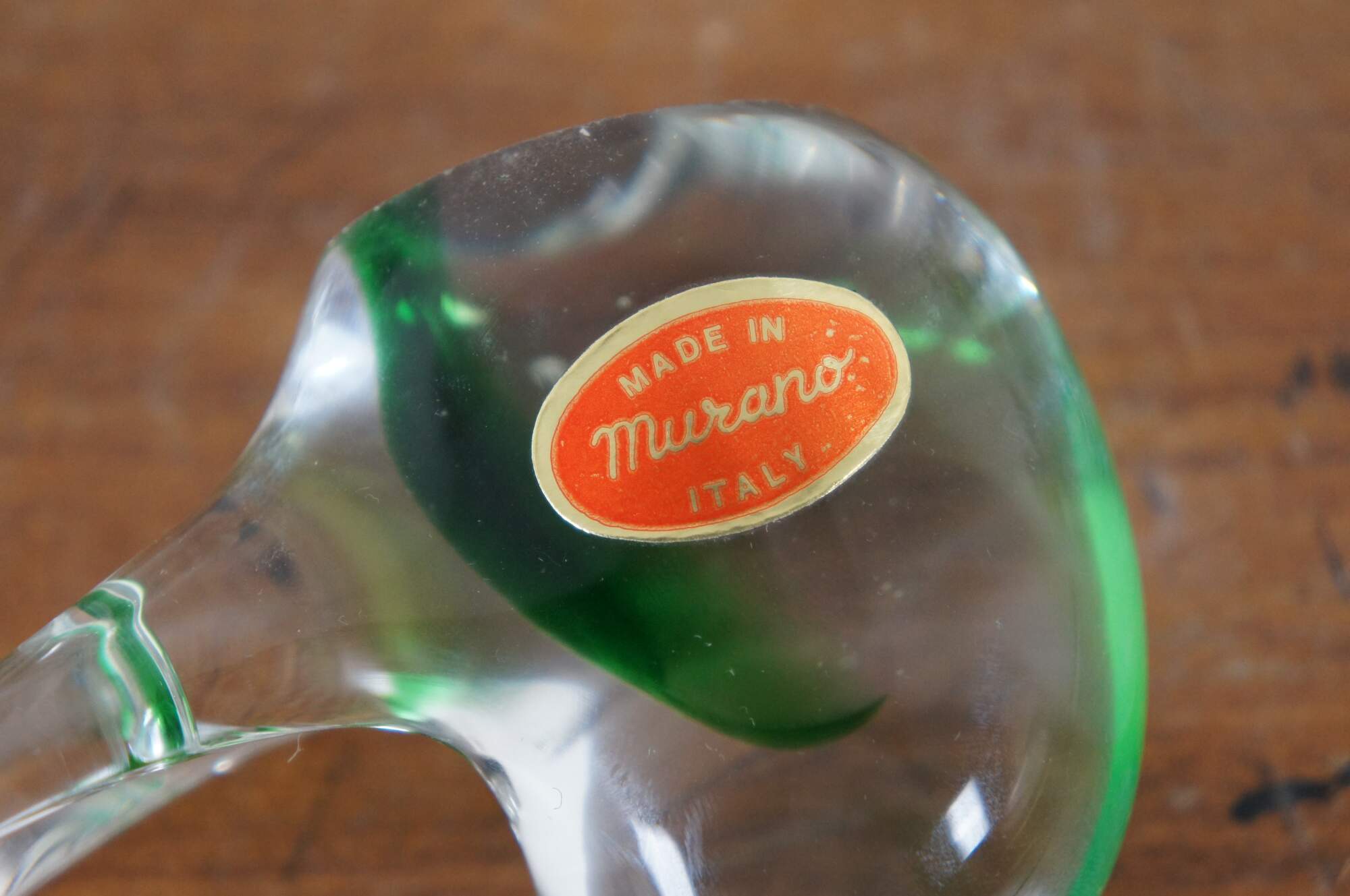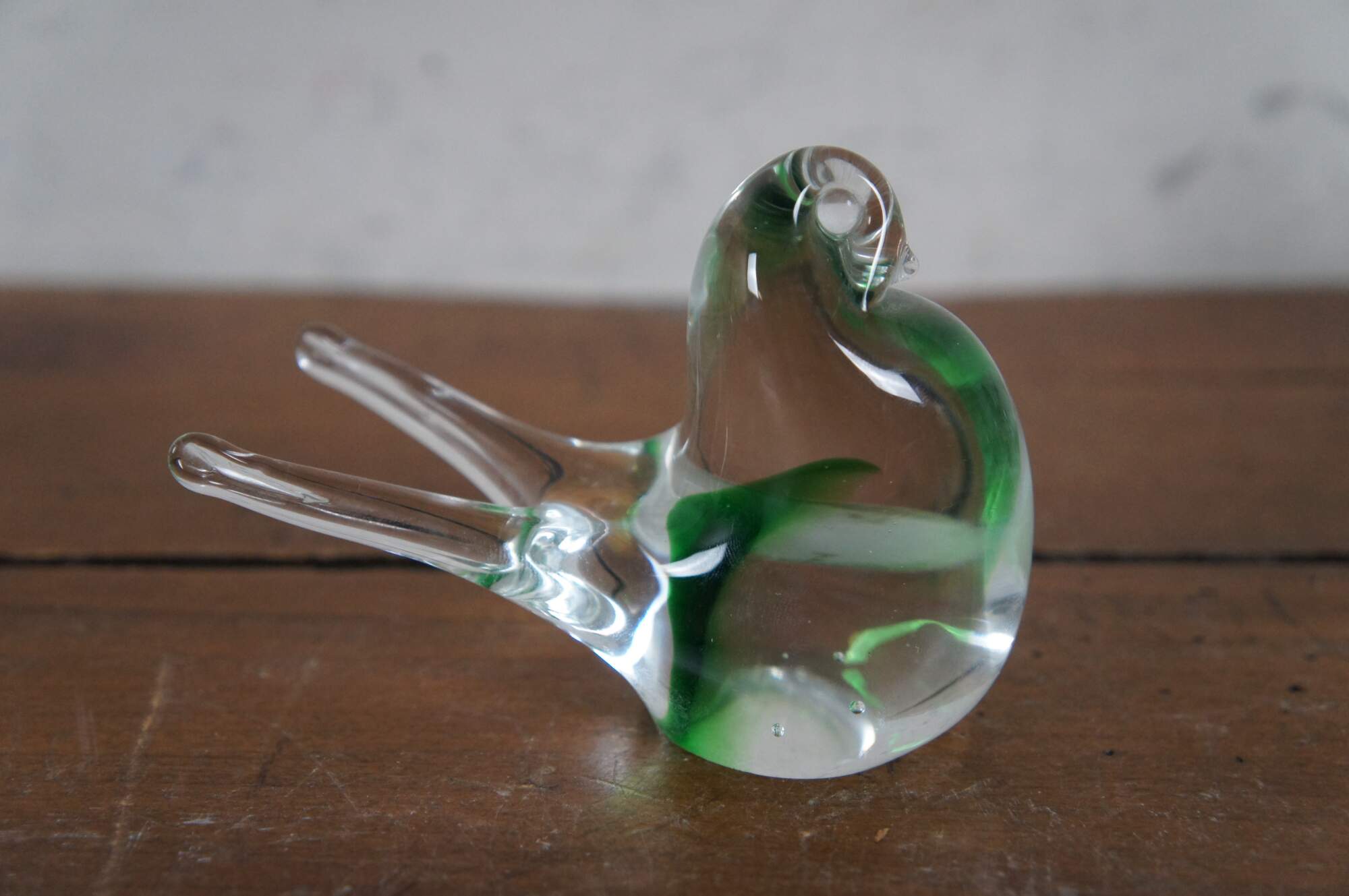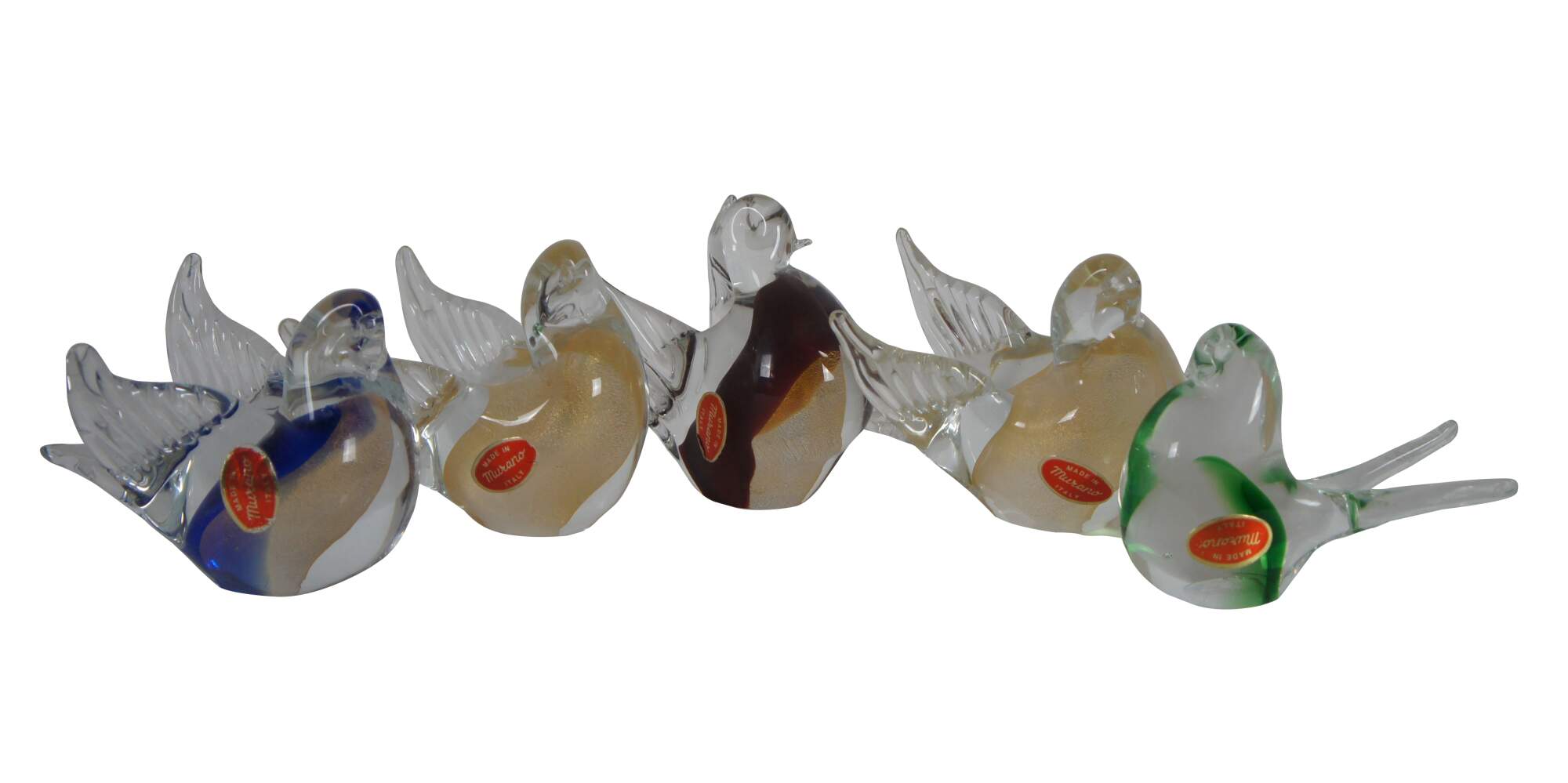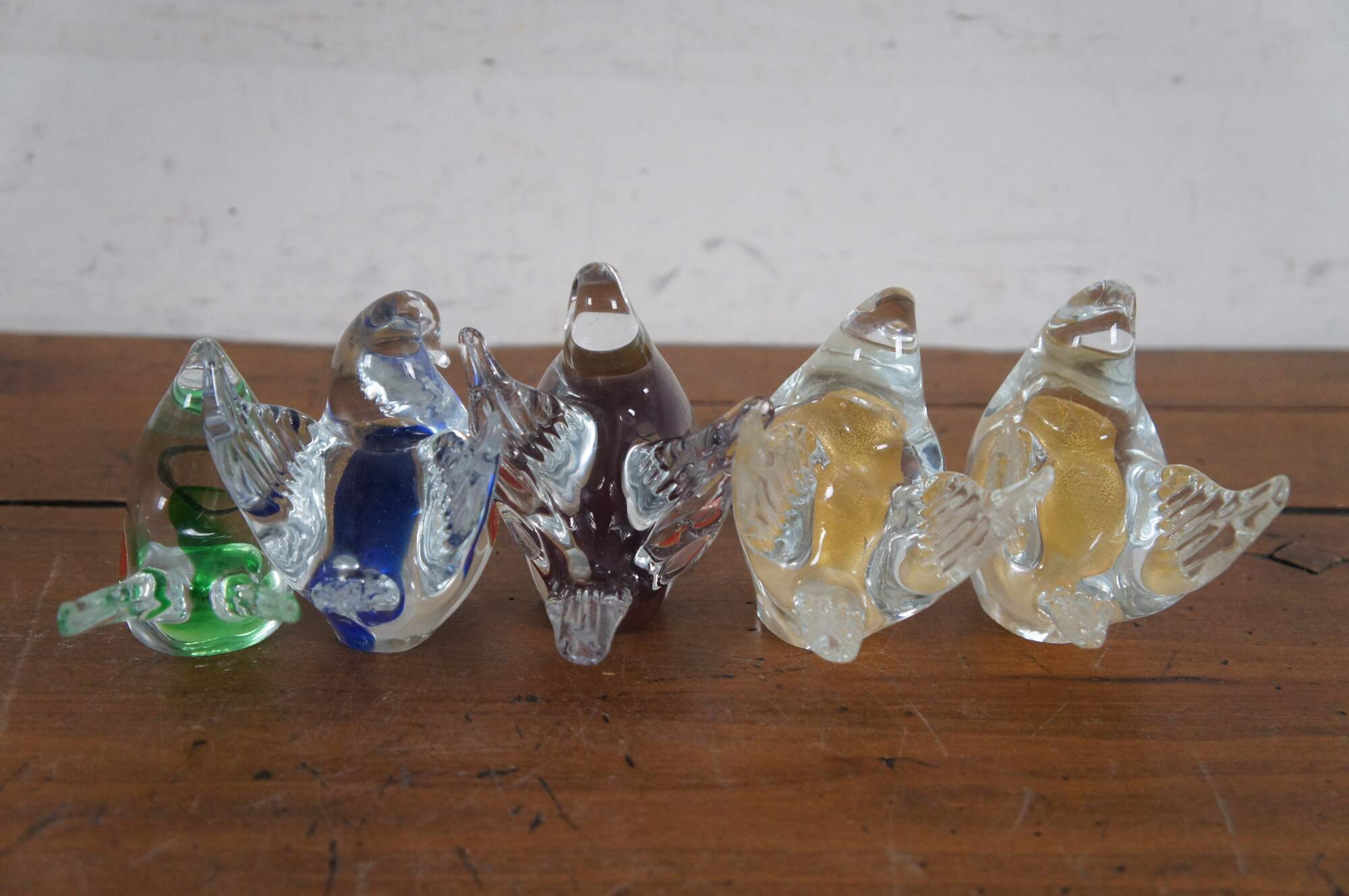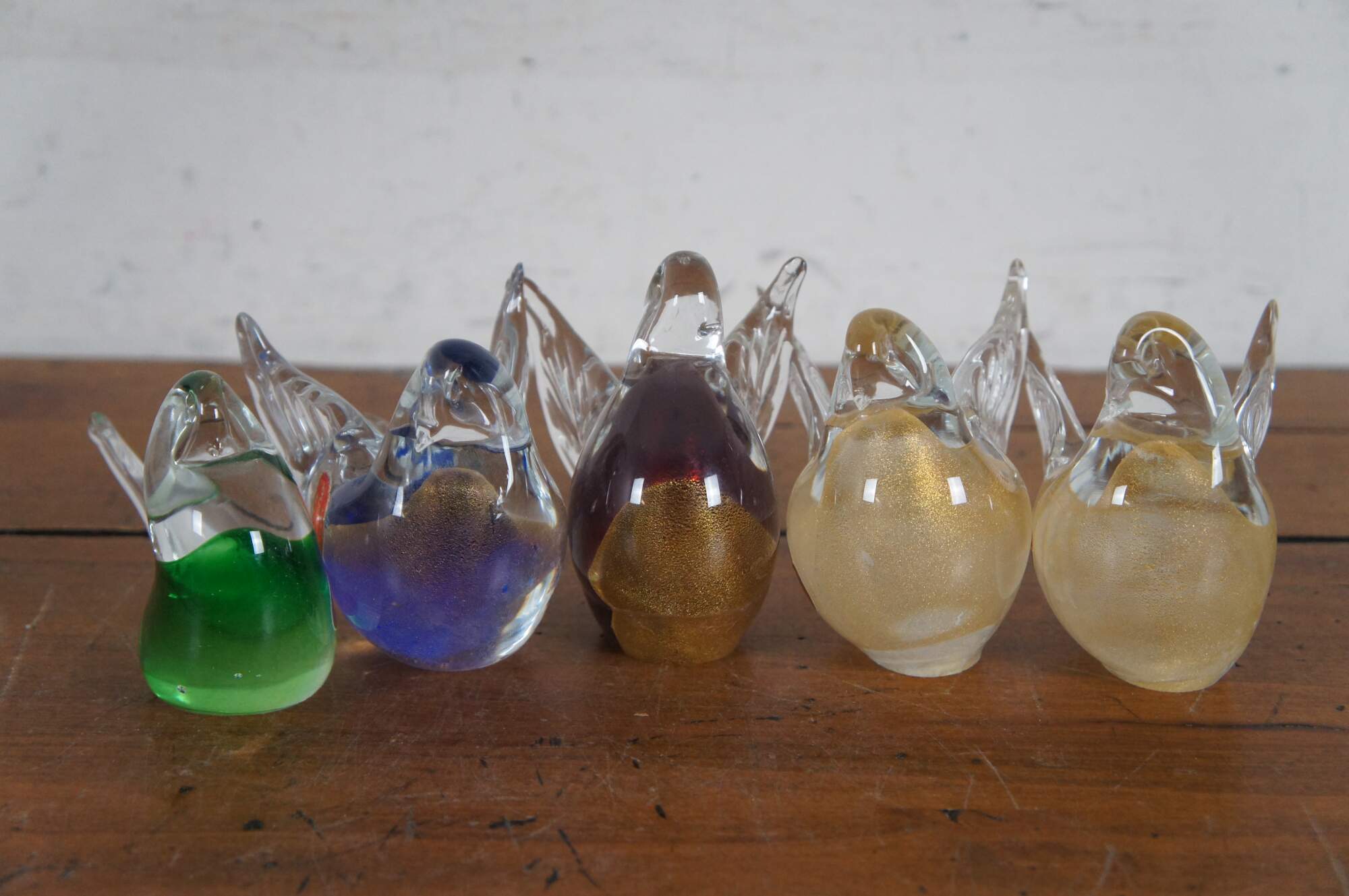 Lot of 5 mid to late 20th century hand blown art glass love birds / doves crafted of clear glass injected with an array of colors - two with simply gold dust, one red with gold dust, one blue with gold dust, and one green. Made in Murano, Italy.
