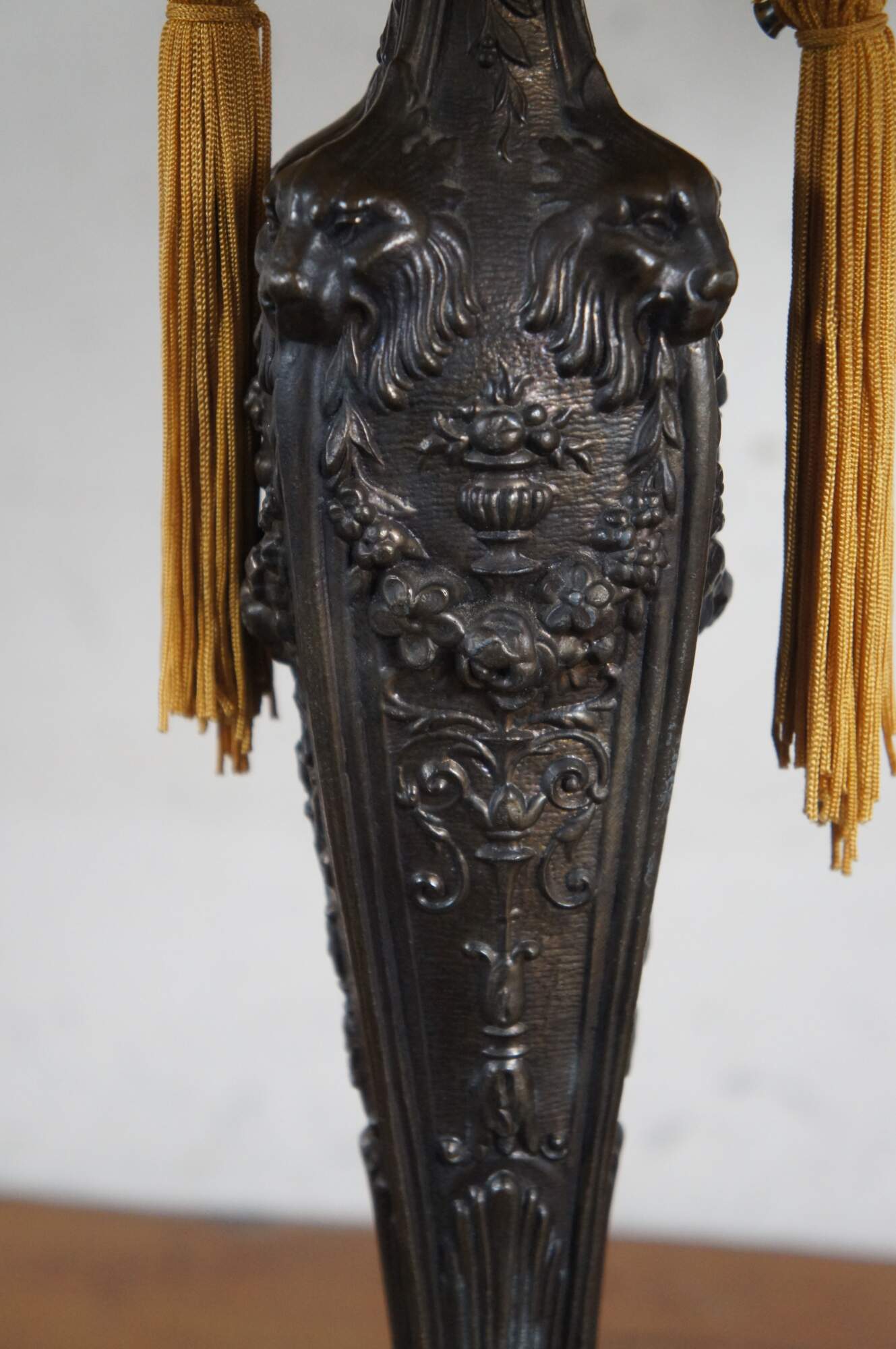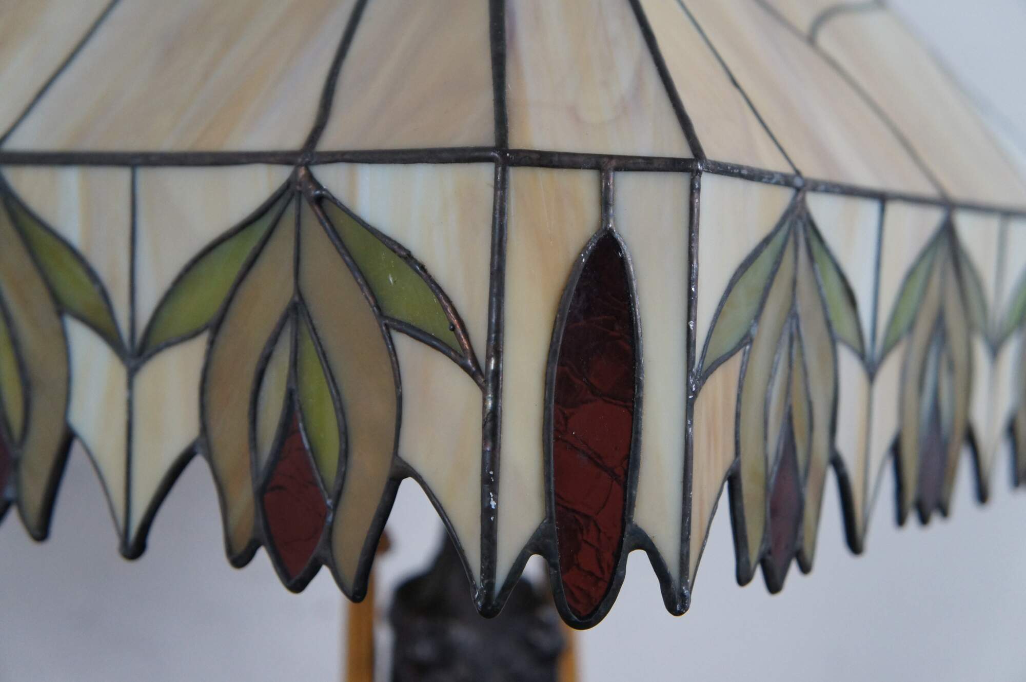 Tiffany style parlor lamp featuring a cast metal base decorated with lion's heads, flowers and vases, and a squared off Art Nouveau style shade featuring a simple edge design of drooping tulips or rosebuds.