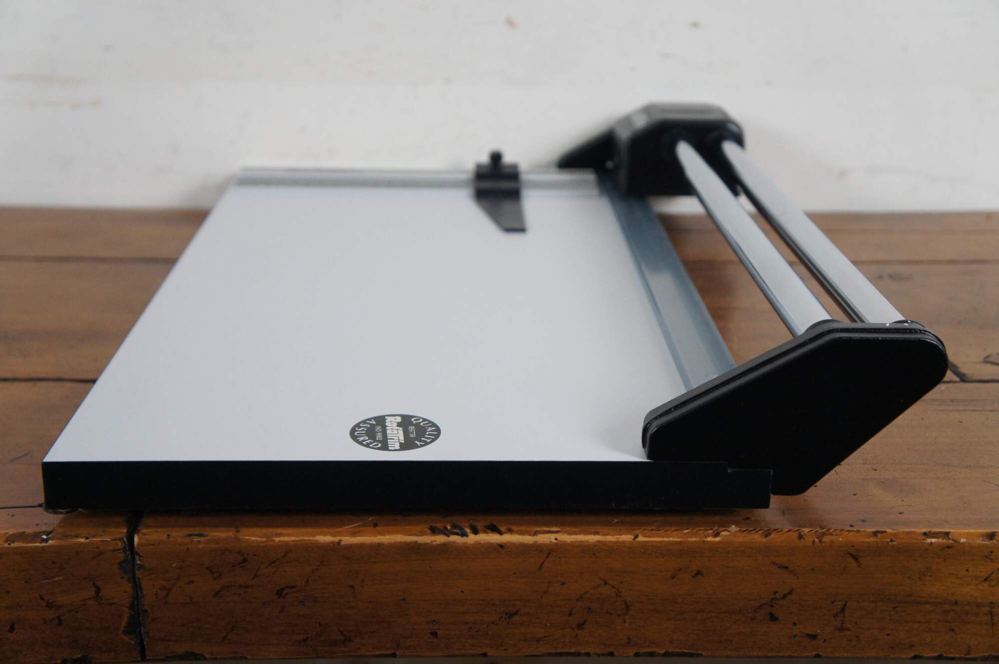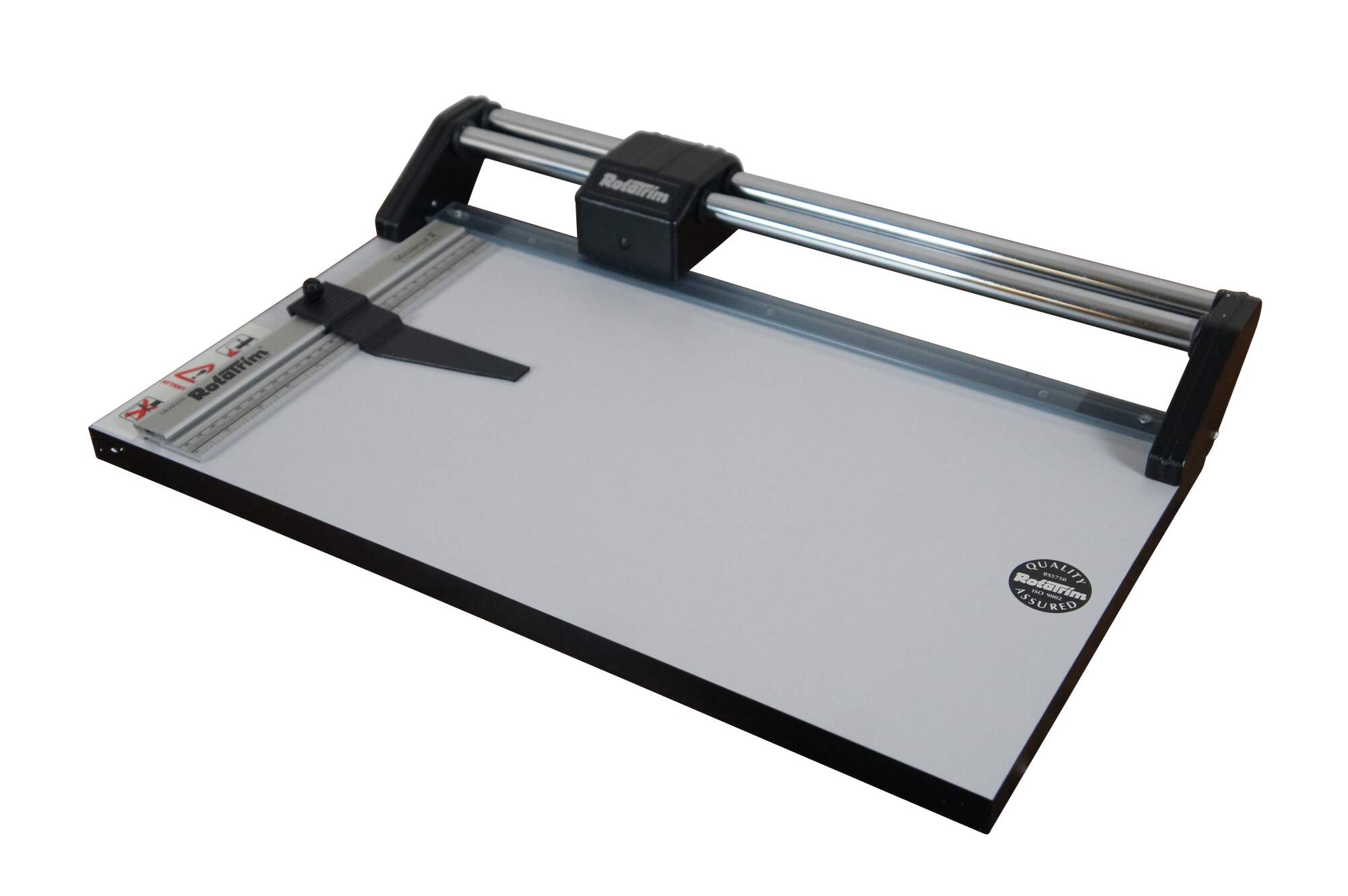 1996 Rota Trim Mastercut II rotary guillotine paper cutter / trimmer with self-sharpening tungsten steel cutting blade. Saunders Catalog No. 890-015. Blade marked UF-11-95. Made in England.