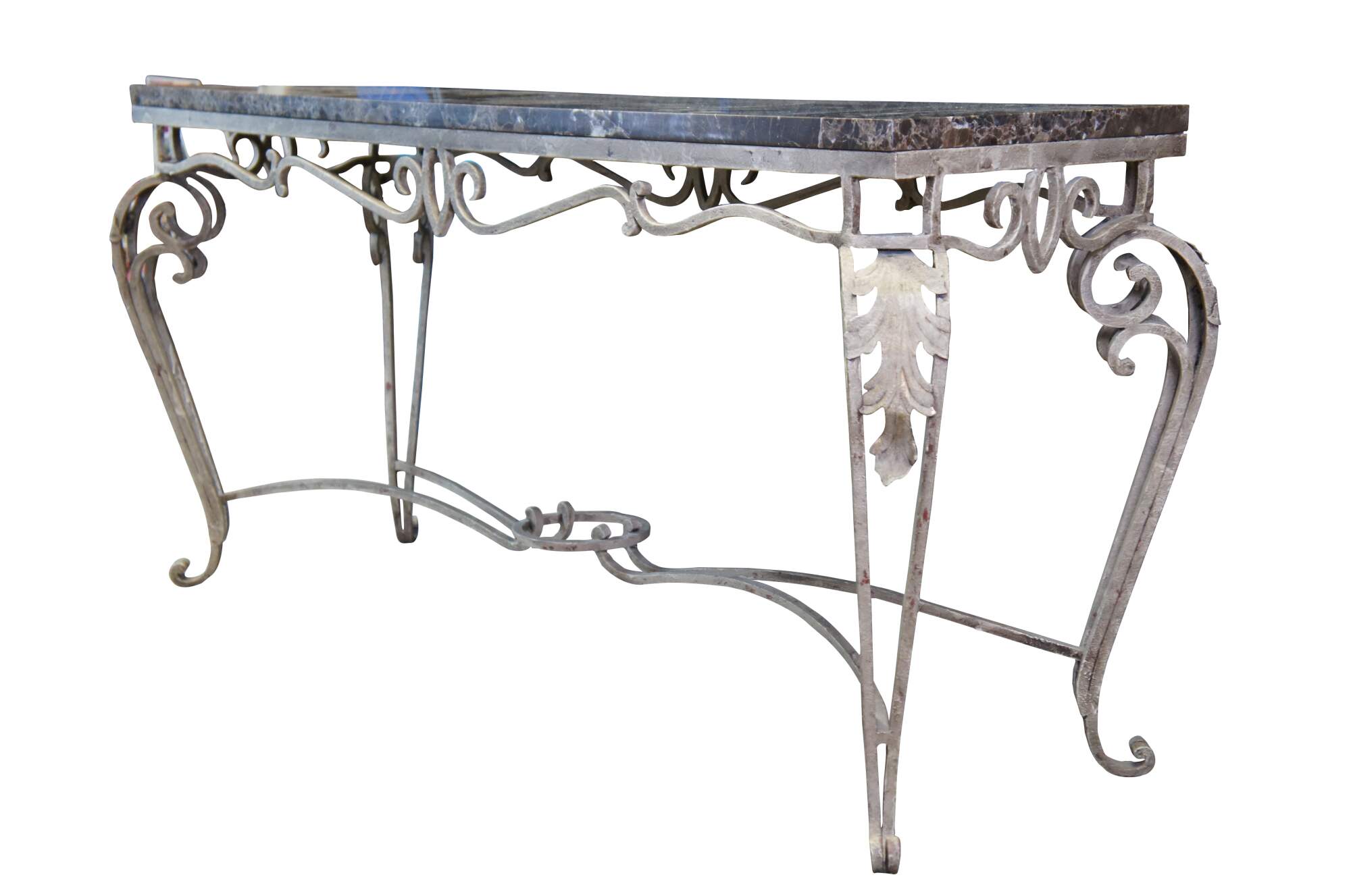 A lovely scrolled iron console table with Spanish marble top. Features a rectangular form with serpentine skirt and cabriole legs with acanthus design along the knee.