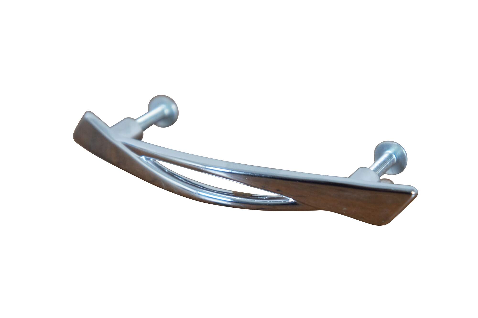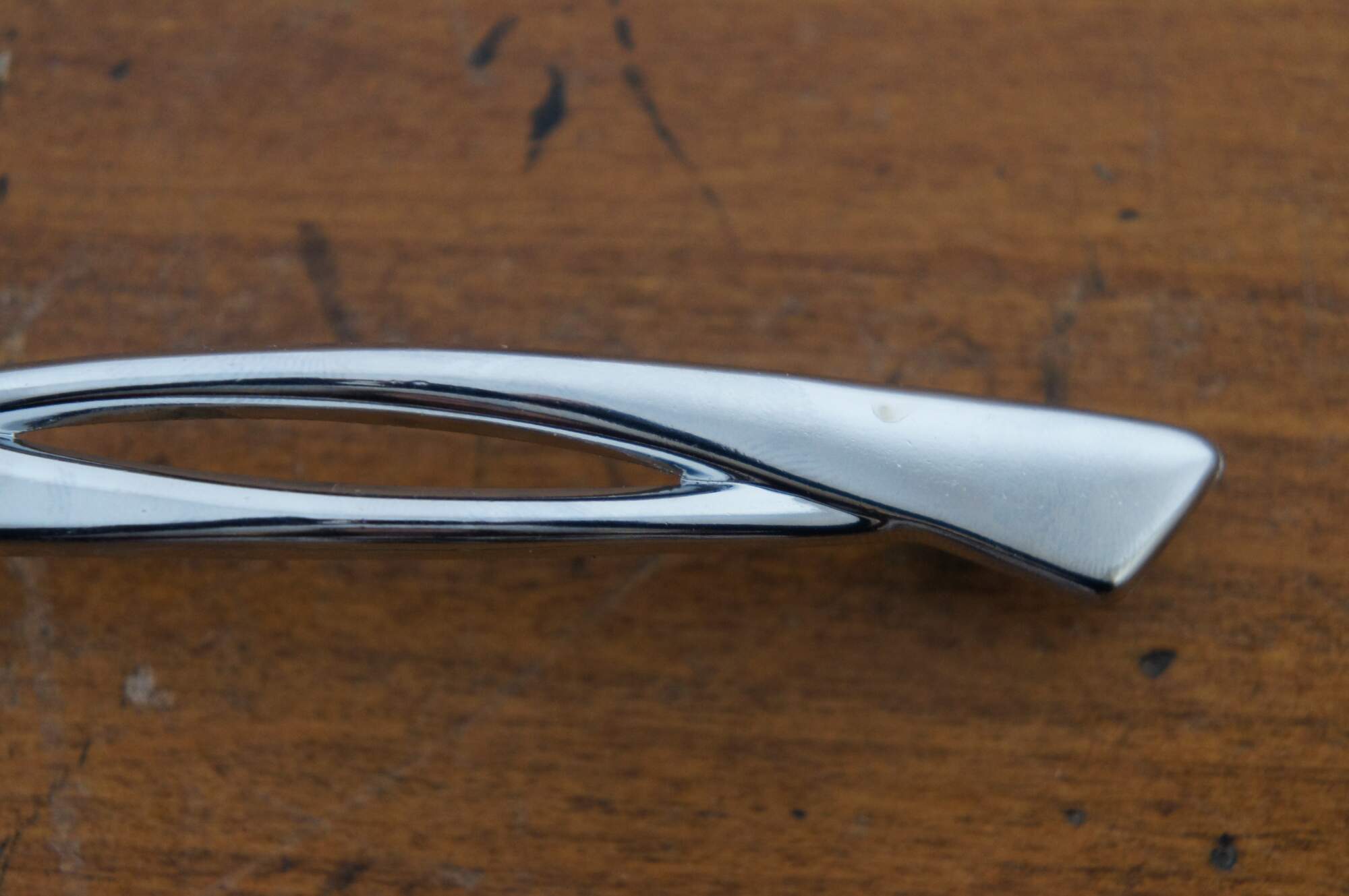 4 Available - Mid to late 20th century old-stock die cast metal drawer / cabinet pulls. National Lock Company - Medalist, item number C278-26 Pull, Galaxie, Bright Chrome finish. Mid century modern styling. Hole Centers - 3